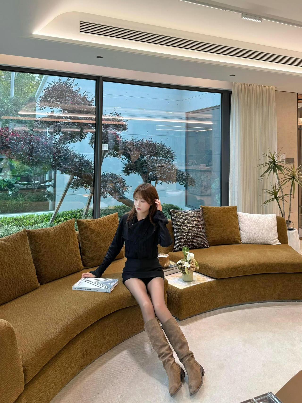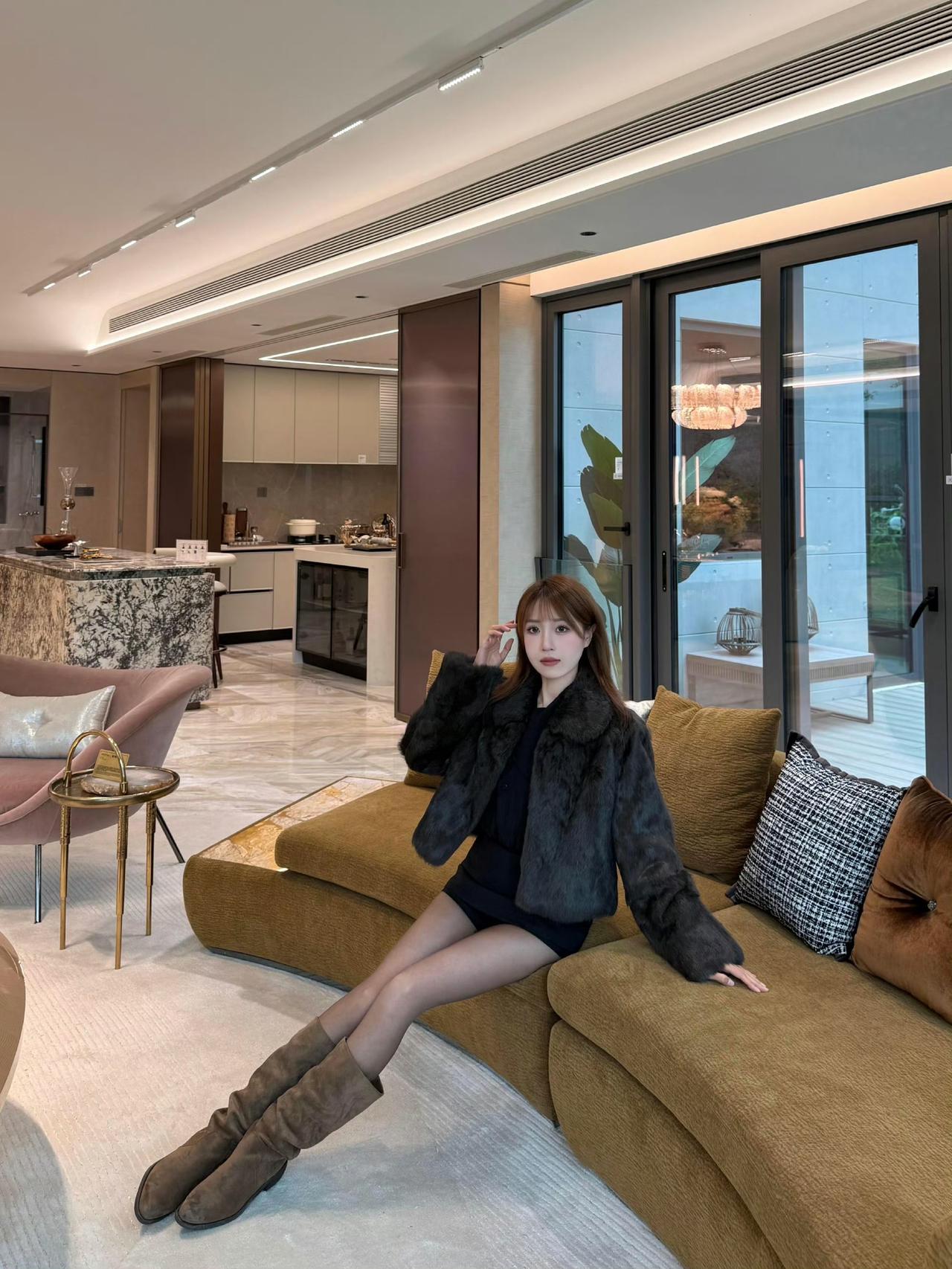 深棕色皮草外套质感奢华,蓬松的毛领与毛绒材质为整体注入了温暖贵气的气息,短款版型优化身材比例;内搭黑色长袖衬衫和短裙,短裙版型展现出修长的腿部线条,与皮草形成风格对比,凸显层次感。 搭配上,棕色长筒靴复古又具时尚感,与皮草外套的风格和谐统一,提升了造型的复古韵味与冬日氛围感。既展现出奢华保暖的贵气形象,又透出性感时尚的冬日魅力。短款皮草穿搭