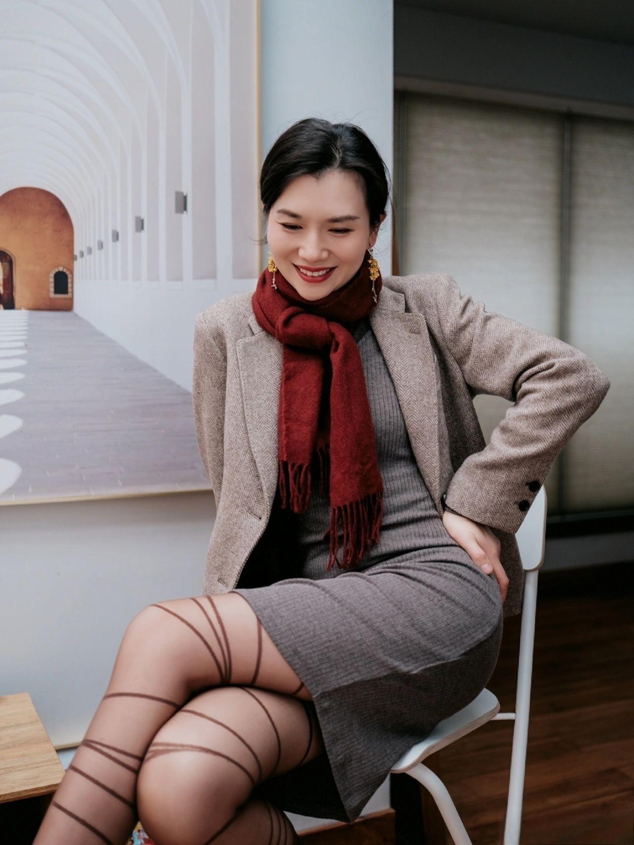 浅棕色西装外套版型大气,宽松的剪裁营造出随性的职场气场,与内搭的灰色针织连衣裙形成层次搭配,为整体造型注入了干练的气质;灰色针织连衣裙简约修身,凸显出曼妙身形,中长款式优雅得体。 搭配上,棕色乐福鞋经典又具复古感,提升了造型的复古韵味。金色耳环与项链等配饰,提升了造型的精致度与高级感,丰富了视觉效果。能充分展现穿着者职场干练又不失复古时尚的独特魅力。灰色西装穿搭 灰西装搭配