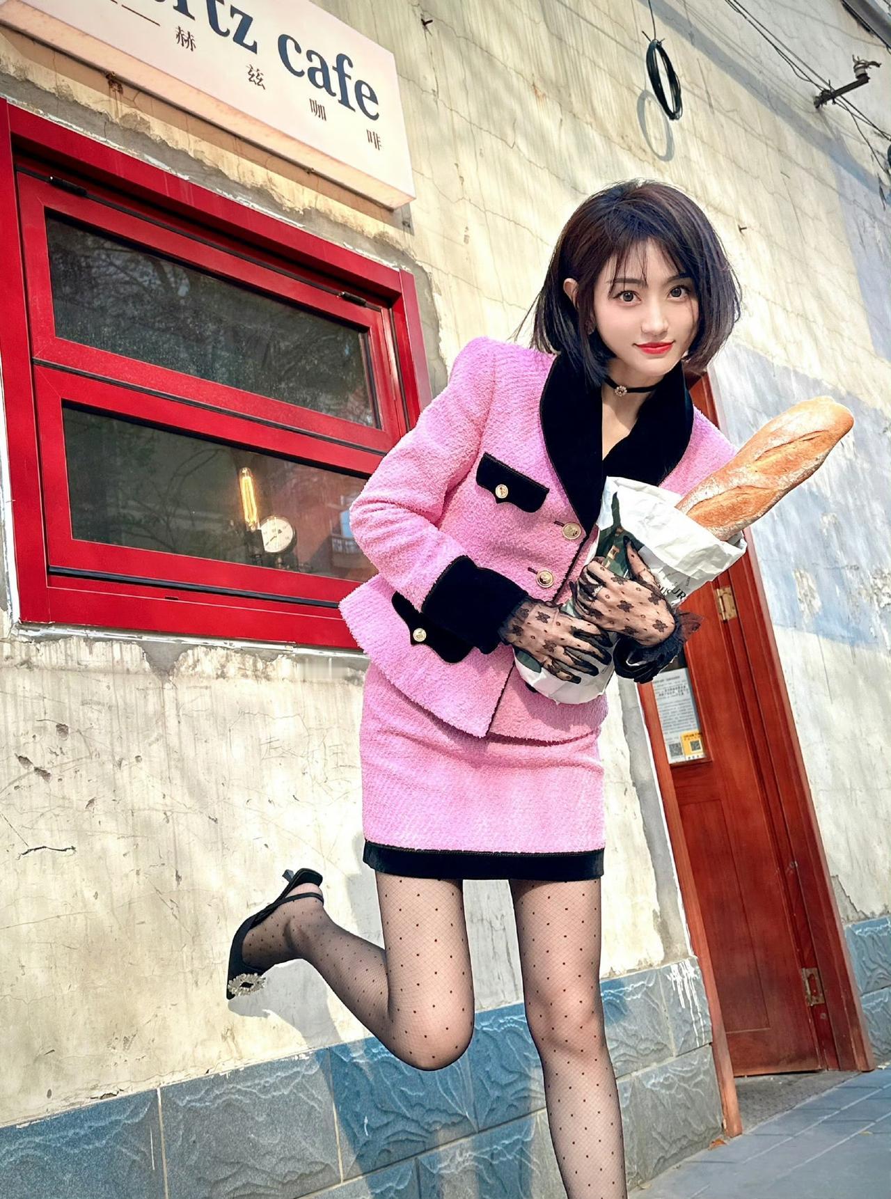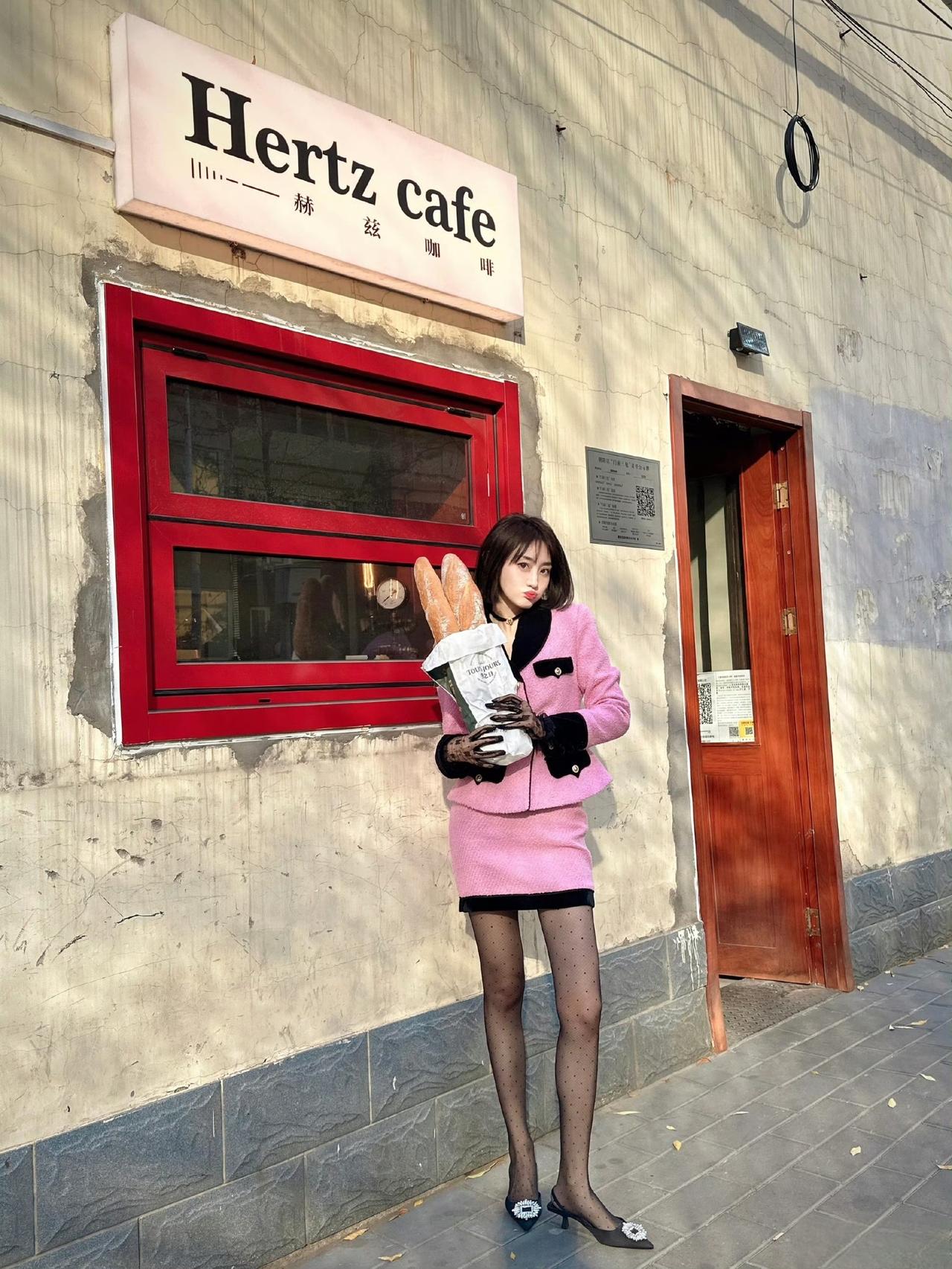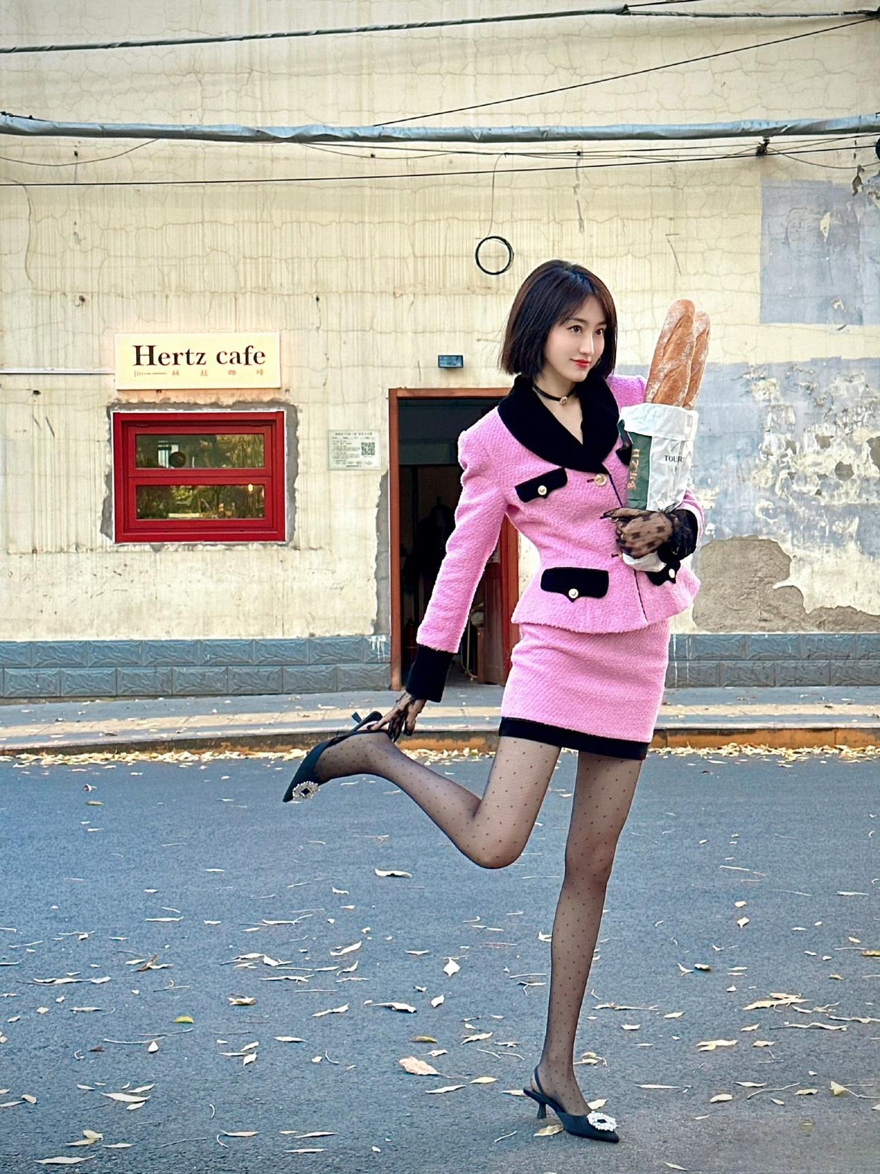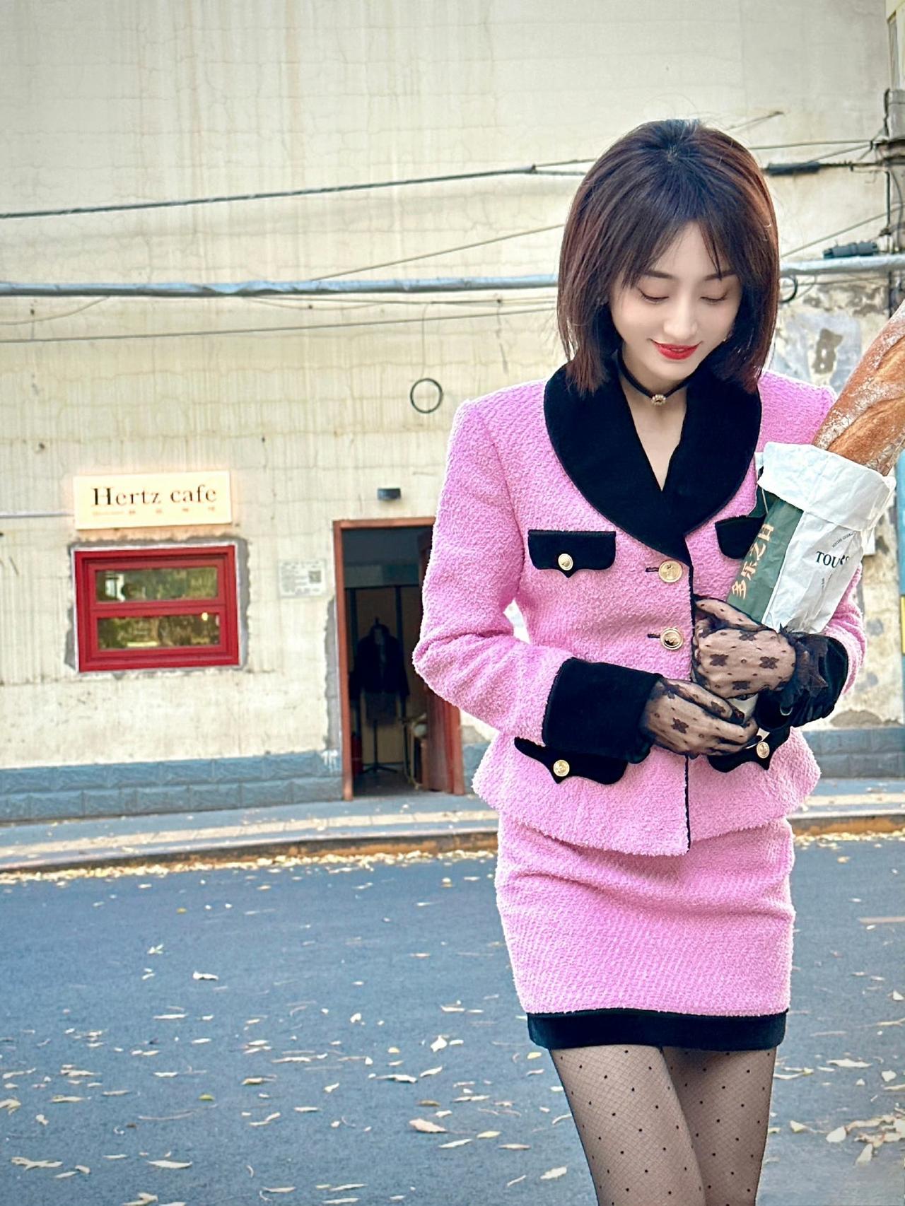 这套穿搭将甜酷名媛风与复古法式感巧妙融合,风格吸睛又具少女感。粉色粗花呢套装充满甜美元素,黑色拼接的领口、口袋与下摆设计,为整体注入了酷飒的撞色感,经典的“小香风”版型尽显名媛的精致格调。 黑色带钻高跟鞋精致吸睛,鞋头的花朵装饰为造型注入少女感,提升了整体的时尚度。能充分展现穿着者甜酷名媛又不失复古法式的独特魅力。穿搭小香风套装 粗花呢穿搭 粉色法式套装
