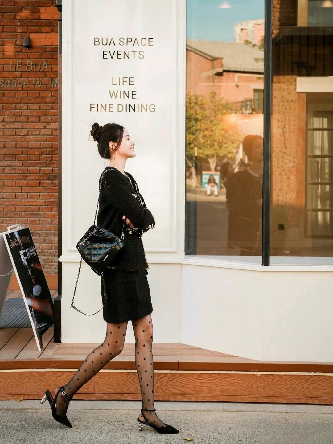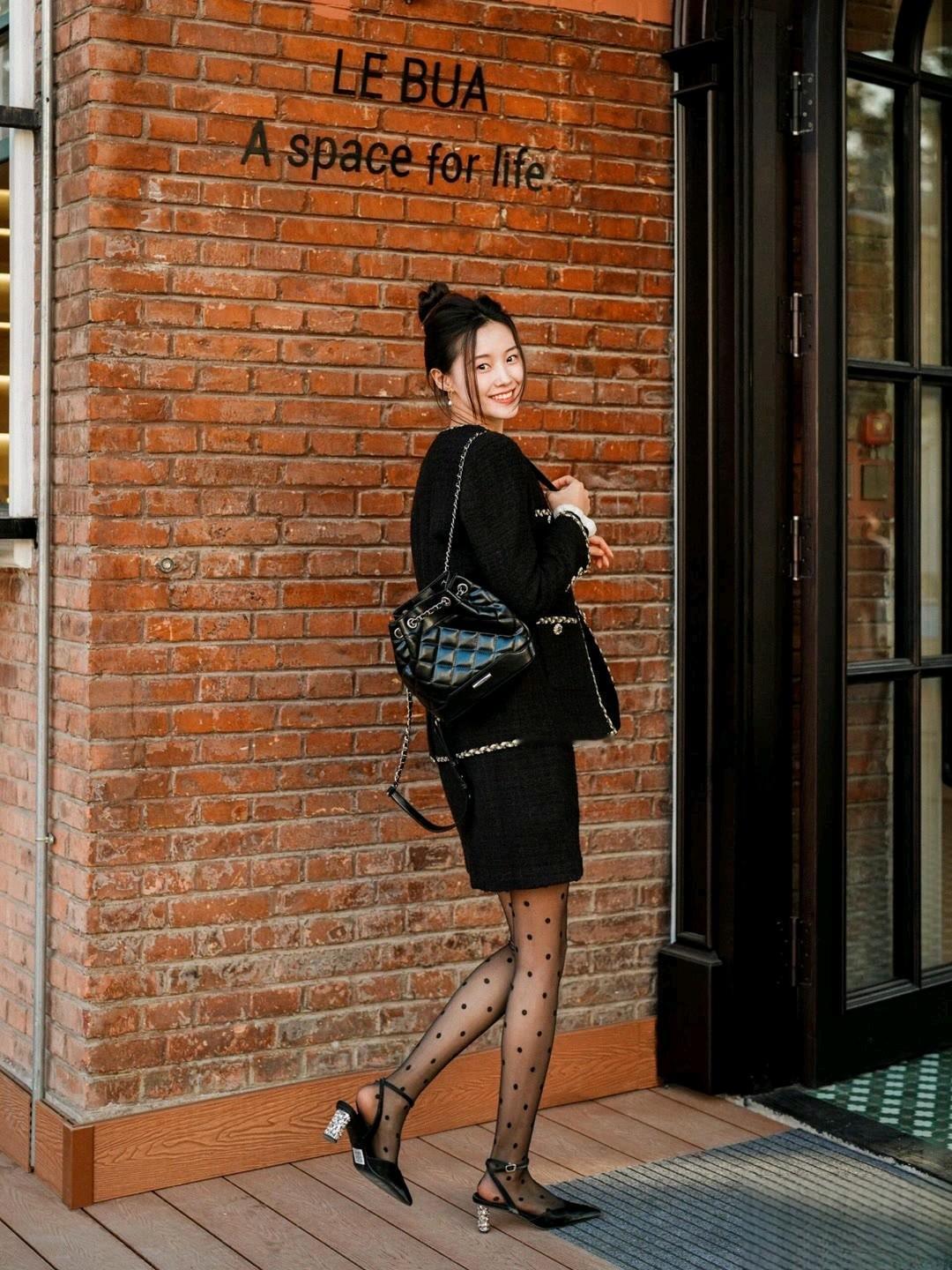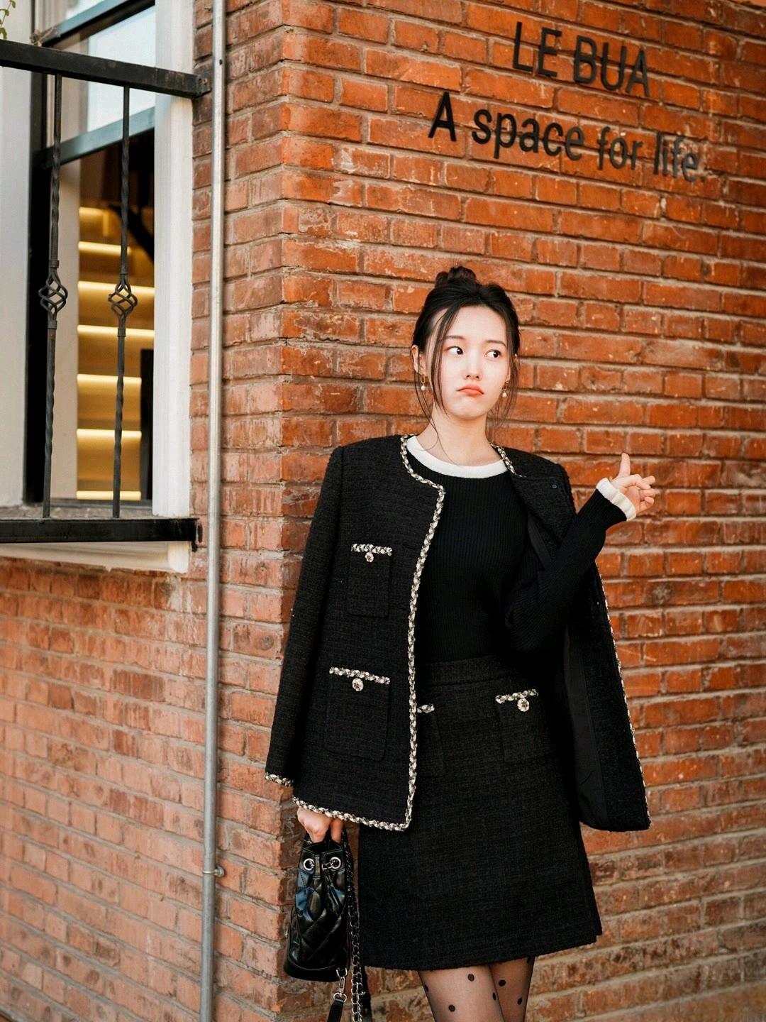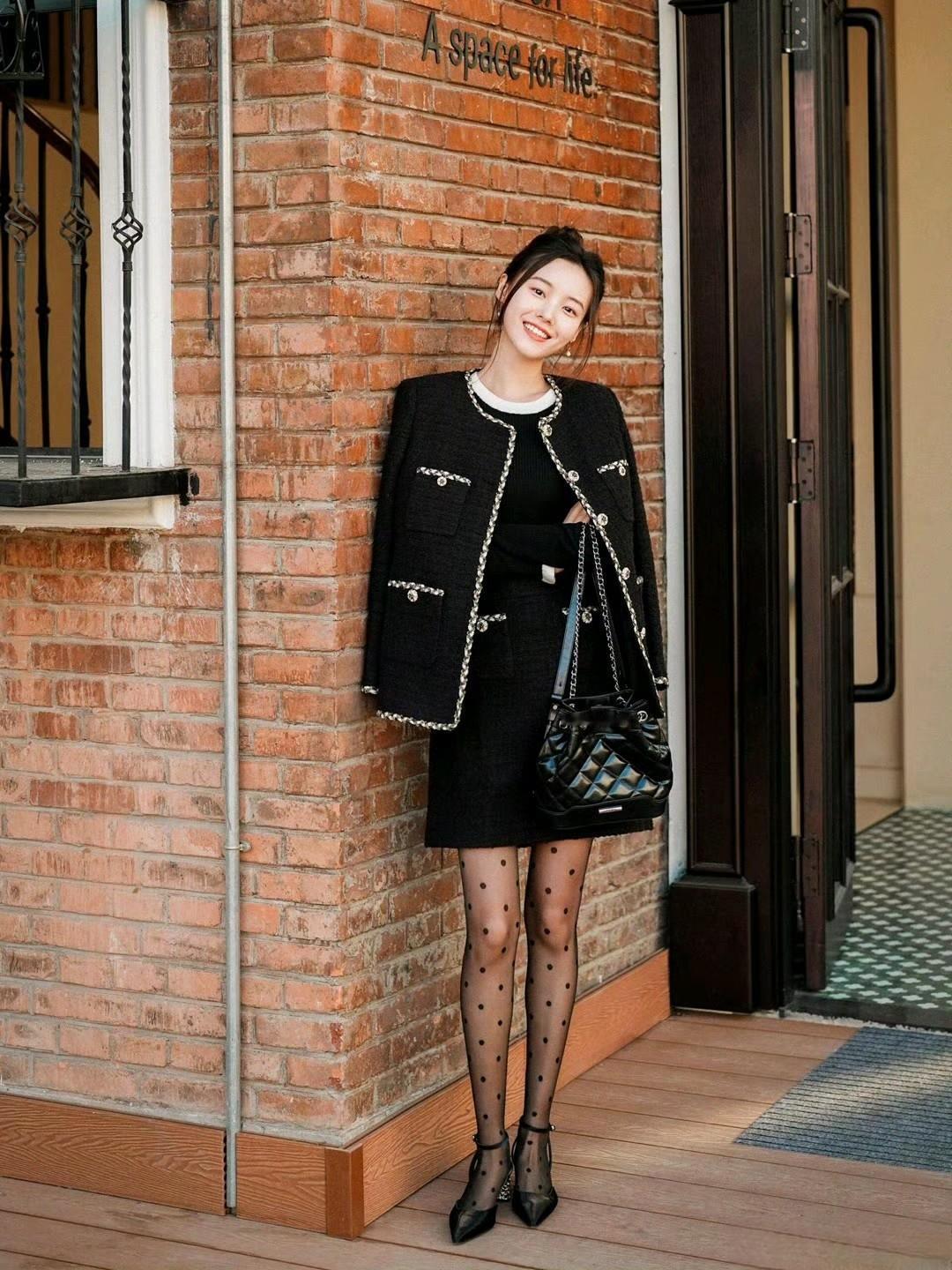 这套穿搭将经典名媛风与甜美复古感深度融合,尽显精致优雅的轻奢气质。黑色粗花呢套装质感高级,外套边缘的金属链条装饰、珍珠扣设计,是经典的“小香风”元素,尽显名媛的优雅格调;内搭黑色连衣裙简约修身,与外套形成层次搭配,凸显利落感。 搭配黑色尖头高跟鞋,既拉长腿部线条,又强化了复古韵味;黑色菱格纹手提包经典大气,与套装的奢华感相得益彰,是造型的点睛之笔。高端小香风穿搭 粗花呢穿搭 高级感名媛穿搭