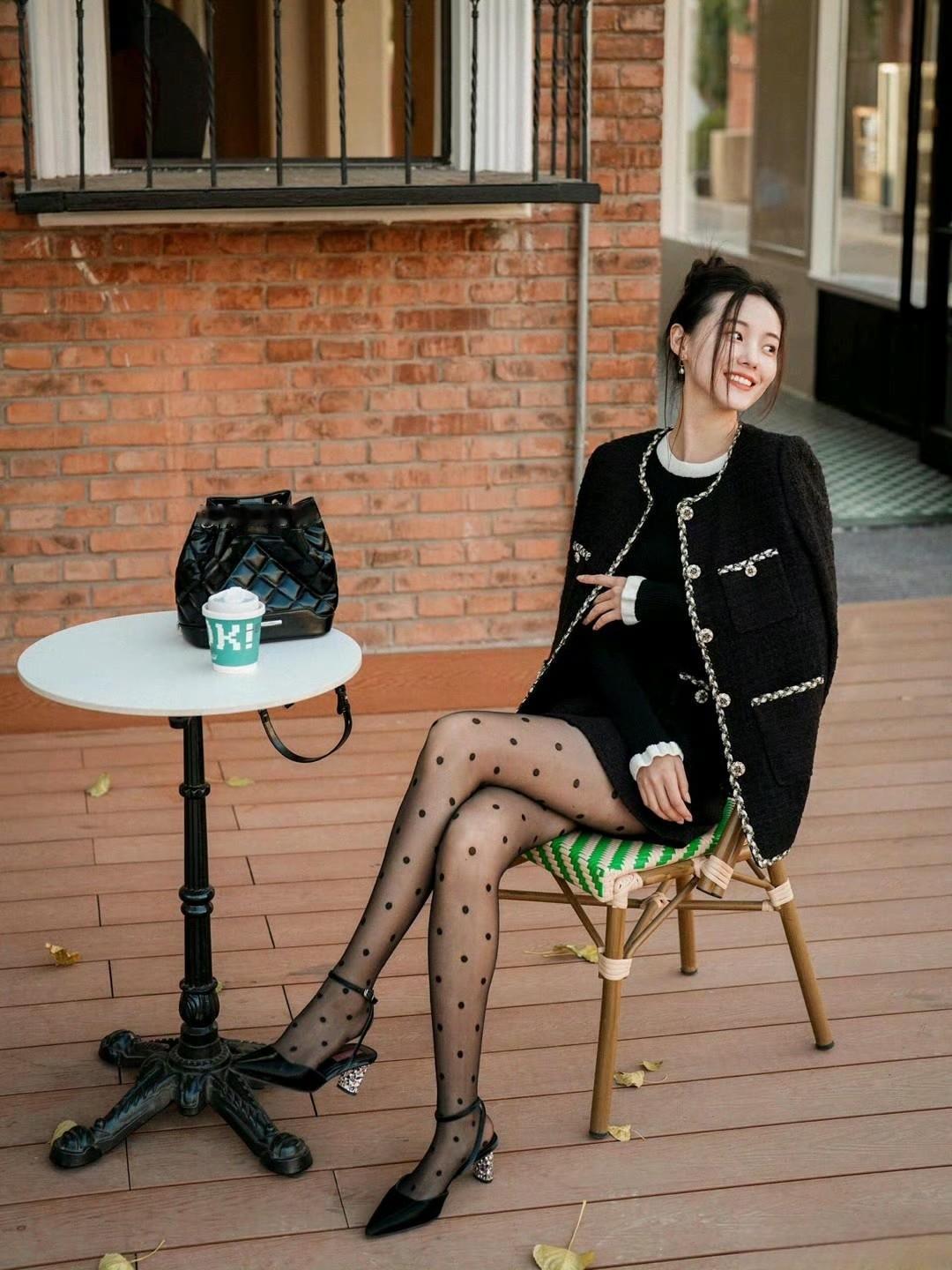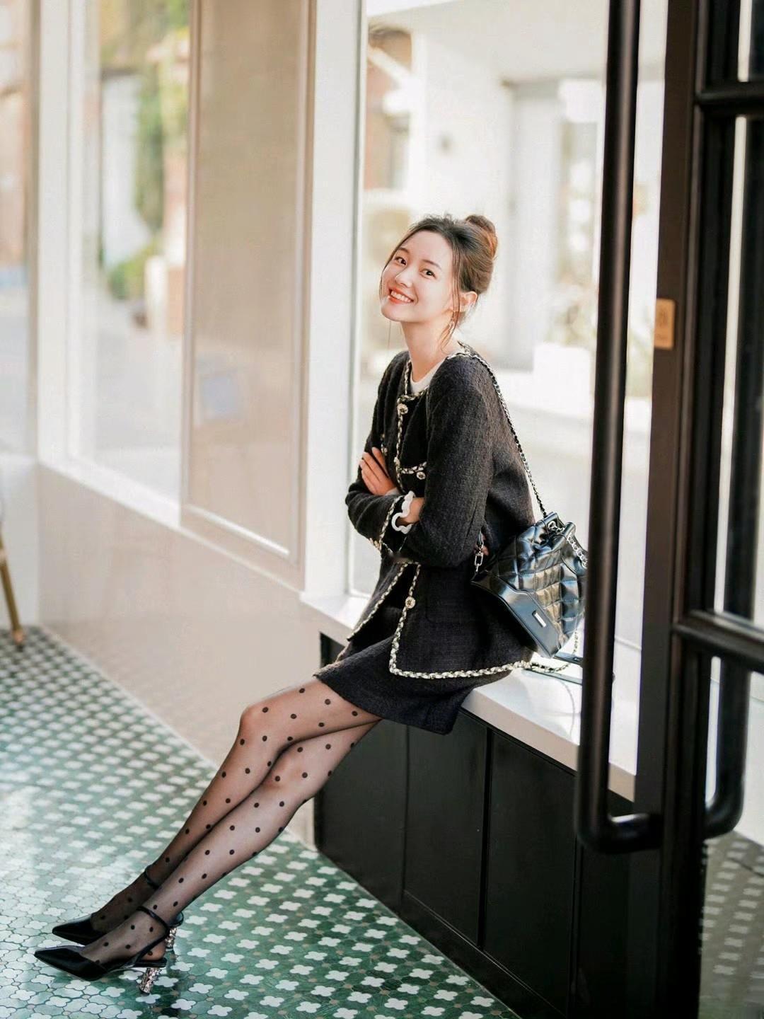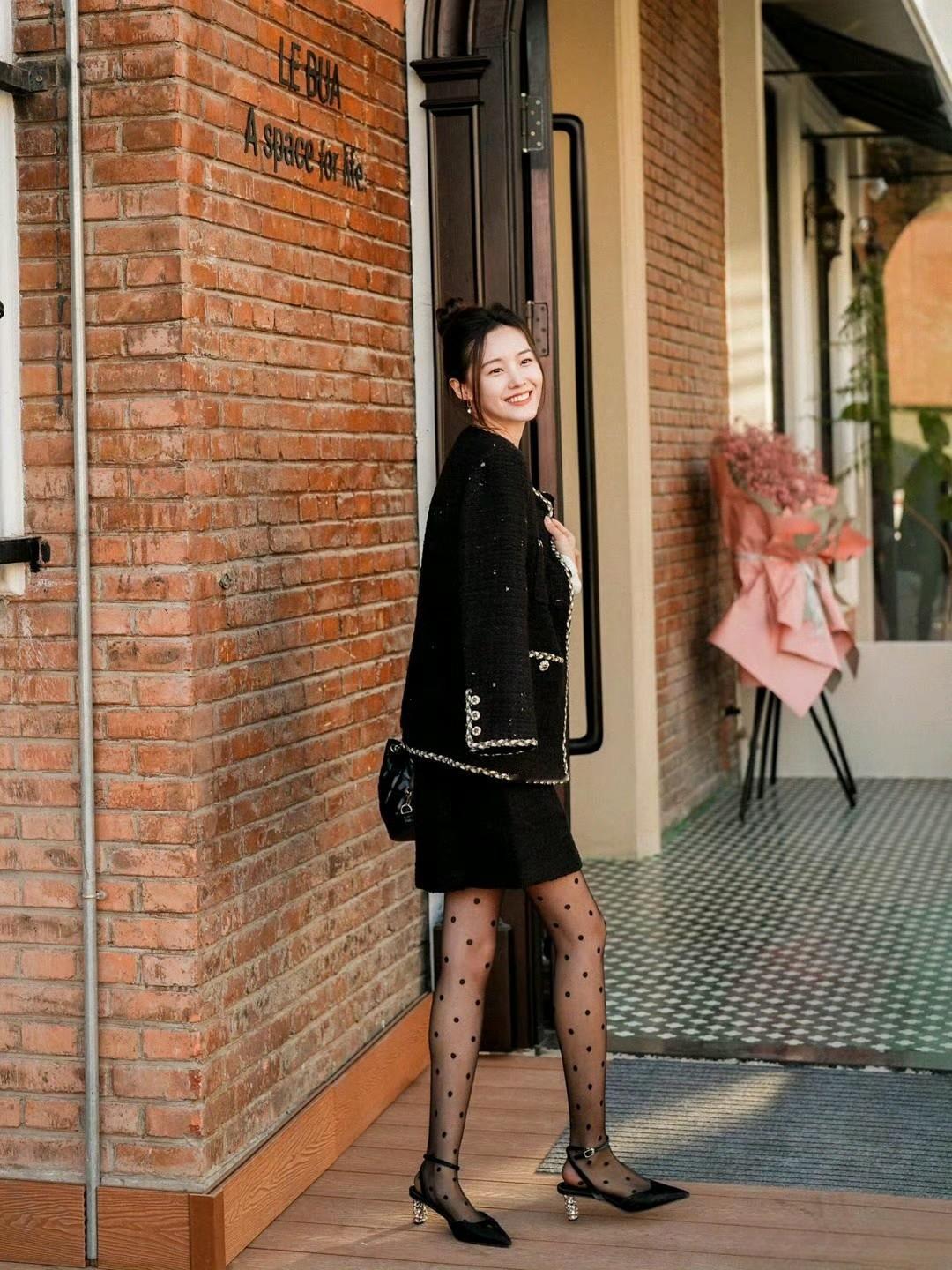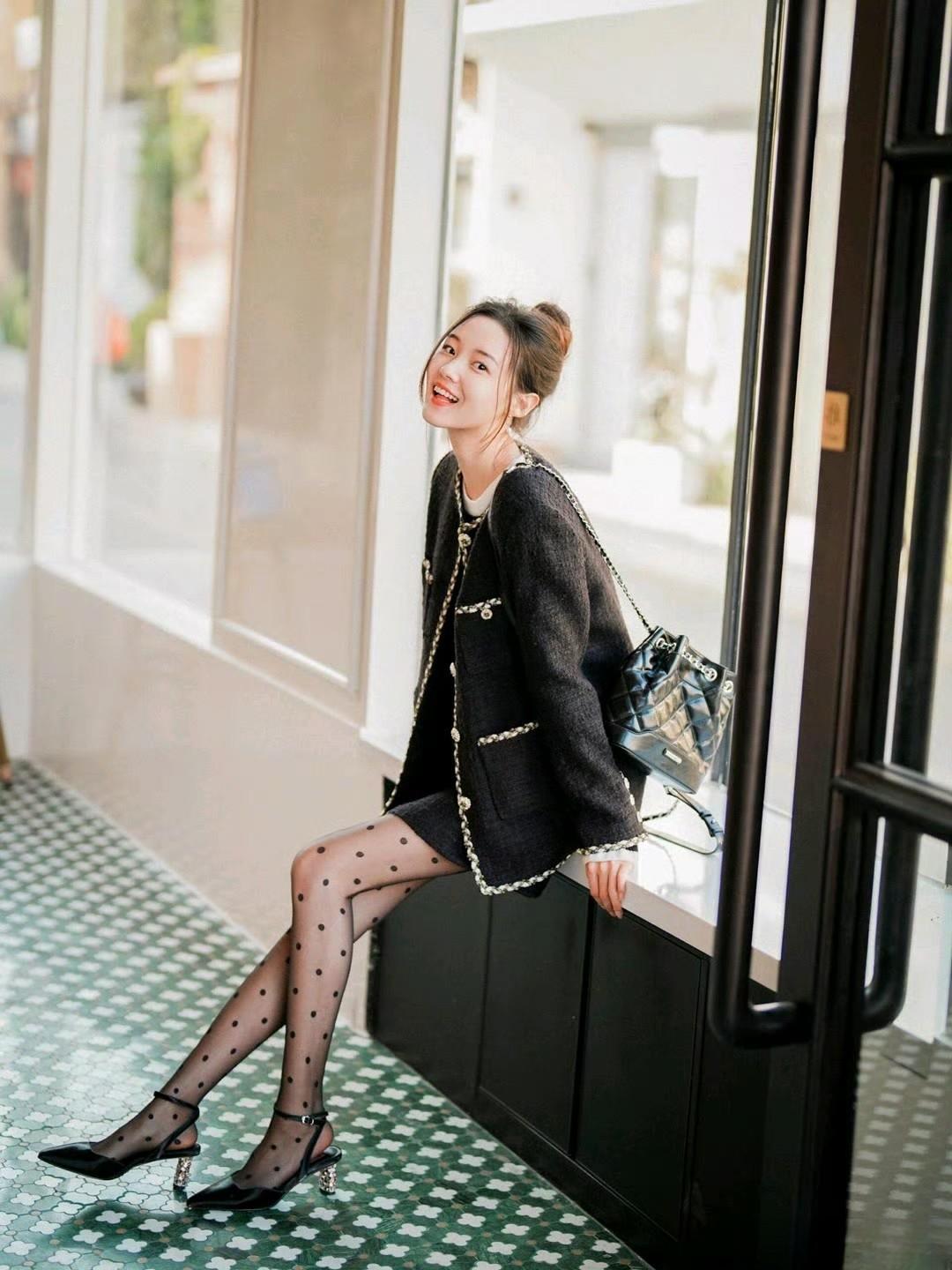 这套穿搭将经典名媛风与甜美复古感深度融合,尽显精致优雅的轻奢气质。黑色粗花呢套装质感高级,外套边缘的金属链条装饰、珍珠扣设计,是经典的“小香风”元素,尽显名媛的优雅格调;内搭黑色连衣裙简约修身,与外套形成层次搭配,凸显利落感。 搭配黑色尖头高跟鞋,既拉长腿部线条,又强化了复古韵味;黑色菱格纹手提包经典大气,与套装的奢华感相得益彰,是造型的点睛之笔。高端小香风穿搭 粗花呢穿搭 高级感名媛穿搭