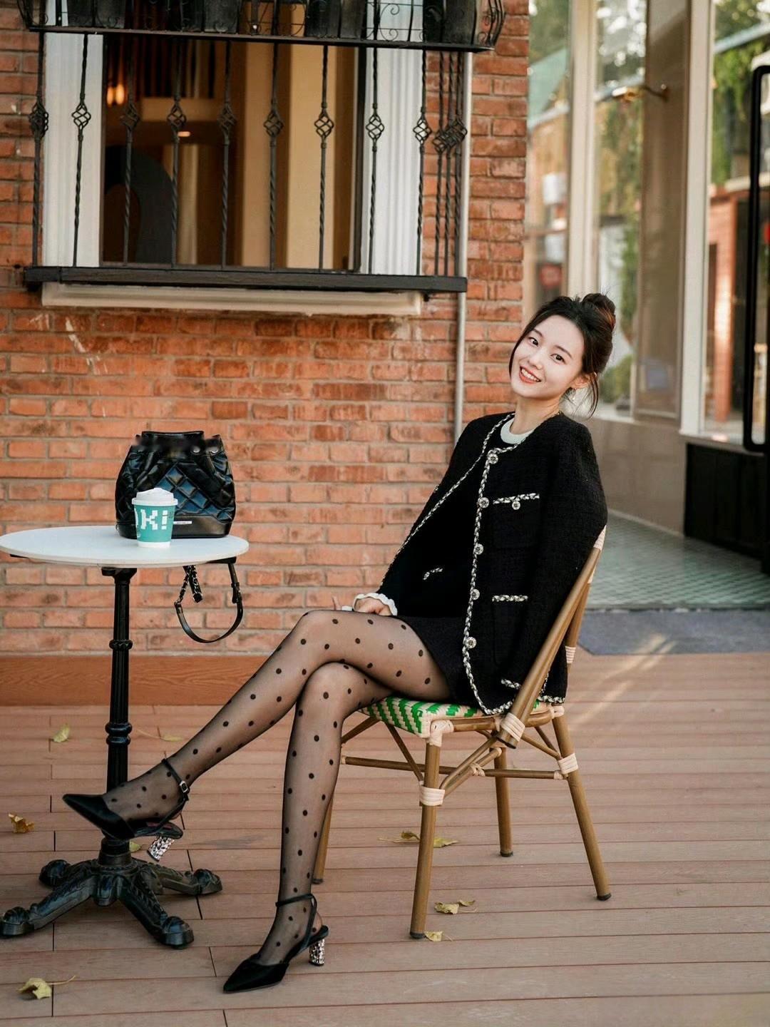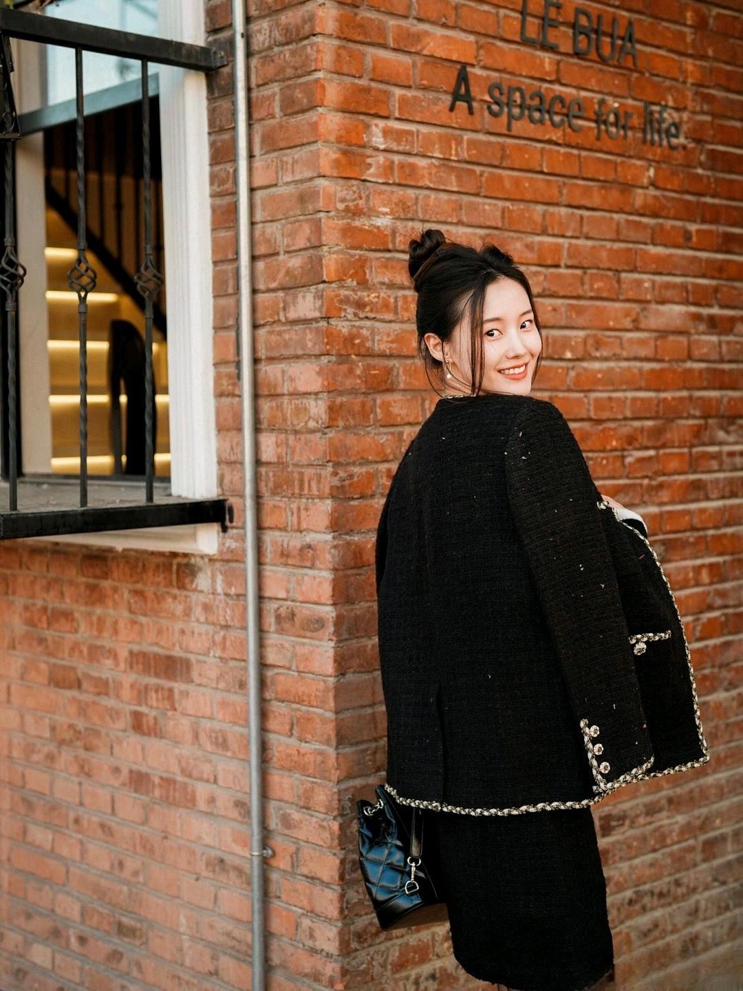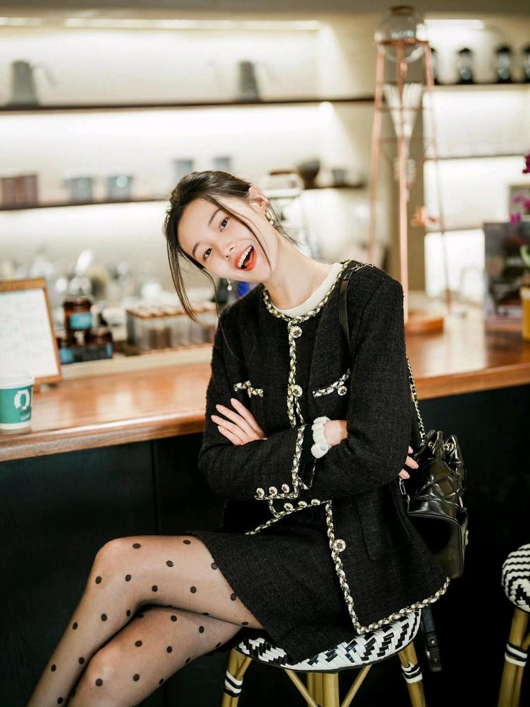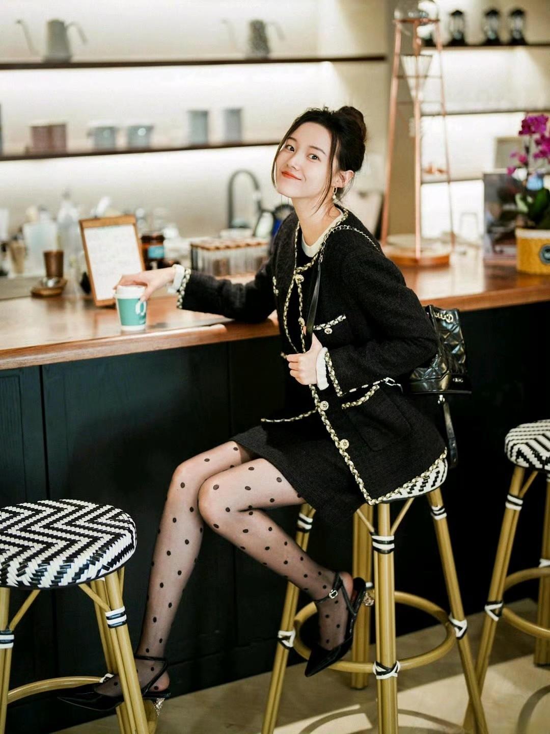 这套穿搭将经典名媛风与甜美复古感深度融合,尽显精致优雅的轻奢气质。黑色粗花呢套装质感高级,外套边缘的金属链条装饰、珍珠扣设计,是经典的“小香风”元素,尽显名媛的优雅格调;内搭黑色连衣裙简约修身,与外套形成层次搭配,凸显利落感。 搭配黑色尖头高跟鞋,既拉长腿部线条,又强化了复古韵味;黑色菱格纹手提包经典大气,与套装的奢华感相得益彰,是造型的点睛之笔。高端小香风穿搭 粗花呢穿搭 高级感名媛穿搭