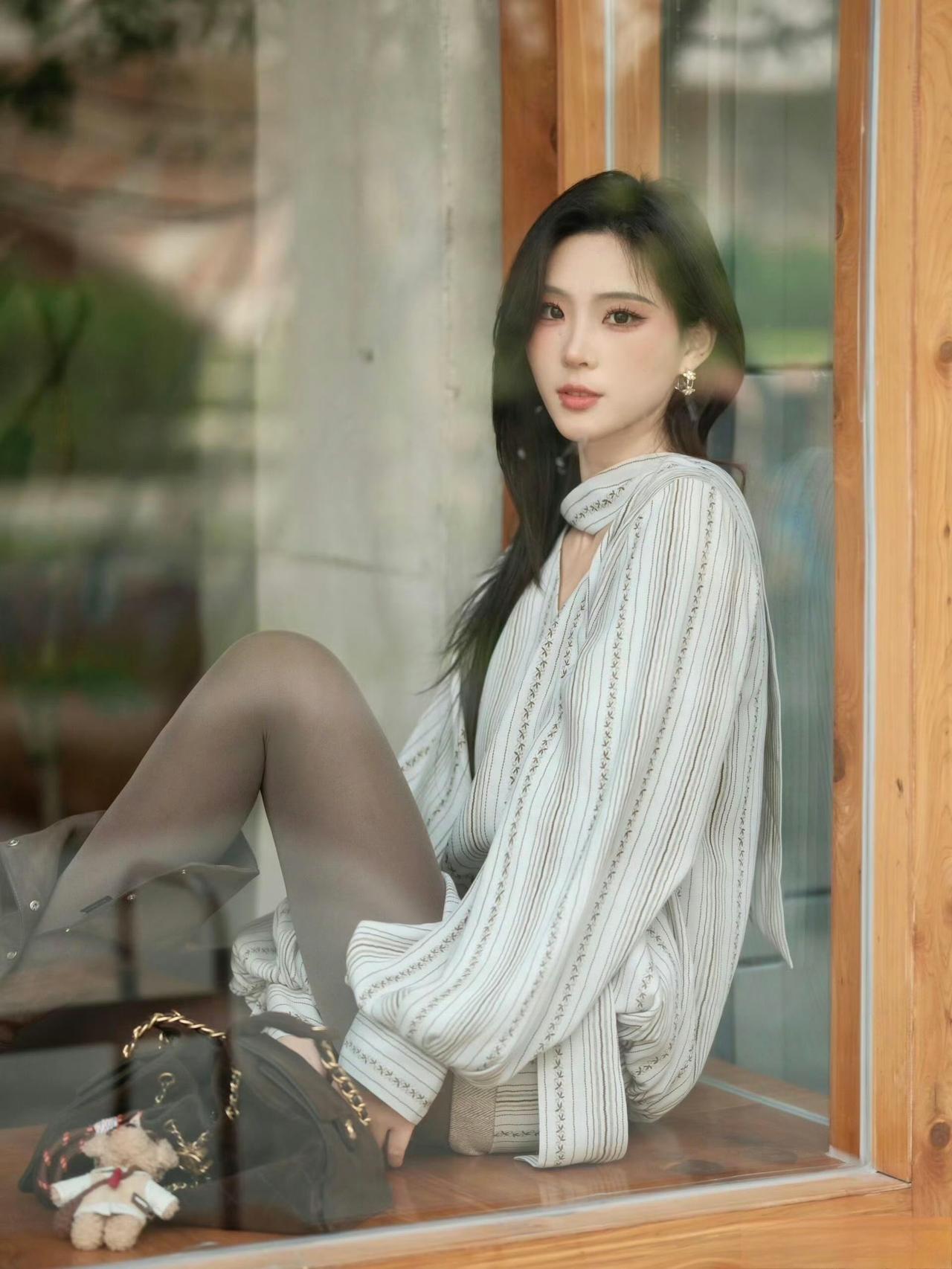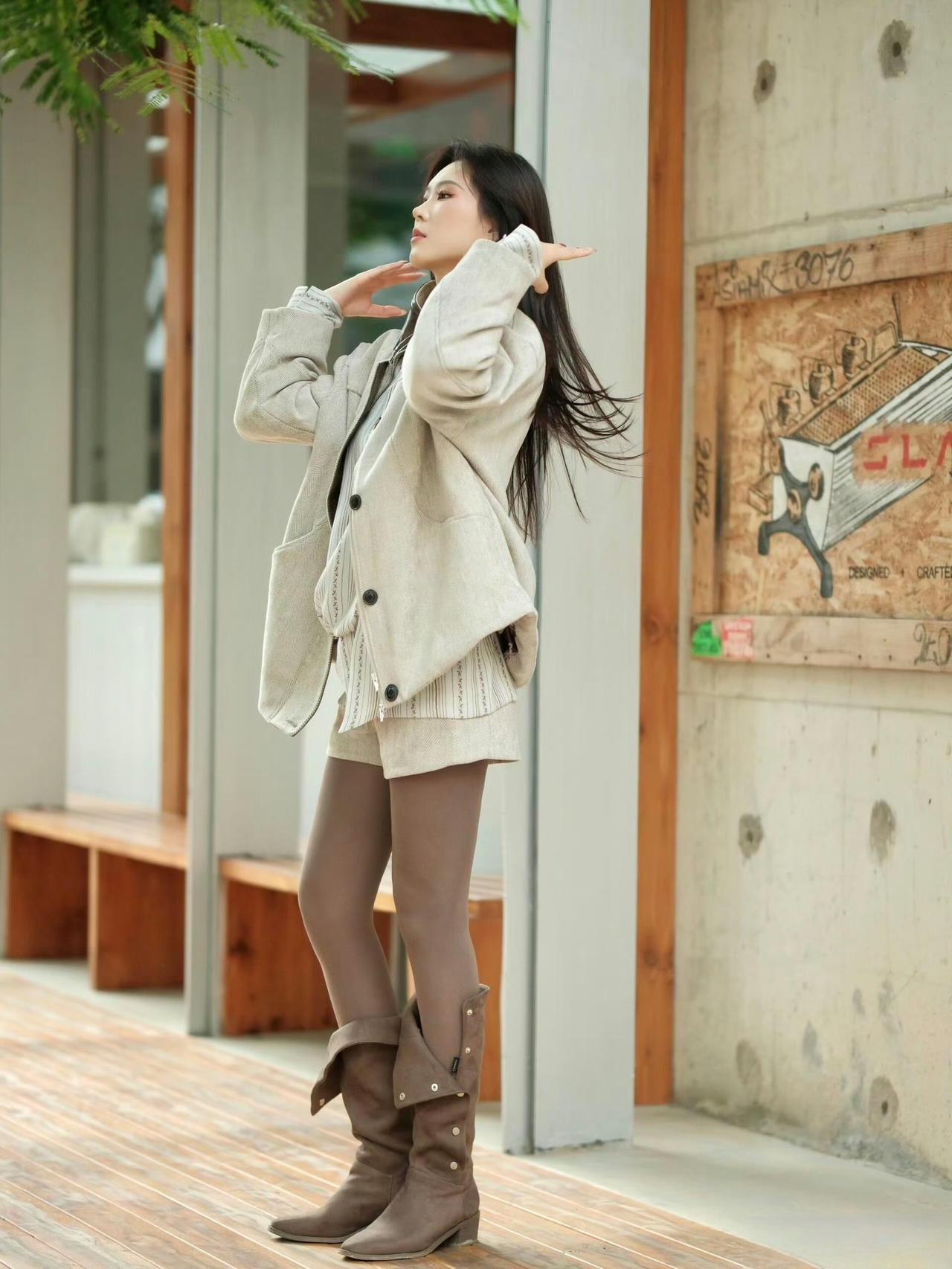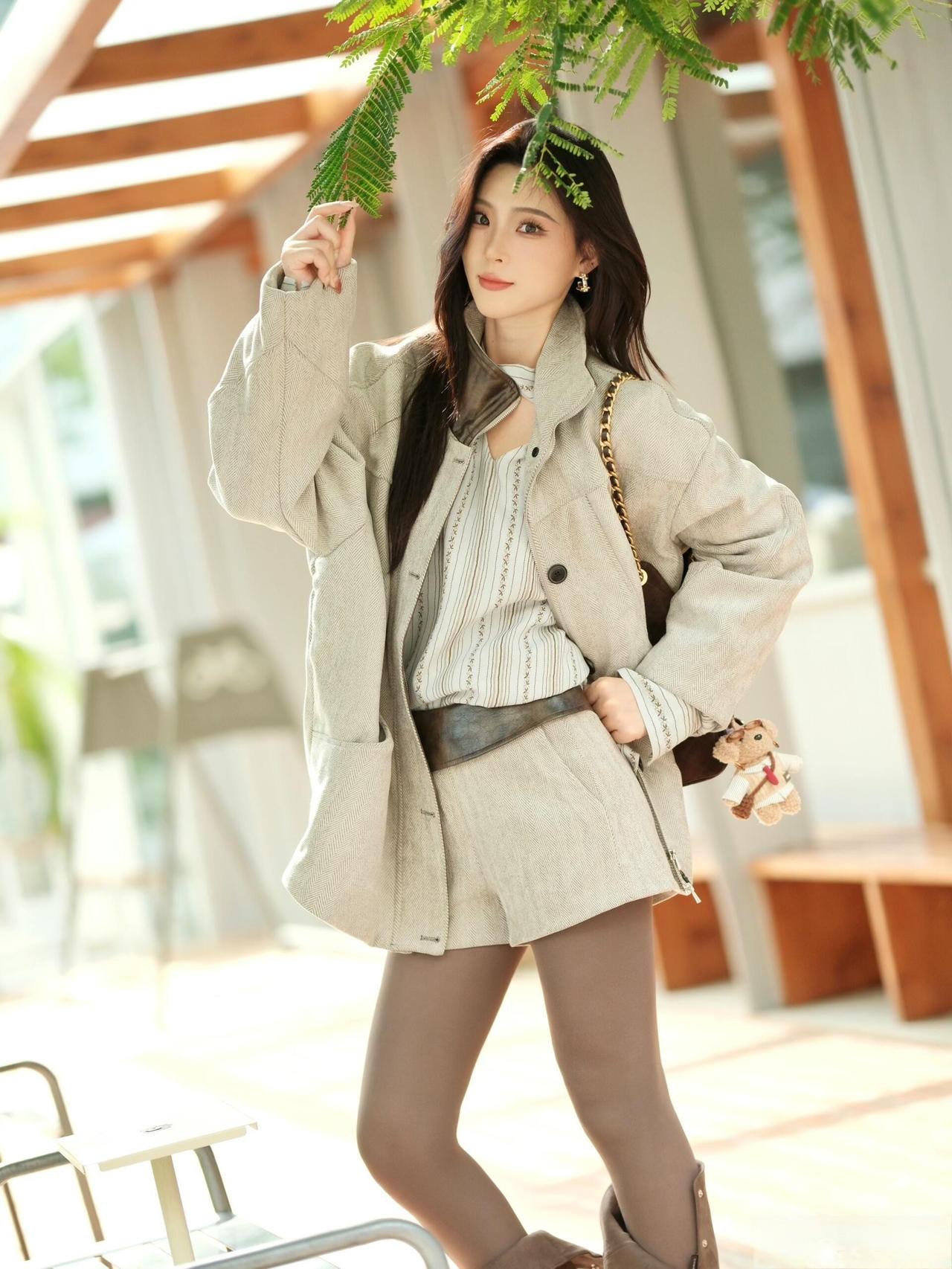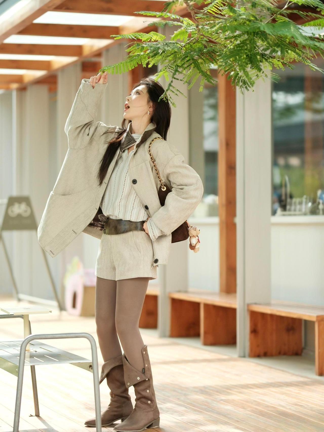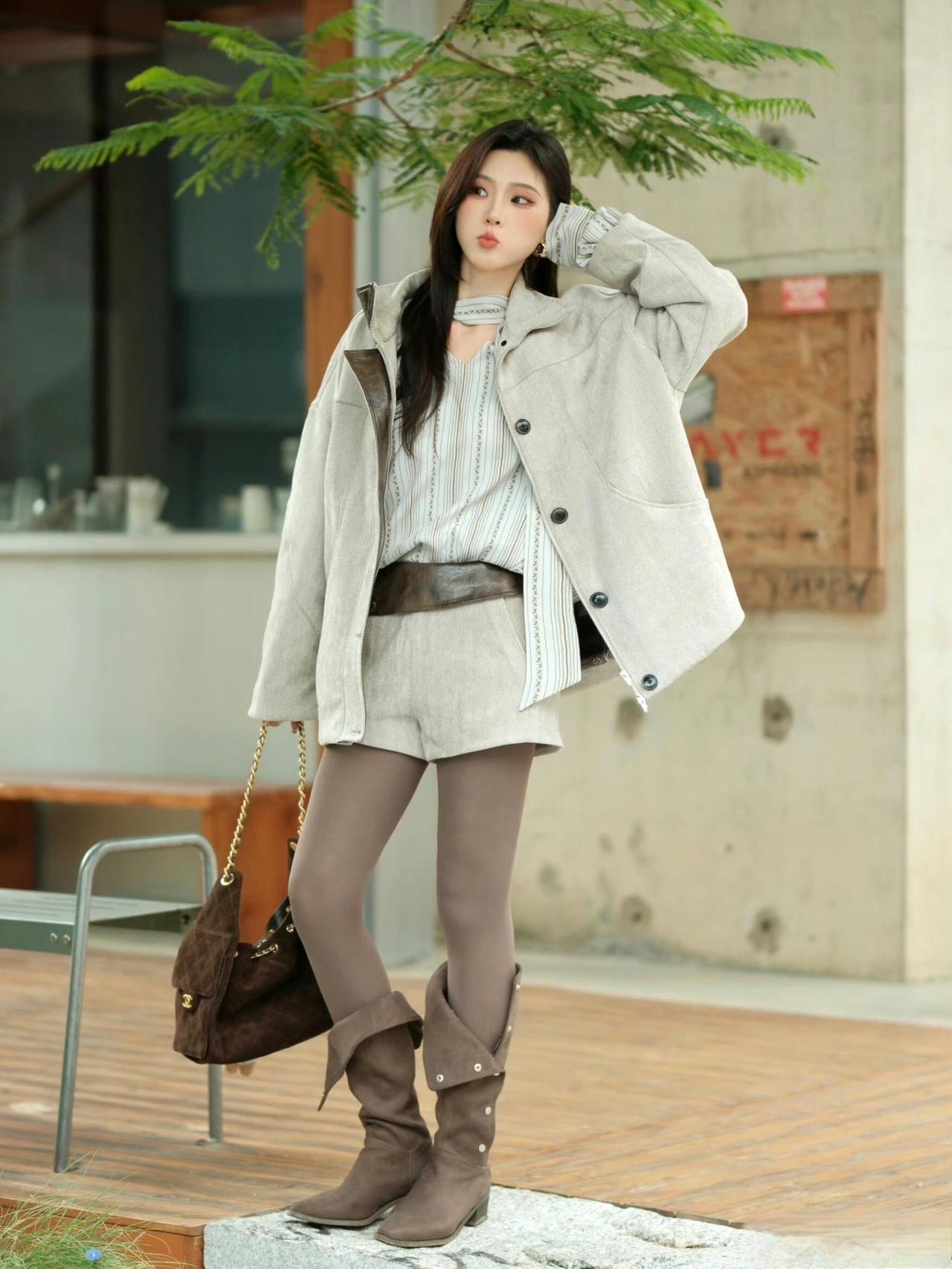 这套穿搭将复古工装风与休闲质感巧妙融合,风格随性又具层次。浅灰色工装外套版型宽松随性,纽扣设计增添复古气息;内搭条纹衬衫简约百搭,与外套形成和谐的层次搭配,凸显穿搭的复古质感。 浅灰色短裤休闲利落,棕色腰带收腰显瘦,为造型注入复古工装的风格;棕色翻边靴复古又具时尚感,与整体风格和谐统一,提升了造型的复古韵味;棕色链条包大气实用,为整体造型增色不少。甜酷工装风穿搭 复古工装风穿搭 条纹衬衫