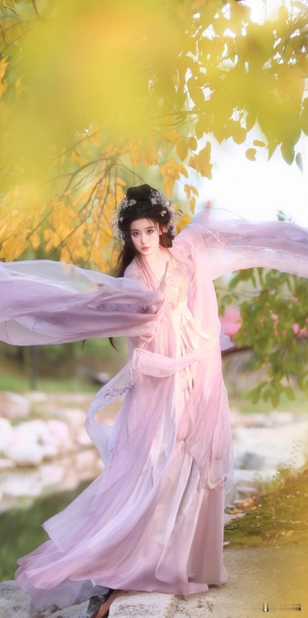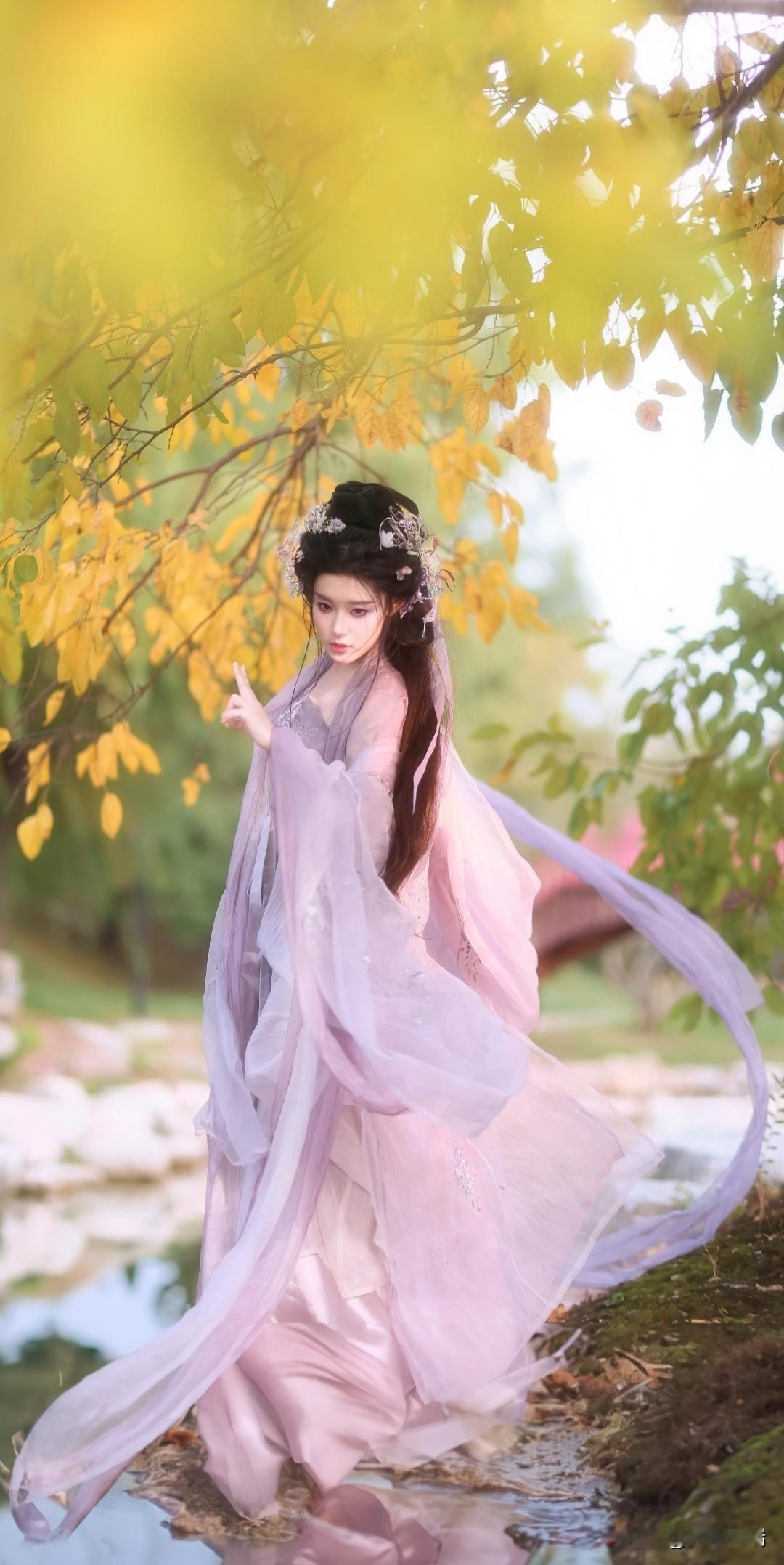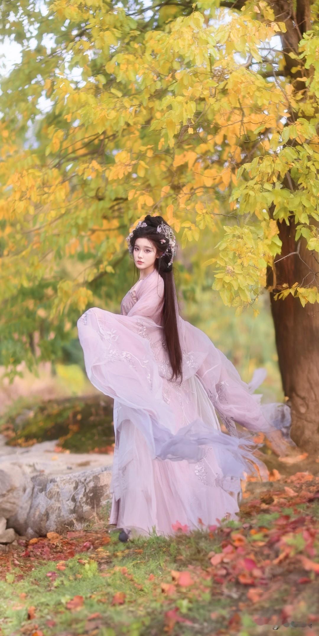 秋日仙境,红衣美人,落叶纷飞,宛如画中。