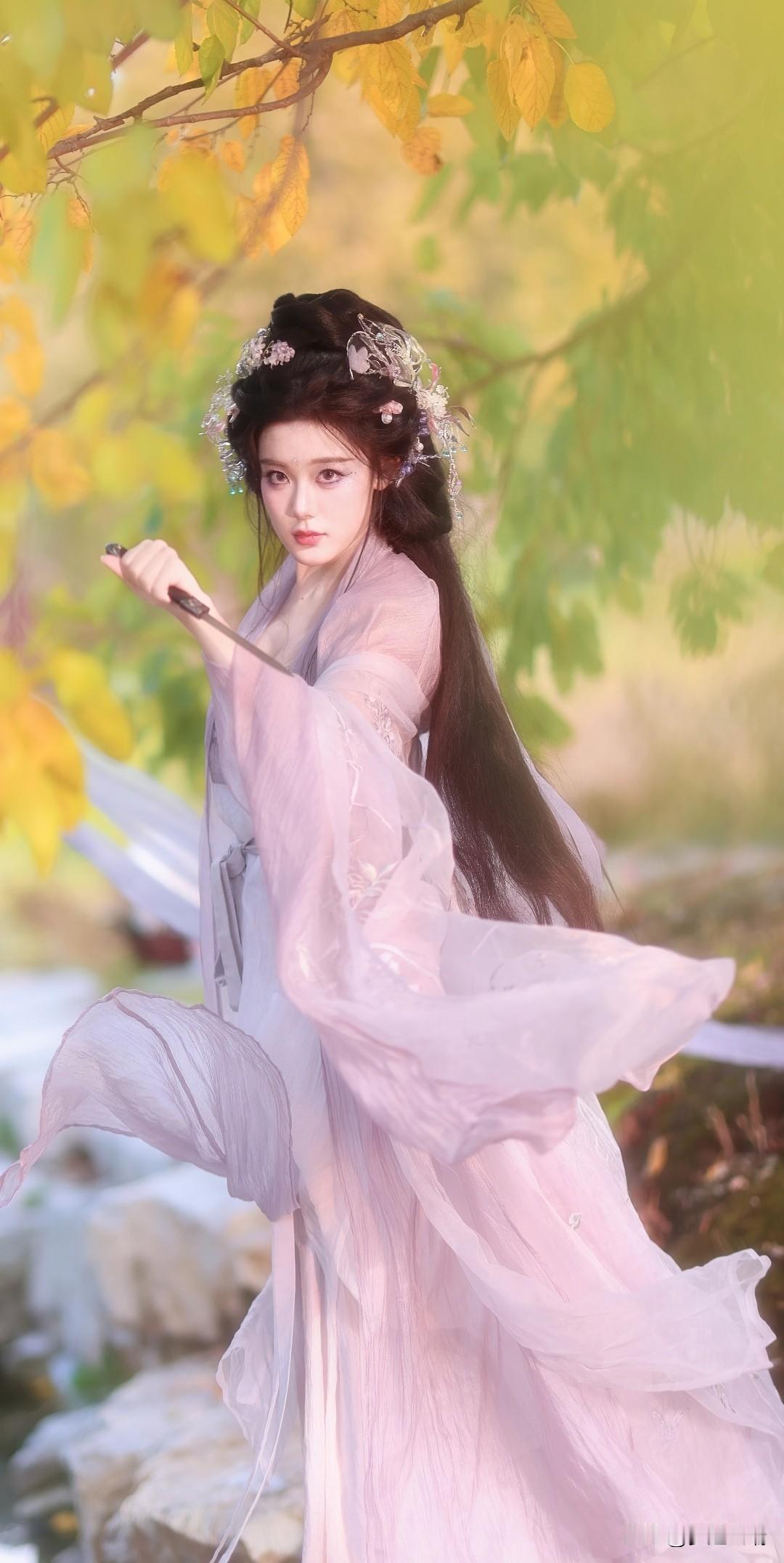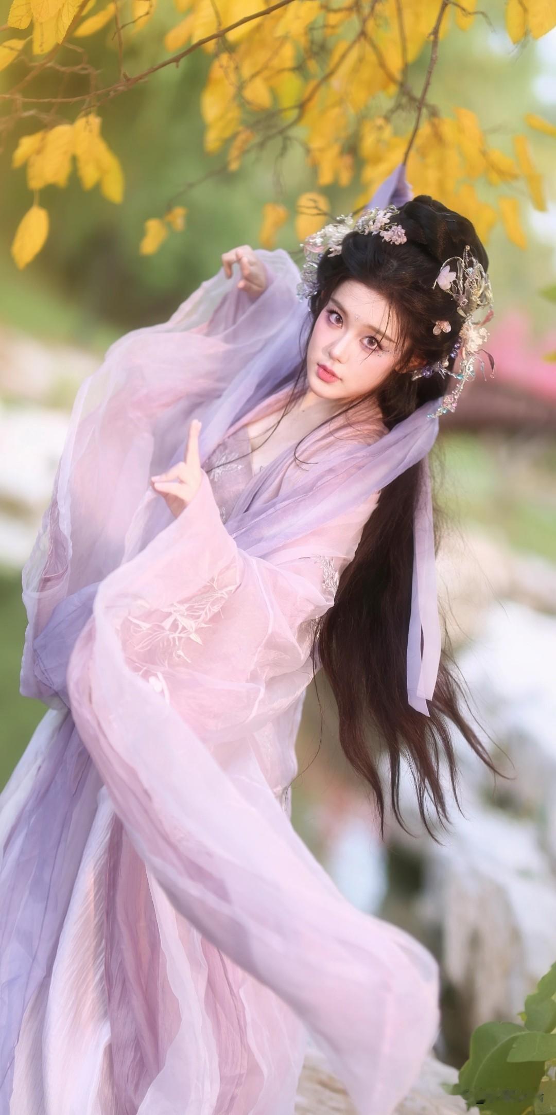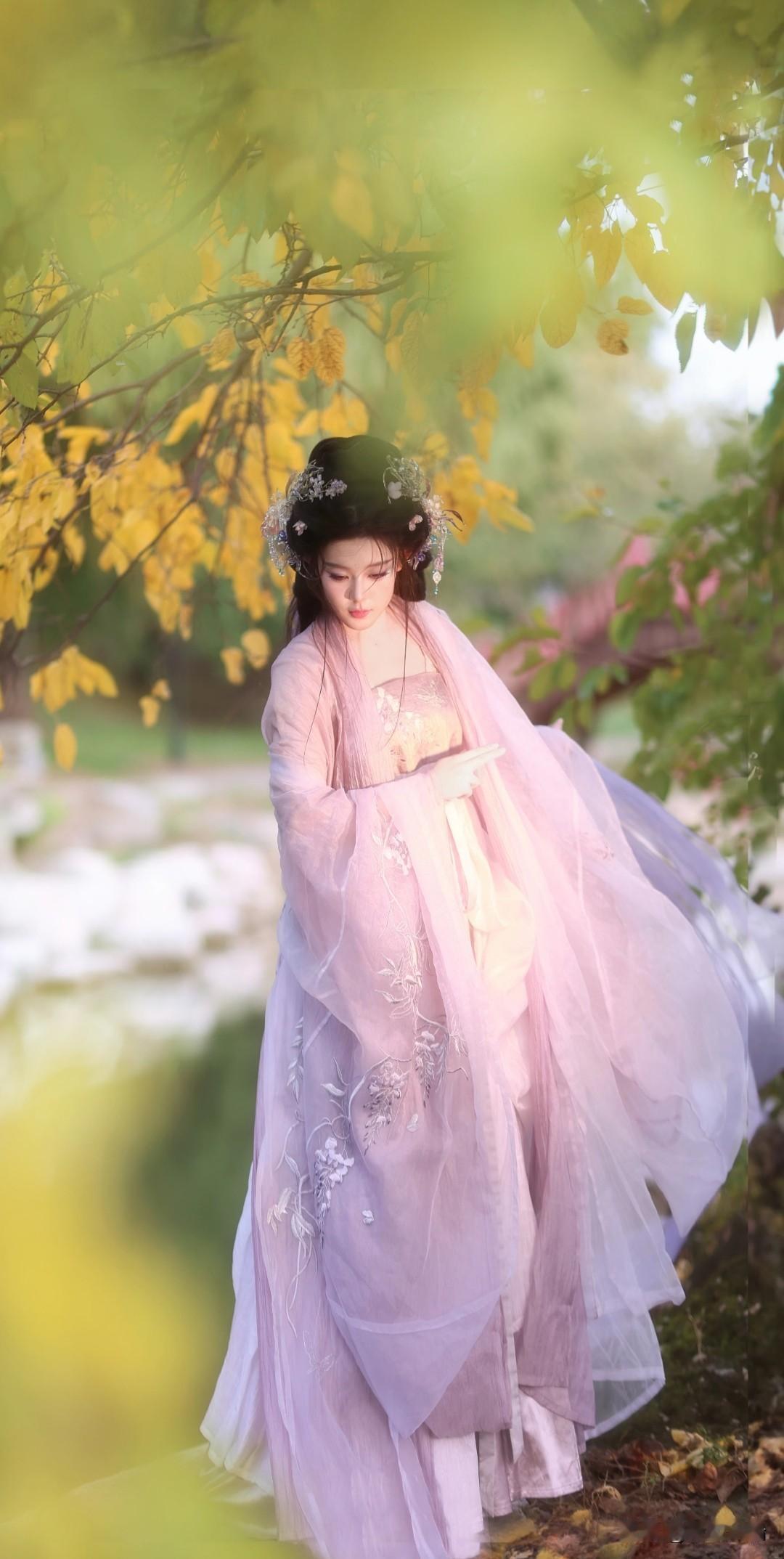 秋日仙境,红衣美人,落叶纷飞,宛如画中。