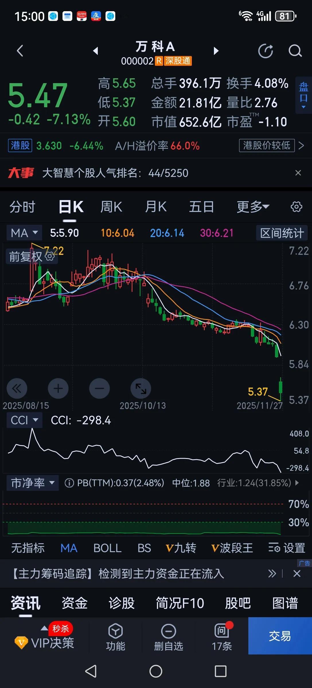 今天这行情走的主力太不地道了,明明是到年底了想兑现出货,你就大大方方的出,何必盘中还要无量拉升?是想把散户诱进去你们才高兴吗?现在的行情很明了了,随着万科的连续大跌,预示着地产还在下行,银行股就失去了继续上涨的理由了,难道银行不受影响吗?地产下行,地产产业链上的众多个股也会受连累,股市也失去了上涨的动力了。股市调整势在必行,你还在那诱多有什么意义呢?有几人会上当呢?