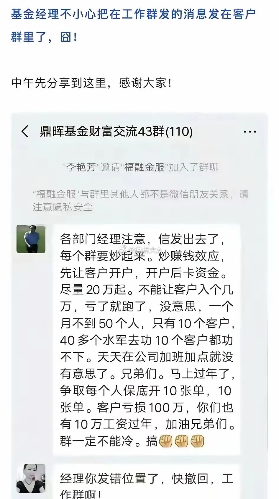 看下图,这些私募基金经理真的是不负责任啊!在群里号召大家拉客户,即使客户亏100万,他们提成也能拿10万。还用水军去骗客户,真的把客户当待宰的羔羊啊!另外,这位经理说20万起也是不合规的,不知道他们这个团队是不是做二级市场的。鼎晖基金主要做股权投资的,规模在1380亿左右,今年刚刚募集了物流基础设施基金50亿元。截至2024年底为投资人实现每年不低于8%的现金分配。私募乱象确实应该好好监管,不管是一级市场还是二级市场,投资者都要擦亮双眼避免受骗啊!市场监管