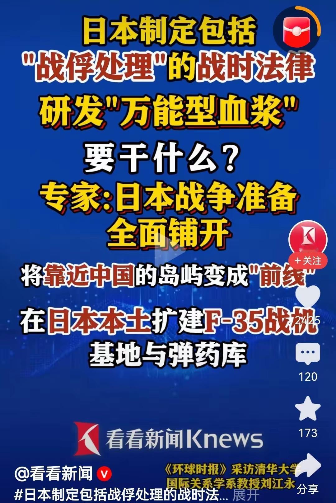 日本再全面准备,全面铺开。我们没有好犹豫的? 日本在搞战俘处理法,研发万能型血浆,要干什么?就是要与我们决战。 不会客气小日本。 别看他们表面上低调,背地里可是忙得不亦乐乎。搞战俘处理法,这是要为可能的战争做准备,甚至在“战争胜利后”有了一个“合理”的口号,用来处理战俘。这种举动,明显是在给自己留后路。至于万能型血浆的研发,那更是个大动作,意味着他们想要在生物战争、医药战的方向上有所突破,防止未来的战争中缺乏救治手段。看得出来,日本从未放下过侵略的心思,依然在悄悄为战争储备力量。 而我们,中国,绝不能坐视不管。日本不敢正面挑战我们,也就不会有任何机会。战术上,所谓的“准备”背后是潜藏的侵略意图,换句话说,就是为了给自己提供对中国的冲突“理由”,制造一场挑衅性的战争。作为对手,我们绝对不能软弱。是时候认清现实,做出应有的反应了。 日本的这些行为,实话说,已经让许多人看清了它的“战略意图”。在过去的几十年里,日本总是表面上装作和平的样子,但一旦机会来临,他们依旧会表现出极强的侵略倾向。无论是通过军事手段还是通过别的方式,他们始终在“防线”外磨刀霍霍。这种时候,如果我们继续按兵不动,反倒给了他们更多的挑衅空间。 而在此时此刻,我们不能抱有任何幻想。历史已经告诉我们,跟一个有野心的对手讲“和平”,不仅无济于事,还可能为自己带来更多的危险。中国人讲究的从来不是“惹事”,而是“被动应对”。但在面对一个明显企图挑衅我们的对手时,我们不能再让步,也不能再妥协。把话说得直白点——要么在和平中共存,要么就准备好进行全面的博弈。我们不会主动挑起战争,但决不容忍被侵犯。 而且,看看现在的中国,无论是经济、军事,还是外交,都不再是当年的中国了。我们已经有了足够的底气和实力,面对任何挑战都能做到“有理有据”。所以,面对日本的这些“准备”,我们绝不能含糊其辞,不仅要坚守原则,还要做好充分准备,不给他们任何可乘之机。中国现在的反应,绝不再是“忍让”,而是“有力回击”。 历史的教训,民族的坚韧,不容任何人轻视。这些年来,日本一直希望能通过经济、技术等方面的优势,暗中增强自己的力量,甚至某些势力还想以此为跳板,重新在世界舞台上掀起波澜。而我们,中国,已经在这场无声的博弈中站稳了脚跟。面对未来的挑战,我们要有足够的智慧与决心,坚定自己的立场,果断出手。