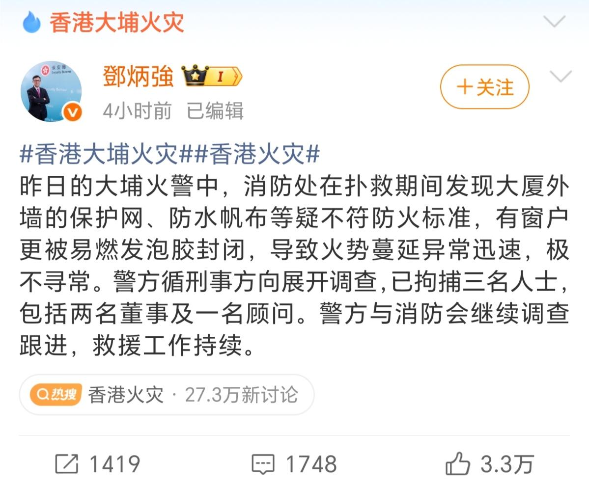 香港大埔老旧高层建筑年久失修本来想好好修缮一番,却不料遭一场大火尽毁,死伤严重,血淋淋的惨痛教训!老楼、高层建筑、商住楼、宾馆酒店等尤其要注意消防安全,一旦发生火灾那就是群死群伤!宏福苑楼间距太近太密集、竹手架、保护网、防水帆布、易燃发泡胶多种因素凑在一起,加上当天风势较大,那么极小的火源也会快速烧成大火形成连烧! 都说水火不留情,水灾汛情,基本上都是天灾,比如台风引发强降雨,事先都能通过天气预报预警做好工作生活学习安排,或者汛期强降雨引发洪涝事先都会收到预警预报,以便于人们提前做好疏散撤离;而火灾这个东西,除了天干物燥引发外,大多数时间都是人们在使用明火的过程中,比如做饭烧菜水烧干烧胡了、油锅燃起来了;或者户外作业抽烟不熄灭烟头等情况下不注重消防安全;或者在使用电器的过程中疏忽大意引发火灾比如取暖器烤衣物、电热毯短路着火、线路老化引起火灾等等。 水灾洪涝等天灾,我们避免不了,只能尽可能的提前预报预警减小减少损失;而大多数火灾是可以避免的,多数火灾由人们的侥幸心理和放任疏忽大意行为产生,造成的后果亦非常严重,尤其应当注意防范。消防安全,人人有责!