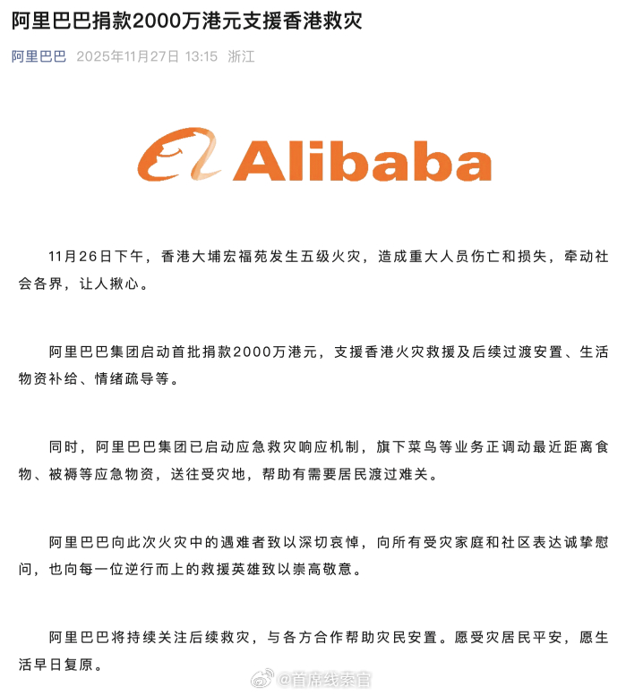 阿里巴巴捐款 2000 万港元支援香港救灾。308_IO阿里巴巴 香港起火大楼内发现生还者