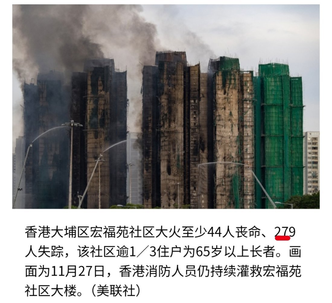 香港火灾多名失联者失联超9小时最恐怖的是不知道到底多少人失联。¹ 香港历史上最严重的火灾死亡人数是44人,这次恐怕要超过。不能细想。² 因为着火时很多人在家里睡午觉,来不及跑、无力跑。而且因为建筑外墙维护大都关了窗户,并不知道发生火警。“65岁江姓住户昨晚表示,一名邻居打给他说自己仍困在大楼里,「我非常心痛,有这么多邻居和朋友,我不知道到底发生了什么事,所有大楼都在燃烧,我不知道该怎么办」”。热点科普
