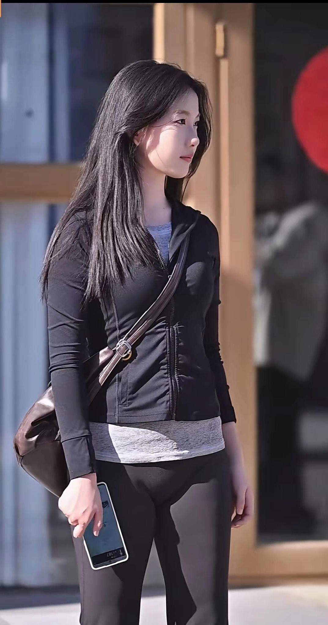黑衣少女,自信满满,手拿手机,背着大包,走在街头。