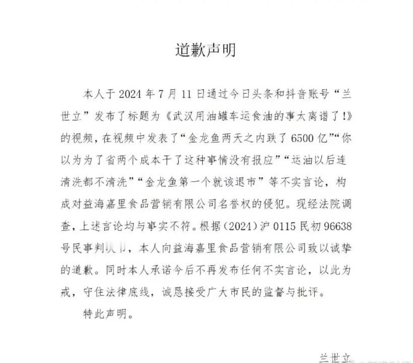 金龙鱼这个品牌,连村里的老大爷老大妈都知道的品牌,竟然持续性的陷入到争议的风波,以后还让我们怎么敢买金龙鱼的品牌。? 金龙鱼在我国这么多年,真的是深入到数亿家庭的餐桌,使用最多的当属金龙鱼的食用油,关系到食品安全的问题,这可是天大的事情呀,而金龙鱼却持续性的从舆论风波中拔不出来,这明显的是真有事呀。 从去年用运输煤油后未经清洗直接用来运输食用油曝光出来后,就觉得这个企业真的太没有道德心和责任心了,根本不把民生的食品安全放在首位。 兰世立与金龙鱼的恩怨,到现在也没有消停掉,做为个人,发表视频说说你的错误,你做为一家500强企业,有则改之、无则加勉不就好了,跟一个人去争论,真的是掉了企业身份,直接的说就是此地无银三百两了,最终兰世立也道歉了。 通过这个持续发酵的事件,金龙鱼的产品真的是不敢买了,太儿戏了,深入到亿万家庭的餐桌食品,这么不堪一击,谁还敢相信呀!