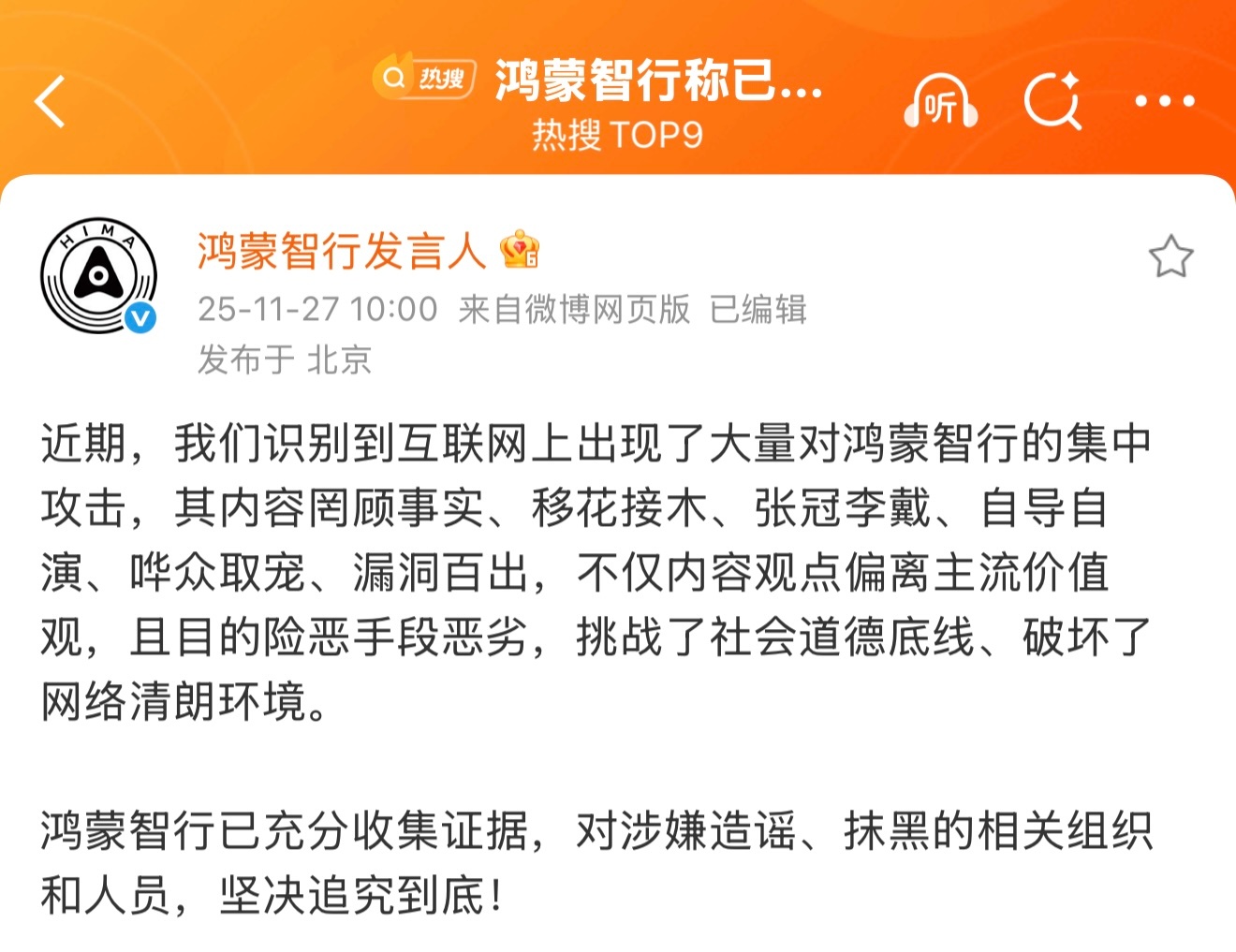 鸿蒙智行称已充分收集证据对于这种没有底线的行为必须追究到底,严厉打击!