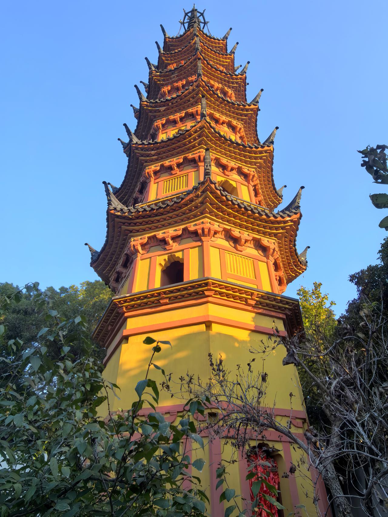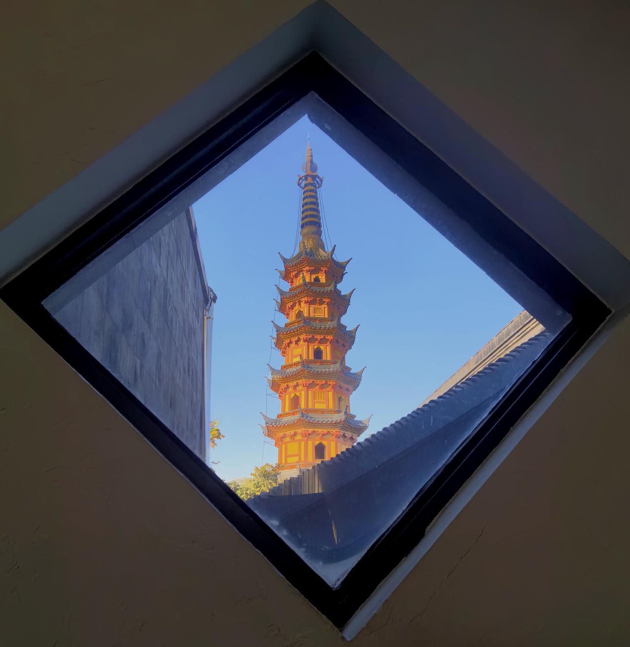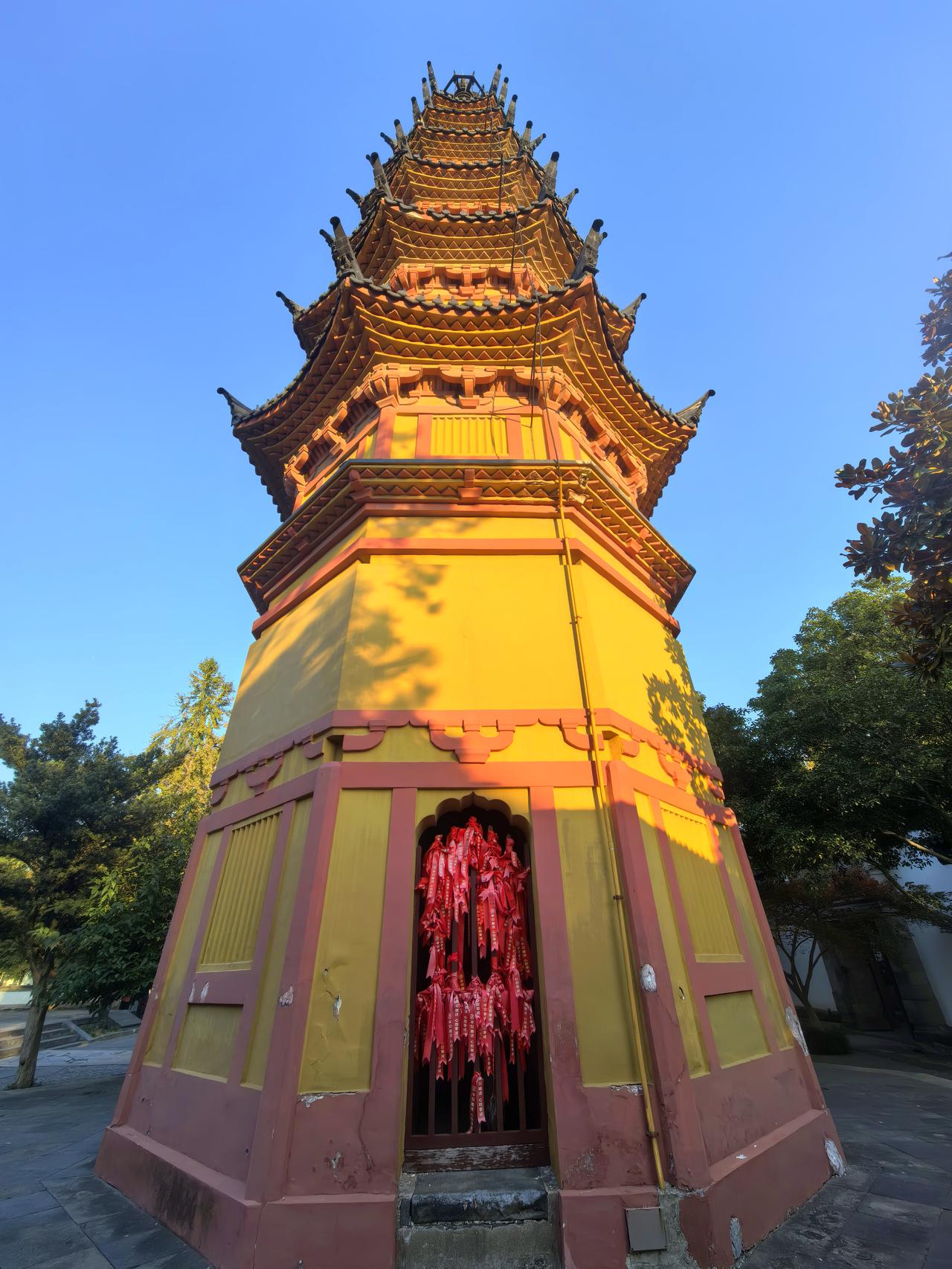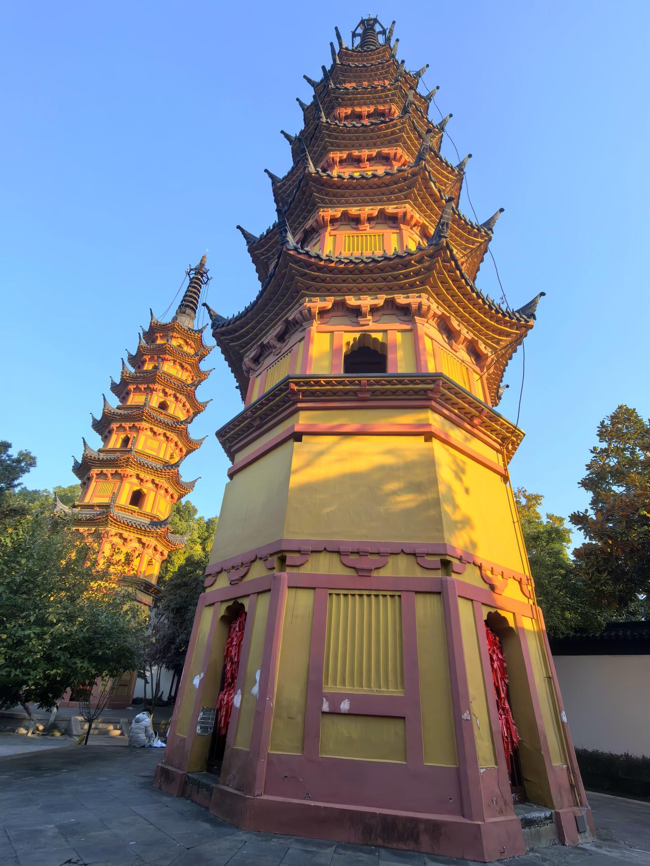 双塔映秋:苏州之行的终章絮语。 风还沾着定慧寺残留的银杏余韵,沿定慧寺巷前行百余步,我们将到达本次苏州之行的最后一站——双塔寺。这方藏在市井深处的古寺,没有拙政园的声名显赫,也无寒山寺的香火鼎盛,却以两座千年砖塔的静默,成了我们这场以“古”与“秋”为主题的旅程,最妥帖的收尾。 远远望去,双塔如一对孪生雅士,身着橘色长衫,并肩伫立在罗汉院大殿遗址前。这两座始建于南朝梁代、北宋重建的七层砖塔,没有飞檐翘角的繁复,也无雕梁画栋的华丽,仅以素净的砖身、简洁的斗拱,承载着一千五百余年的风雨。塔身微微倾斜,却如老者般沉稳,仿佛在岁月里站成了永恒的姿态。周围几株古银杏始染秋色,树冠如伞盖般撑开,偶有三两叶片被风卷起,或落在塔基的石阶上,或黏附在斑驳的砖缝里,将千始年古塔晕染得满是温柔的诗意。 走近了才发现,双塔的精致藏在细节里。塔身的砖雕虽经岁月侵蚀,仍能辨出莲瓣、卷草的纹样,每一道刻痕都镌刻着南朝的风骨、北宋的雅致。相传南宋诗人范成大曾漫步于此,留下“双塔亭亭倚夕阳,佛香清梵满虚堂”的诗句,如今读来,竟与眼前的景致如此贴合。 站在双塔之间仰头凝望,阳光透过银杏叶的缝隙,在塔身上投下细碎的光斑,风一吹,光斑便跟着晃动,像是千年时光在轻轻低语。恍惚间,这几日苏州之行的画面竟一一浮现:虎丘的剑冢埋不下阖闾的大志雄魂,枫桥的夜让愁绪晕染出传世名篇,拙政园的曲径洒满姑苏秋韵,定慧寺的银杏映着禅意天光,而此刻,双塔的静默,恰如一场温柔的收束,将所有的惊艳与触动,都沉淀成了心底的安稳。 夕阳渐沉,暮色为双塔镀上一层暖黄的光晕,银杏叶在晚风里簌簌飘落,像是为这场旅程撒下最后的温柔。我们站在寺门外回望,两座古塔的剪影渐渐与暮色相融,为这次苏州之行烙下了清晰的印记。原创作品 走进双塔寺 随手拍苏州双塔