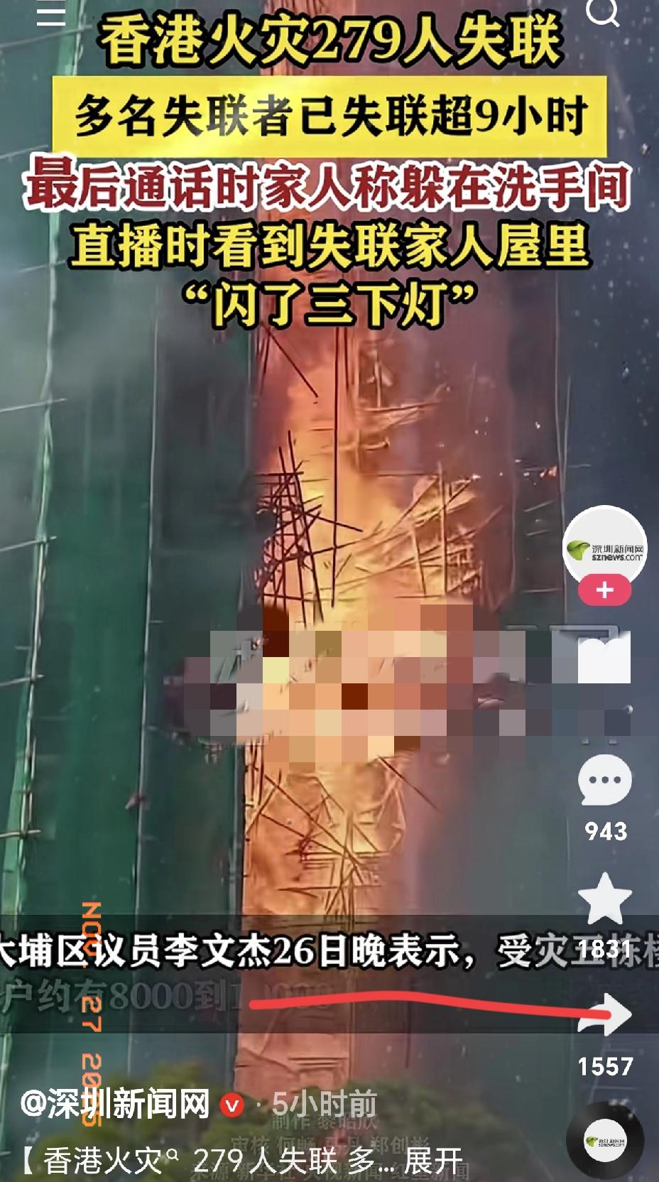 香港火灾279人失联,多名失联者已失联超9小时! 这场五级大火把42年楼龄的宏福苑烧得面目全非,7幢楼宇接连被火海吞噬,36条生命永远定格,让人揪心到窒息! 更让人痛心的是,本应护安全的外墙维修工程,反倒成了火势蔓延的“帮凶”! 那些老旧的竹制脚手架,燃点才150℃,遇火就成了“隐形燃烧弹”,再加上干燥大风助推,火势4小时就失控。 这哪里是意外突袭,分明是长期存在的安全隐患没被重视——全港30%超40年建筑有类似问题,3年17起维修事故还没敲响警钟? 不排除刑事案件的调查结果,更让这场悲剧多了层沉重。 消防战士拼尽全力逆行,政府开放庇护中心救援,但再多补救也换不回逝去的生命。安全从不是事后补救,而是事前把隐患掐灭。你觉得该如何避免这类悲剧重演?来评论区聊聊你的看法!