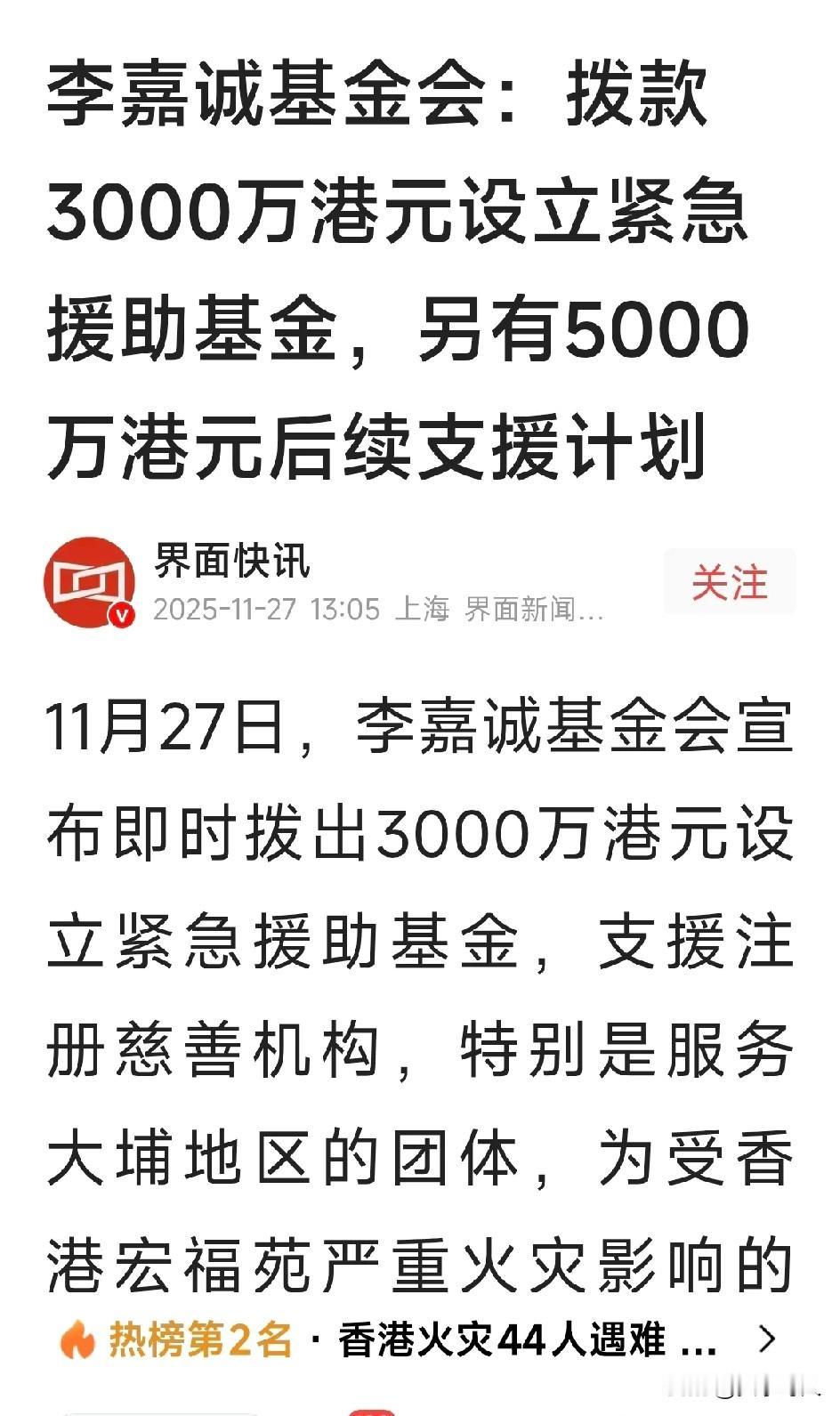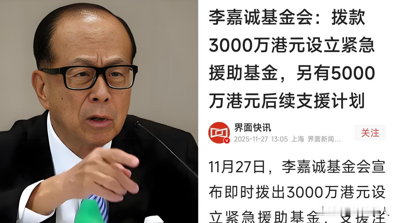李嘉诚,深夜捐3千万,后续还有5千万在路上 👍最绝的是“捐款属私人性质”——不捆绑政府,不经过中间商,直接送钱到家到户。 李超人的这波操作,太拉好感了,救火🔥更救心! 94岁的李超人凌晨三点向财务发出指令→针对近日香港火灾,3000万直接塞到受灾户手里,还表示,后续还有5000万在路上。 别人还在观望其他人捐多捐少,李超人直接深夜按下转账确认键——每户先发3万救命钱,受灾最重的30户另补50万,家家户户都有份,连租客都能领! 👏难怪网友刷屏,一片叫好声: →“你大爷还是你大爷!” →这哪是捐款?是在给富豪们做示范:什么叫顶级富豪的自我修养! (消息来源:界面快讯权威报道)