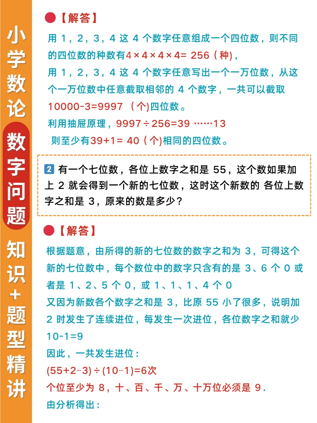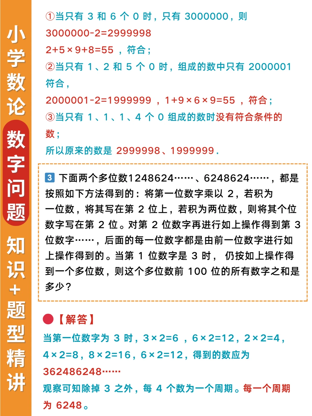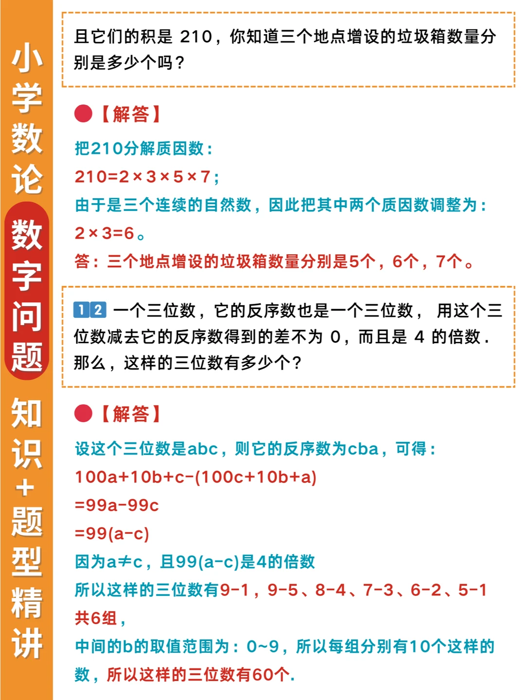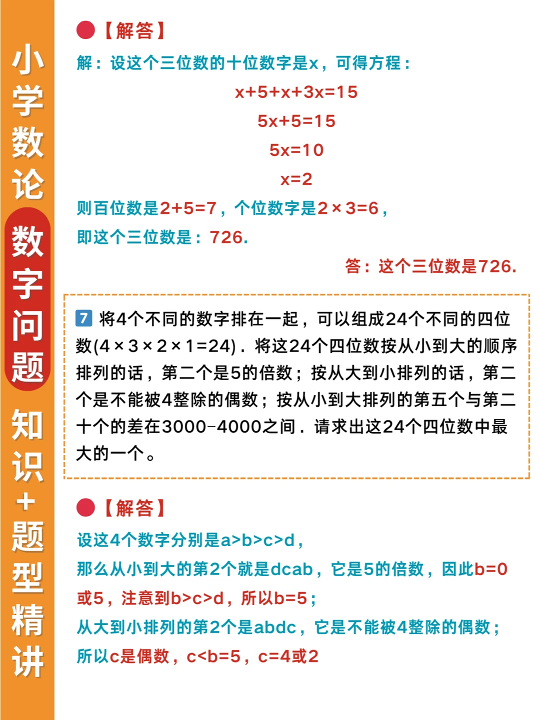 🍒小学数学:数字问题的主要题型。 数字问题是研究有关数字的特殊结构、特殊关系以及数字运算中变换问题的一类问题, 相对来说,难度较大.通常情况下题目会给出某个数各个位数关系, 求这个数为多少. 🍒核心知识 1️⃣数字的拆分。 是将一个数拆分成几个因数相乘或者相加的形式,经常需要综合应用整除性质、奇偶性质、因式分解、同余理论等. 2️⃣数字的排列与位数关系。 解答数字的排列与位数关系时,经常需要借助于首尾数法进行考虑、判断,同时可以利用列方程法、代入法、假设法等一些方法, 进行快速求解。