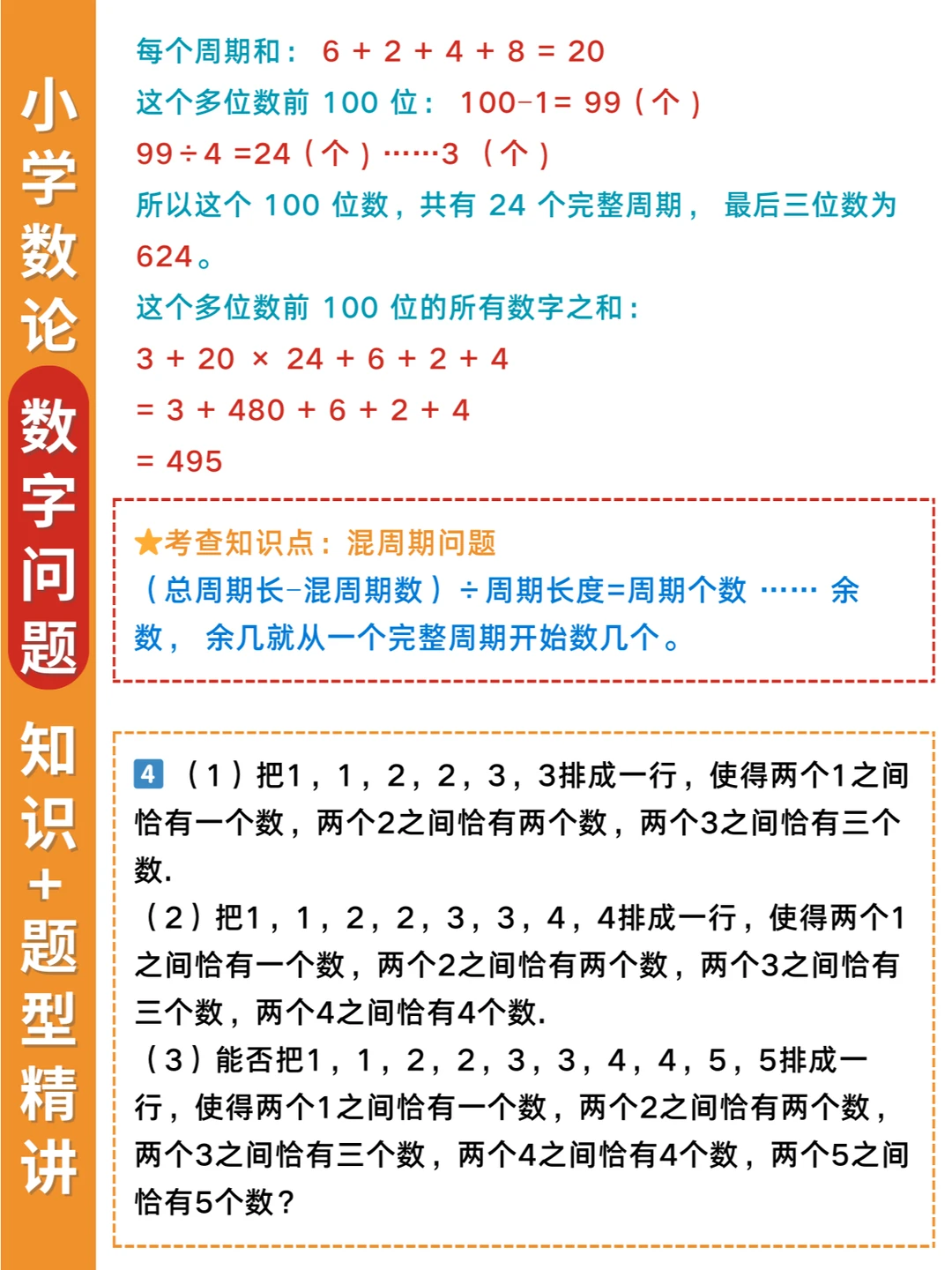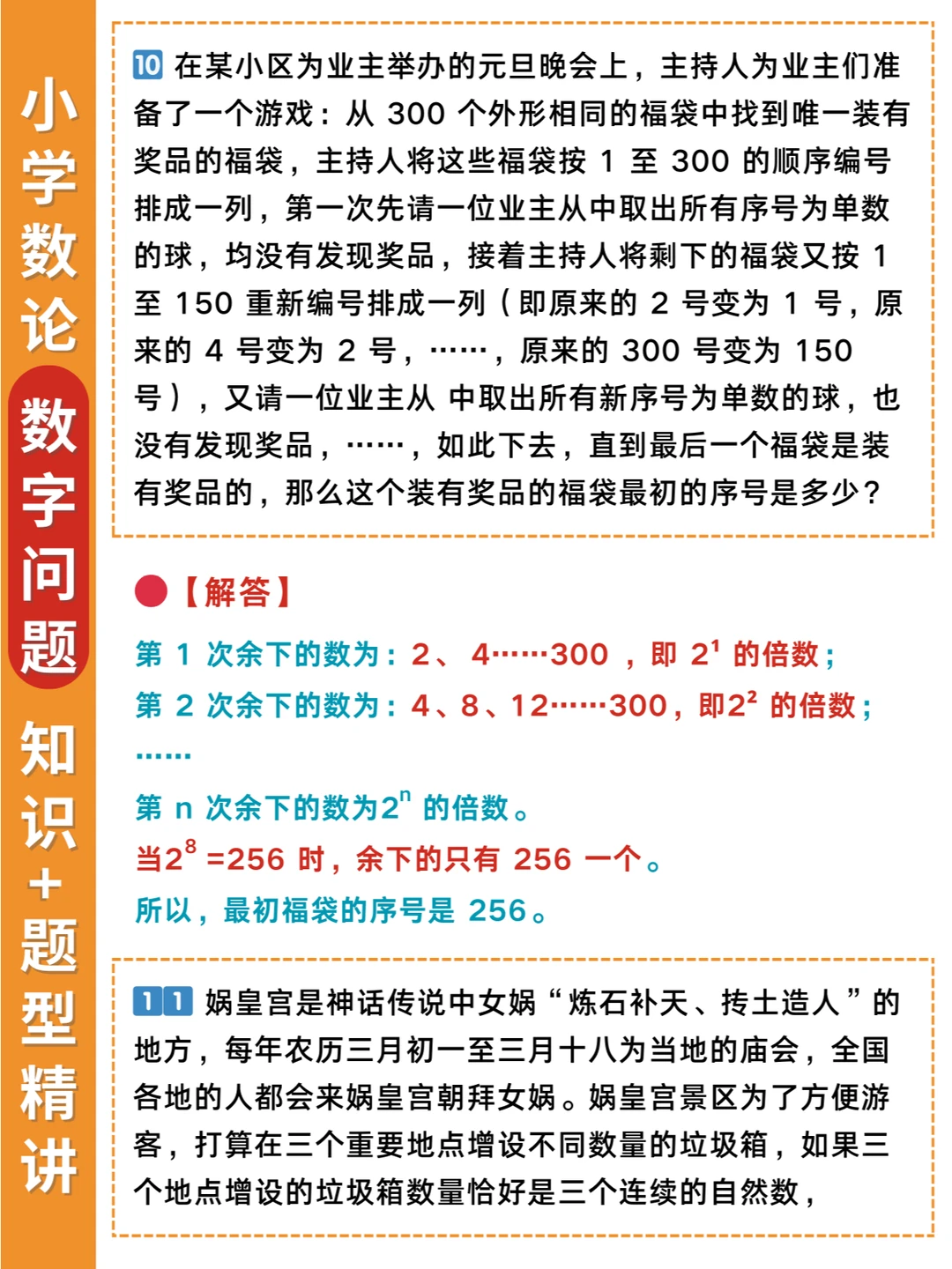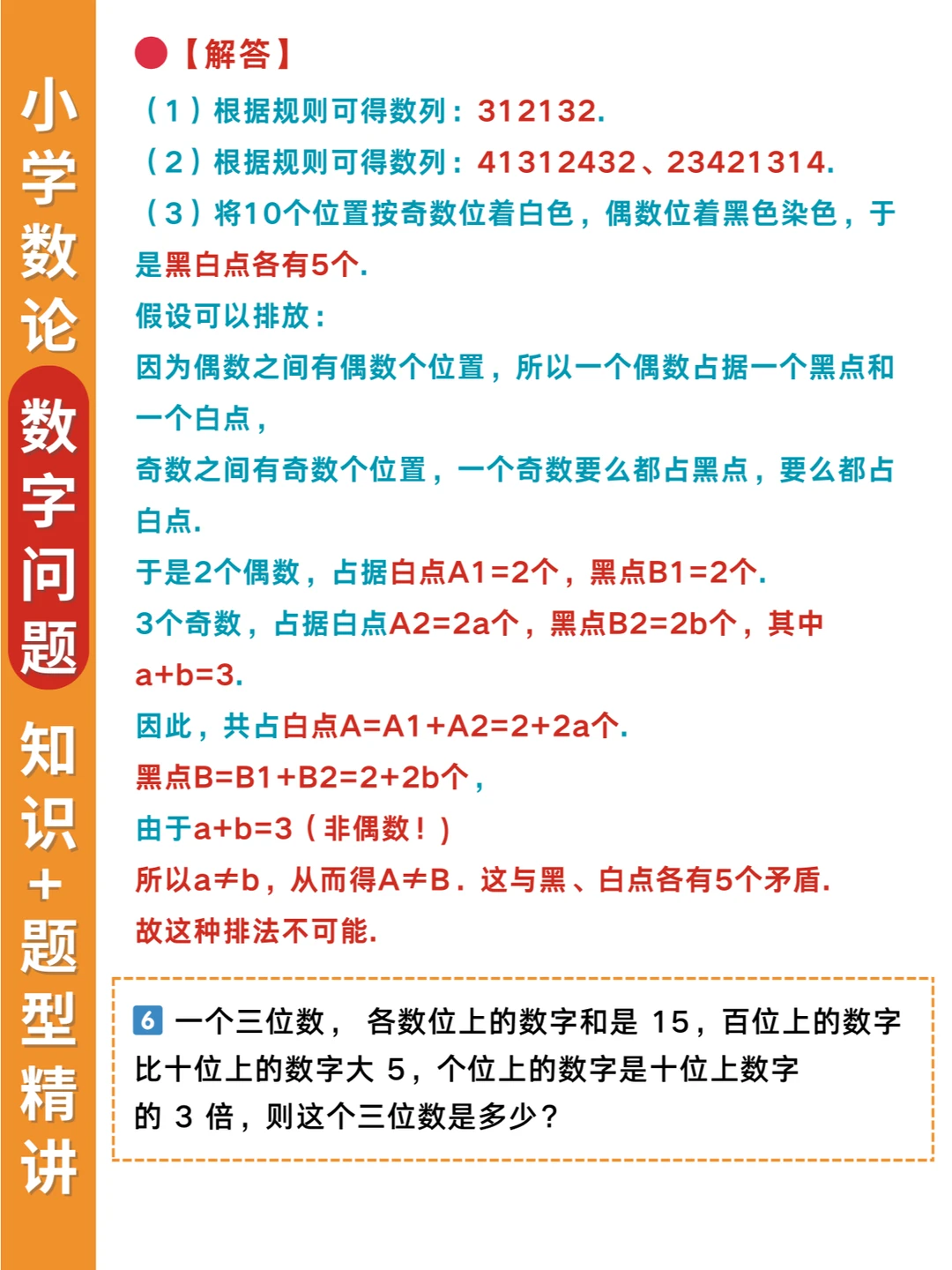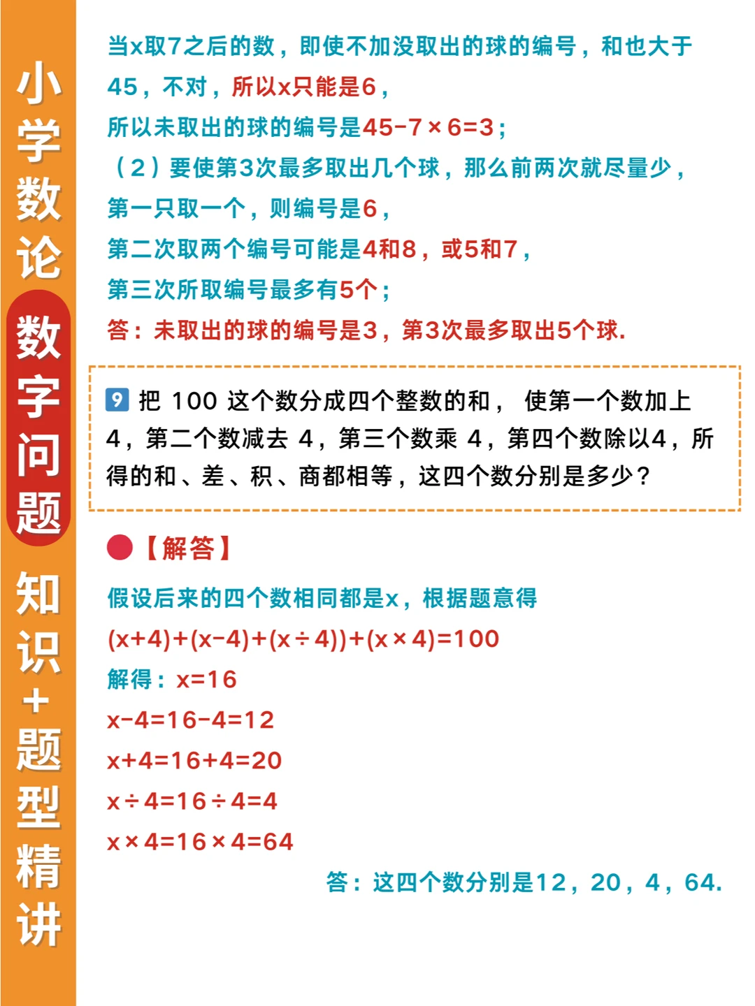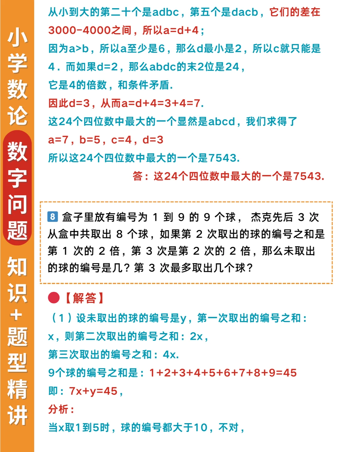 🍒小学数学:数字问题的主要题型。 数字问题是研究有关数字的特殊结构、特殊关系以及数字运算中变换问题的一类问题, 相对来说,难度较大.通常情况下题目会给出某个数各个位数关系, 求这个数为多少. 🍒核心知识 1️⃣数字的拆分。 是将一个数拆分成几个因数相乘或者相加的形式,经常需要综合应用整除性质、奇偶性质、因式分解、同余理论等. 2️⃣数字的排列与位数关系。 解答数字的排列与位数关系时,经常需要借助于首尾数法进行考虑、判断,同时可以利用列方程法、代入法、假设法等一些方法, 进行快速求解。