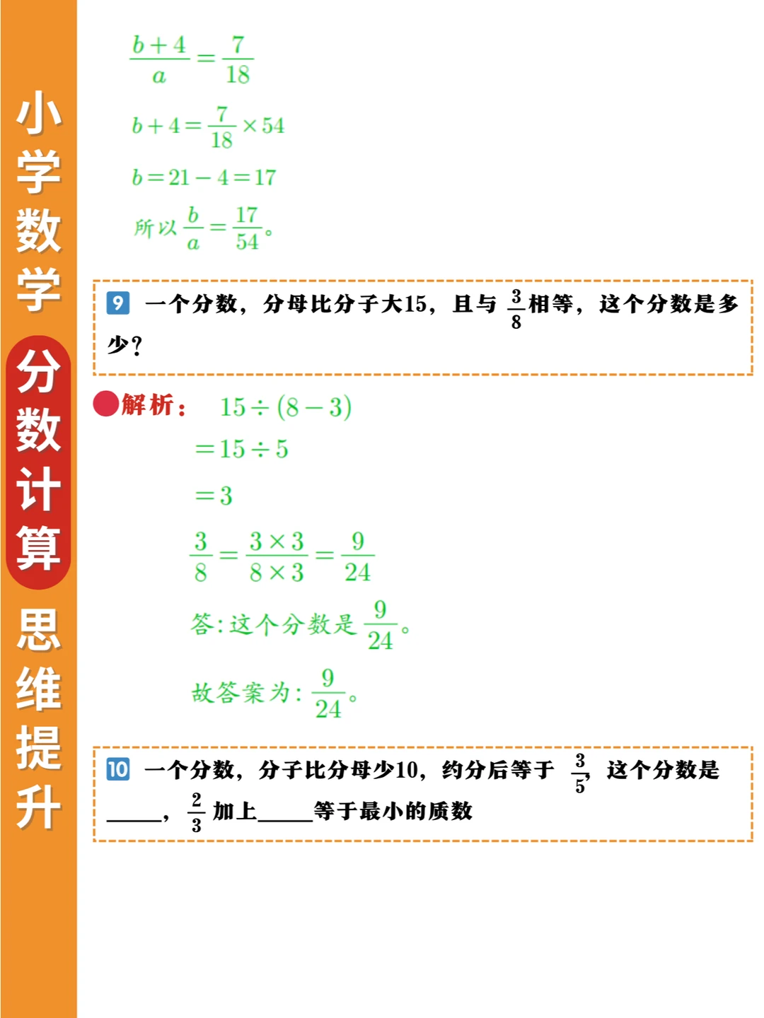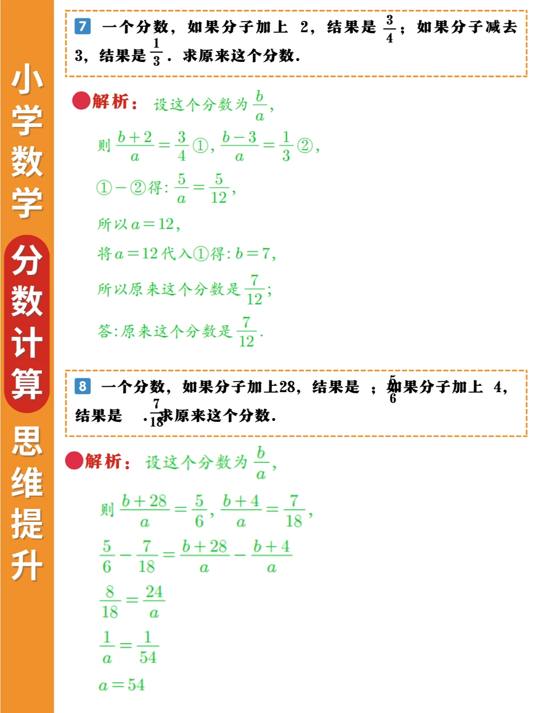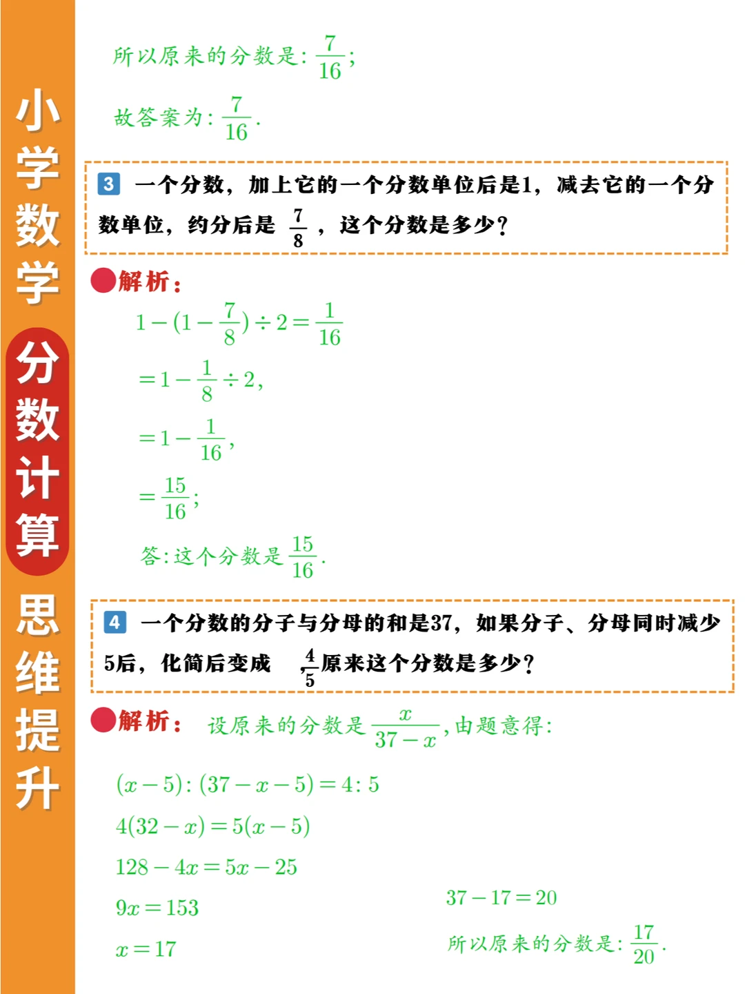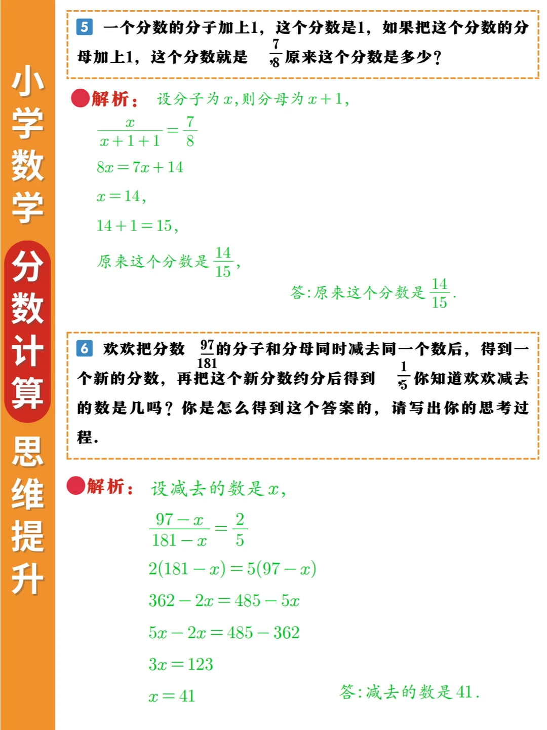 想不到分数计算还能这么考吧[暗中观察R]考察分数的基本性质,抓住不变量: 🔥一些分数的分子与分母被施行了加减变化,解答时关键要分析哪些量变了,哪些量没有变。抓住分子或分母,或分子、分母的差,或分子、分母的和等等不变量进行分析后,再转化并解答。[赞R][赞R]