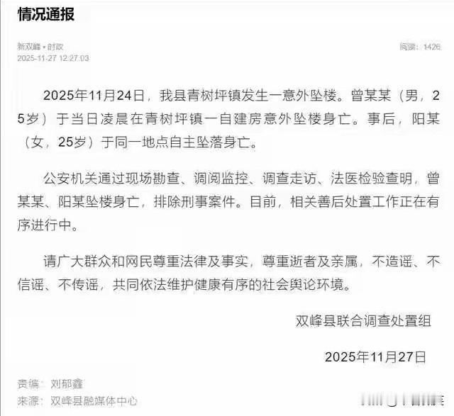 调查清楚了,男孩喝酒后意外坠楼身亡,女友早晨发现后,也跳了下去。 两个年轻人都是25岁,据男孩的堂姐介绍,两个人在一起5、6年了,经营了一家早餐店。 男孩和女友准备11月25日结婚,23日晚上,男孩和女友以及朋友聚餐喝酒后,男孩和女友回到女方家中。 24日早上7点40分左右,女孩被母亲叫醒,发现男友坠楼身亡,随即女孩也跳了下去。 谁说世上没有真爱,这就是真爱!问世间情为何物,直教人生死相许! 社会上有真爱吗