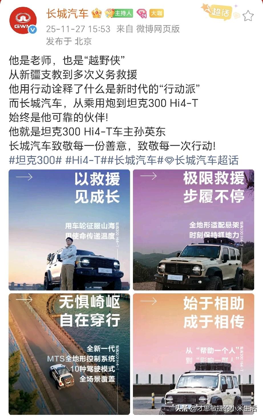 长城汽车:致敬坦克300 Hi4-T车主孙英东! 今天下午长城汽车官方发文致敬了这位坦克300 Hi4-T车主孙英东先生! 孙先生是一名在新疆支教的老师,喜欢越野,他多次参与义务救援行动,他的行动,他的善意,令人钦佩!为孙先生点赞! 这次广州国际车展,魏总携长城汽车的长城汽的坦克、哈弗、魏牌、欧拉、长城炮和长城灵魂六大品牌都参展了,人潮络绎不绝,全场聚焦坦克展台,全车型热度只增不减!