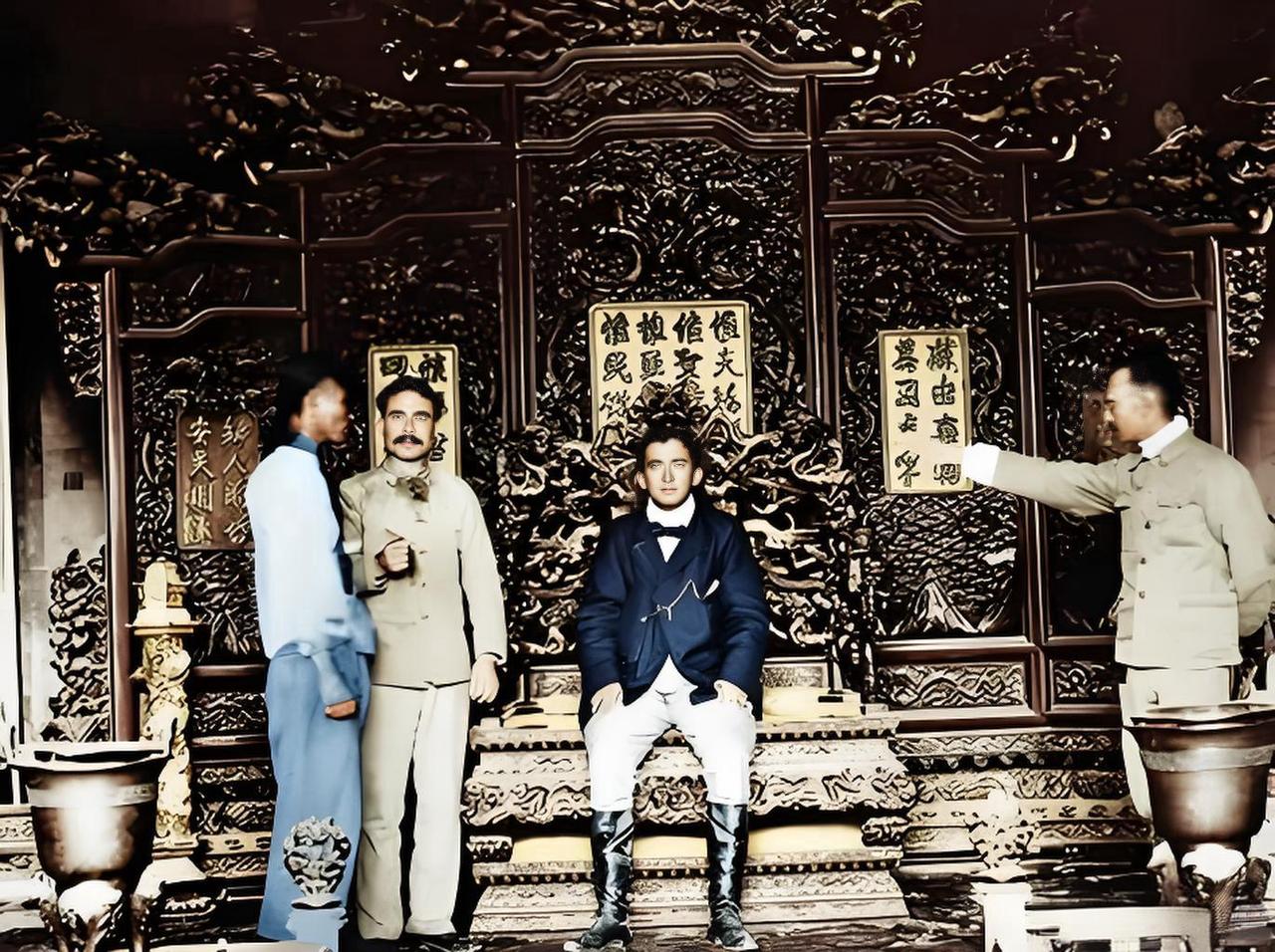 1900 年,八国联军攻陷北京,慈禧太后、光绪帝等皇室成员仓皇西逃,紫禁城(故宫)被侵略军占领。此时的皇宫失去了皇权的庇护,沦为侵略者肆意践踏的场所。 照片中的宝座是紫禁城(通常是乾清宫或太和殿)的皇帝龙椅,坐在龙椅上的是美国侵略军军官,身旁人员多为联军士兵或随行翻译。这不仅是美军军官的个人嚣张行为,更直观体现了当时中国 “主权沦丧、文化受辱” 的亡国危机。