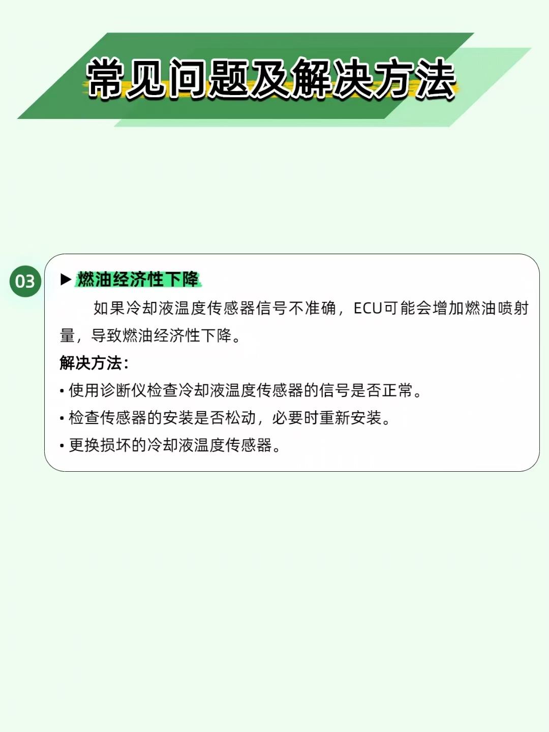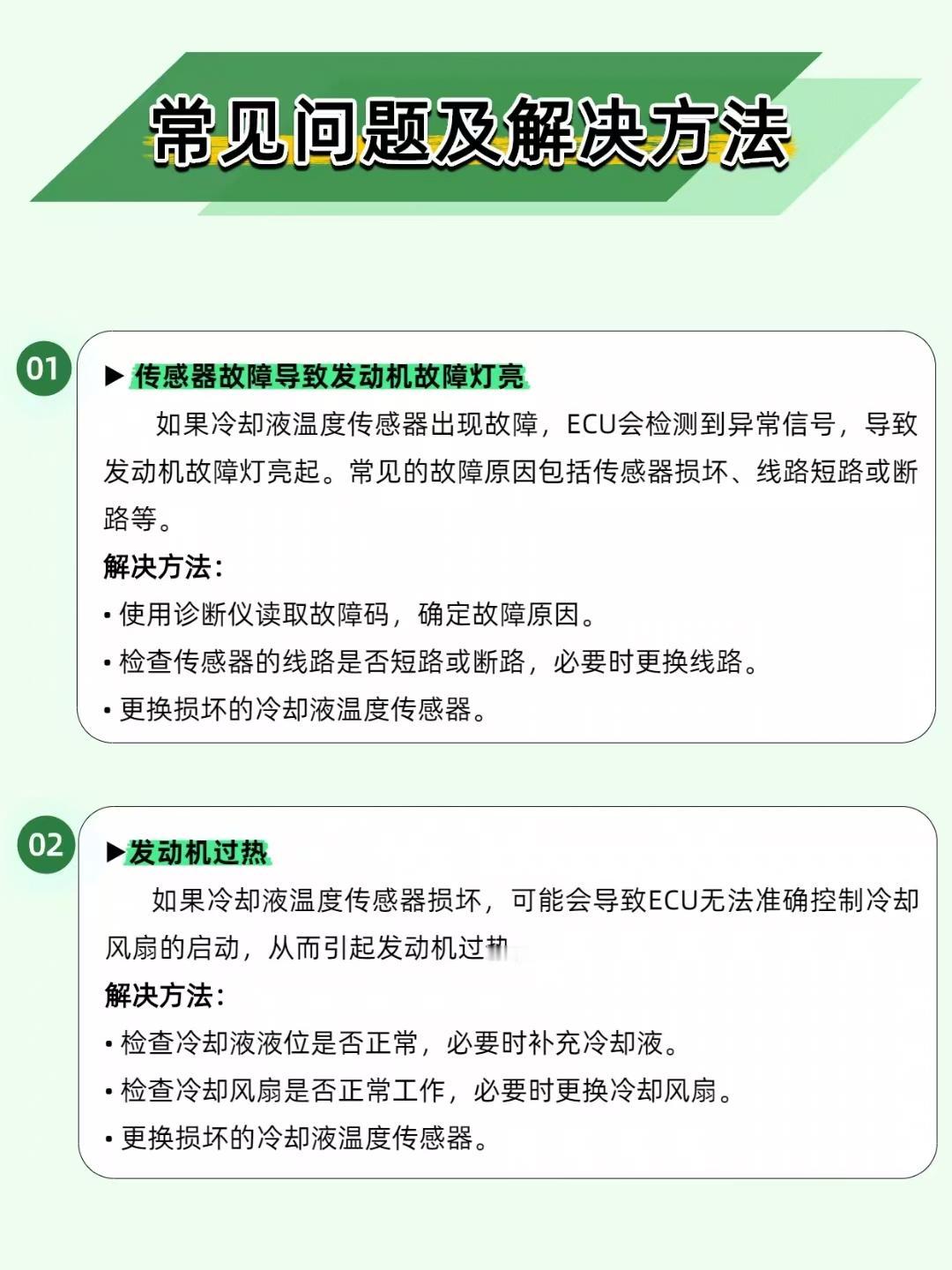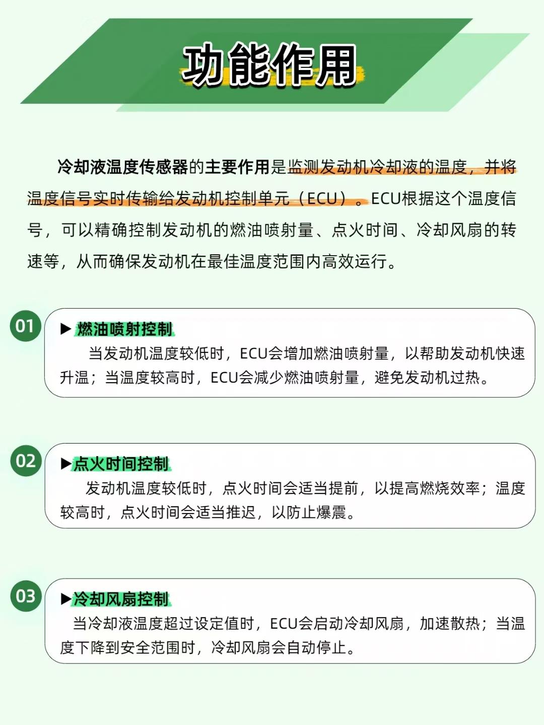【发动机 “体温表” 坏了?故障灯亮、油耗涨全是它的锅!】 发动机的 “隐形保镖”——冷却液温度传感器,就是它在实时监测水温,让 ECU 精准控喷油、调点火、管风扇! ✅ 它的 3 个核心作用: 冷车多喷油帮升温,热车少喷油防过热; 低温提前点火提效率,高温推迟点火防爆震; 水温超标的话,立刻喊冷却风扇 “开工” 散热。 ❌ 坏了直接出大问题: 故障灯亮:传感器 / 线路坏了,ECU 收不到准信号; 发动机开锅:风扇不及时启动,水温飙升; 油耗暴涨:ECU 误判温度,瞎加喷油。 📌 养护就 2 招: 每 1-2 万公里查传感器状态,线路松了赶紧紧; 2-3 万公里换冷却液,别让杂质糊住传感器。 你车故障灯亮过吗?是不是传感器惹的祸?评论区聊聊~