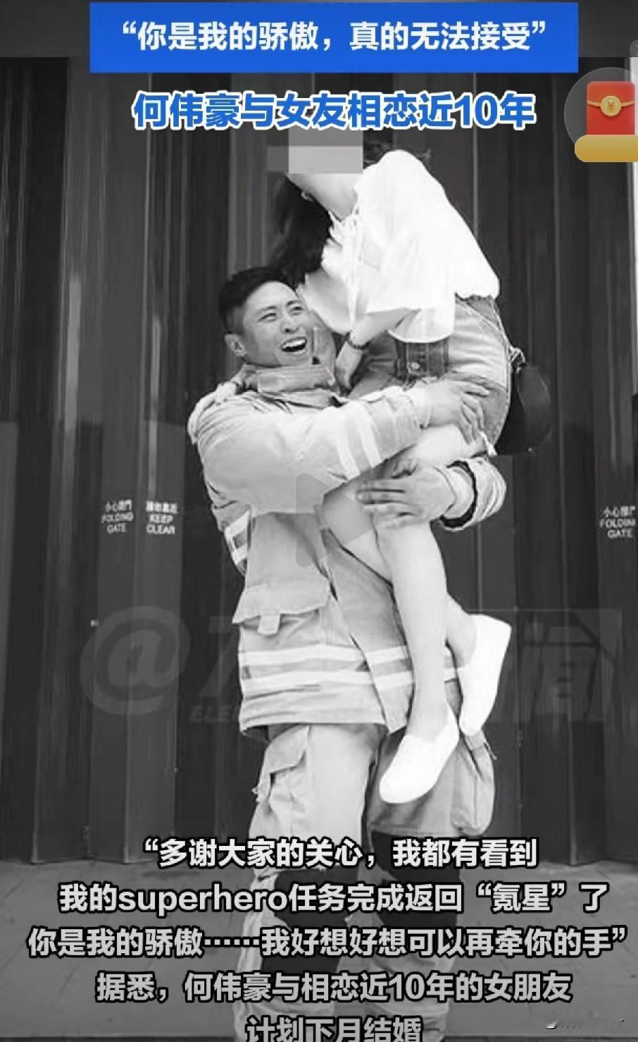 殉职消防员女友发文告别![流泪] 烈火无情,英雄无畏。“你是我的骄傲,好想再牵你的手”,这突如起来的变故让女友难以承受。相恋十年下个月都要结婚了,没想到意外发,这一别竟成永远。 11月26日,37岁的消防员何伟豪,在福苑五级大火救援中昏迷失联,送医后不治殉职。 何伟豪用九年坚守践行使命,在五级大火中毫不犹豫的逆火而行,当他的背影消失后却再也没有回来。 他将生的希望留给他人,却永远错过了与爱人的十年婚礼之约。女友那句“你是我的骄傲”,是深情告白更是最高致敬,藏着未说尽的牵挂与不舍。 和平年代的安稳,从不是理所当然。正是这些身为爱人、子女的普通人,身着戎装便扛起责任,用血肉之躯筑起安全屏障。 向每一位逆行者致敬,愿英雄安息,更盼每一次出征都能平安归来。[祈祷]缅怀消防员烈士