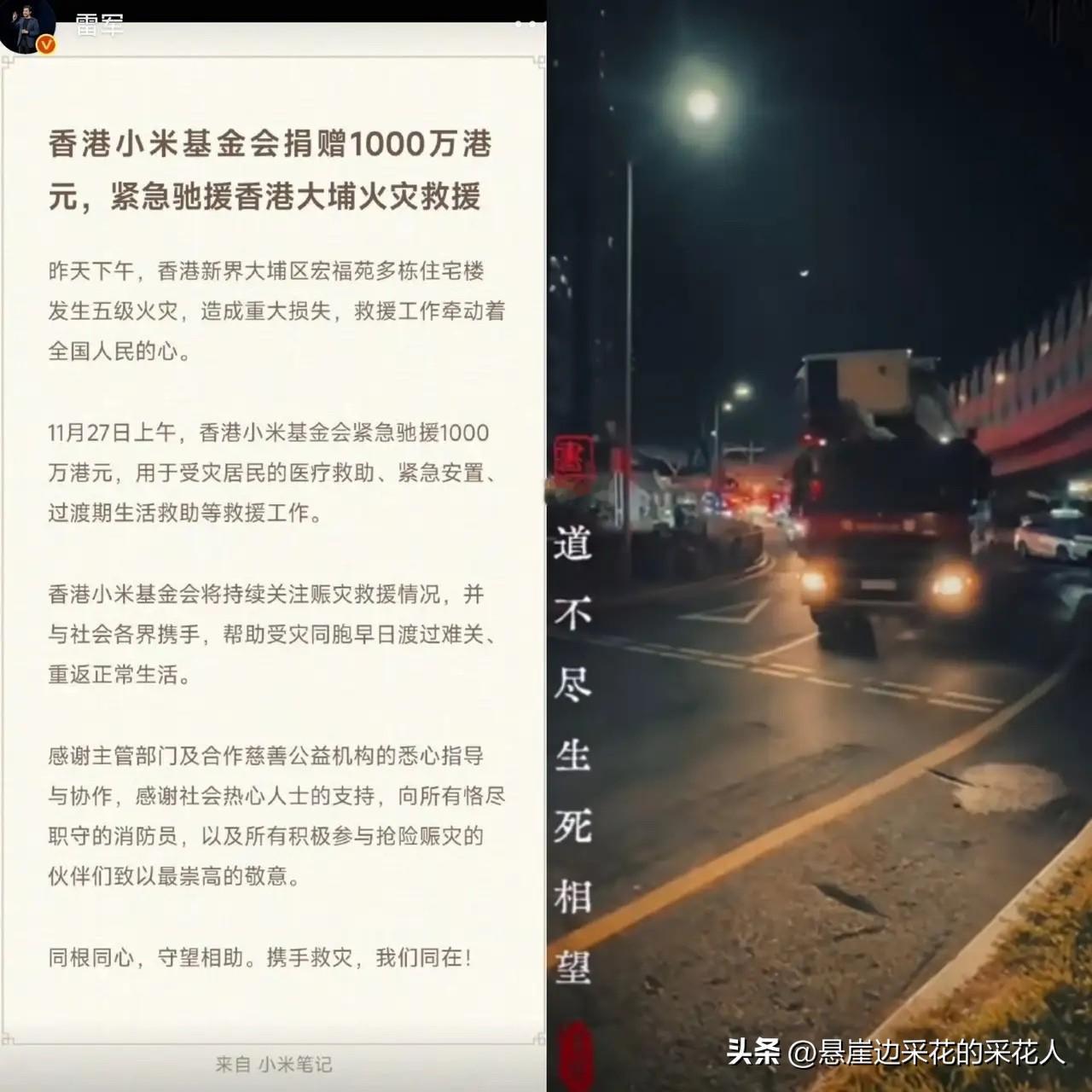 我最佩服雷军这份担当,11月26日香港大埔宏福苑突发大火,灾情严重,27号一早他就带领香港小米基金会捐了1000万港元,专门帮受灾居民治病、找临时住处、解决生活急需。紧接着腾讯、阿里、字节跳动等内地企业也纷纷出手,每家捐1000万到2000万港元不等,阿里还直接送了食物、被褥等物资;香港本地的周大福、李兆基基金等也捐了几千万,现金、防寒用品都有,中国红十字会也伸了援手,到27号下午十多家企业共捐超2亿港元,深圳市民还连夜送御寒物资支援。 这场大火让不少人无家可归,看到男孩不停给父母打电话却无人接的视频,实在揪心。以前内陆有难时香港同胞帮过我们,如今双向奔赴太暖心,中华儿女本就是一家人,心往一处想、劲往一处使,再大的坎都能迈过去。现在救援善后还在推进,相信香港很快能挺过来,受灾同胞也能早日回家。危难时刻的互帮互助,正是血脉相连的最好见证,这份温情太动人。