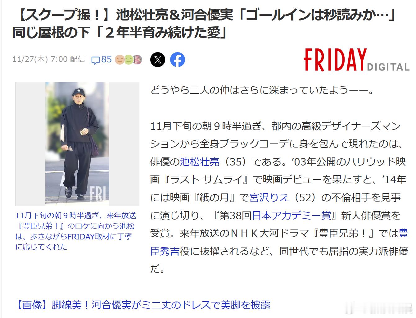 FRIDAY:池松壮亮&河合优实交往两年半,同居生活中。二人相识契机是2022年的电影《稍微想起一些》,2023年4月恋情曝光。