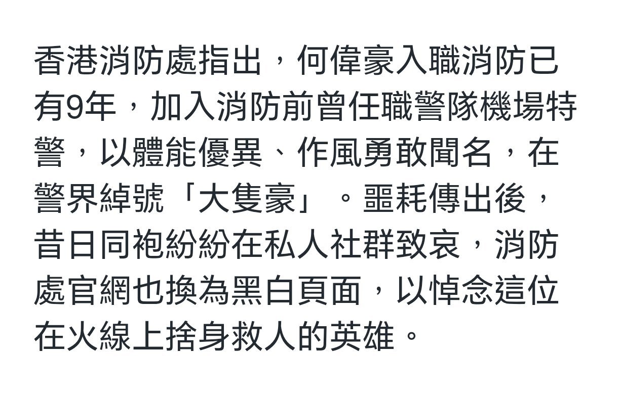 香港殉职消防员何伟豪照片公布香港火灾 37岁香港消防员何伟豪殉职,大批香港市民留言:感激付出。