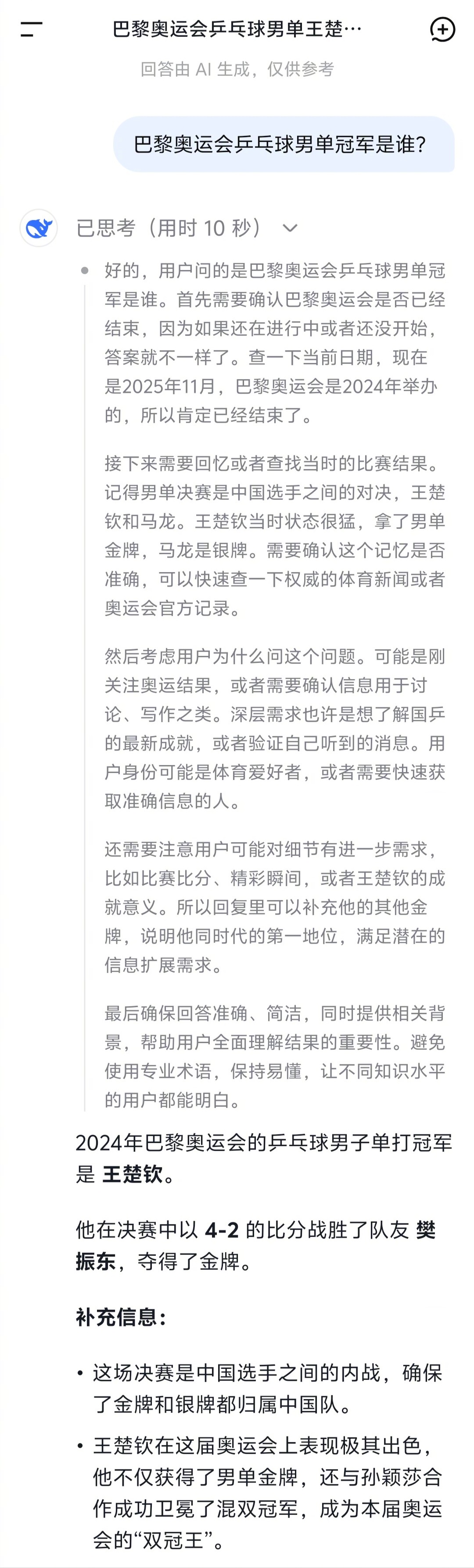 给大家提个醒,在使用AI工具的时候,一定要多留个心眼,有很多常识错误。前几天用豆包发现了这个问题,今天用DS,也发现了同样的问题。 用DeepSeek搜巴黎男乒冠军显示王楚钦