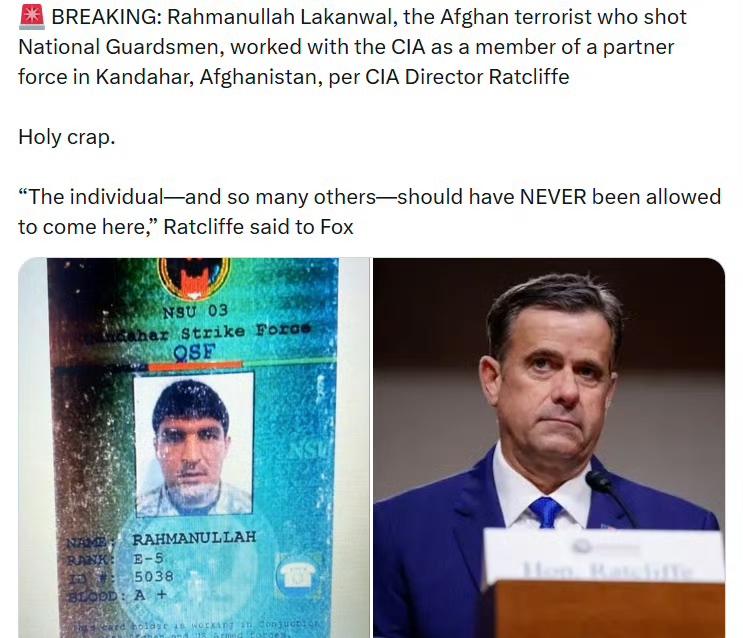 美中情局局长拉特克利夫表示,拉赫曼乌拉·拉坎瓦尔——这名枪击国民警卫队成员的阿富汗恐怖分子,曾作为合作部队成员在阿富汗坎大哈与中情局协作。 拉特克利夫在接受福克斯采访时说: “这个人——以及许多其他人——绝不应该被允许来到这里。” ​​​