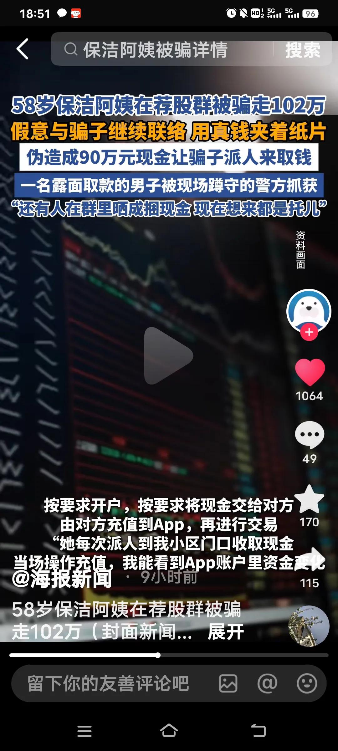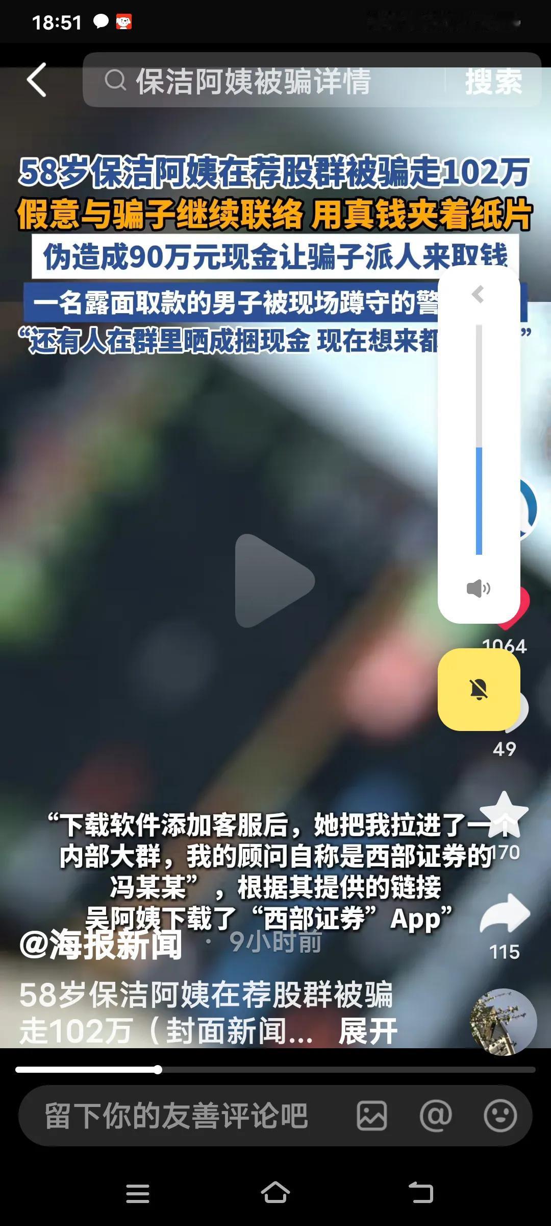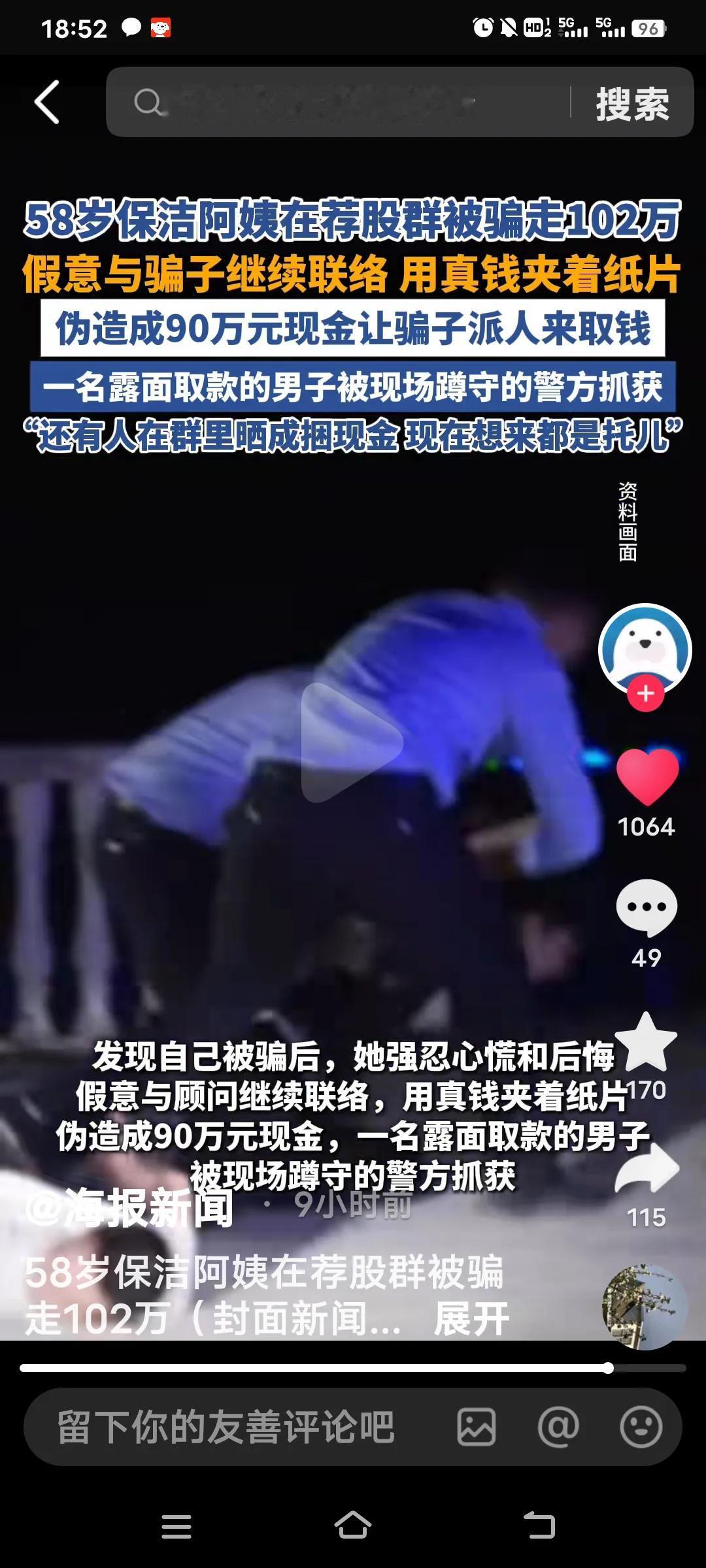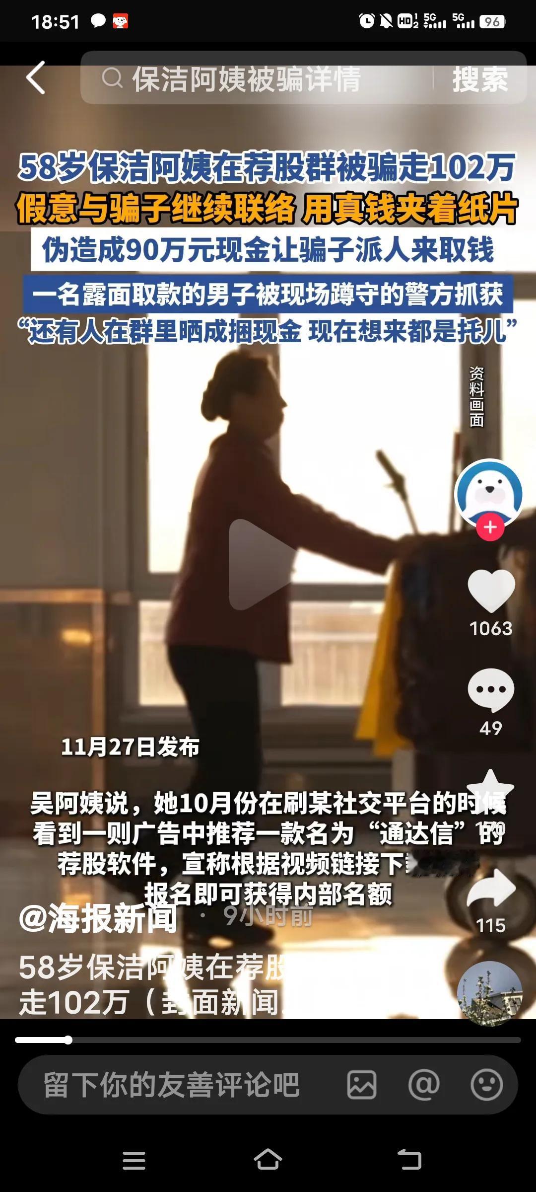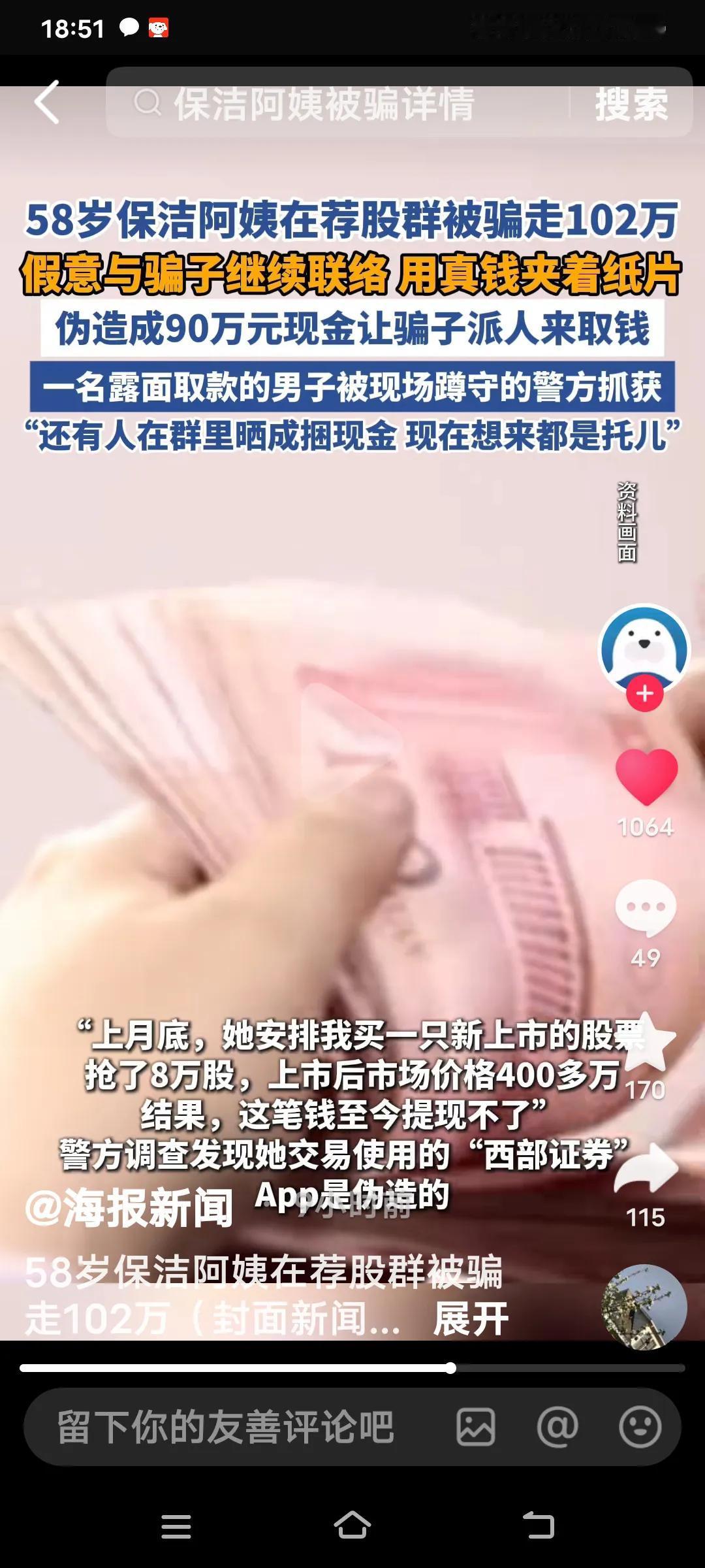 58岁的保洁员吴阿姨,10月份,她刷社交平台时,被“通达信”荐股软件广告吸引。下载软件并添加客服后,她被拉进一个上千人的荐股群。群里每天有人讲课、晒涨停图,还为群成员分配“官方顾问”。顾问自称是西部证券员工,工牌编号等信息都能对应上。 吴阿姨谨慎观察了一星期,小额投入看到涨势后,便将102万积蓄全部投了进去,上月底骗子安排她买了一只新上市的股票抢了8万股。上市后市场价格400多万,结果这笔钱至今也提现不了。 不过,吴阿姨十分机智,她强忍心痛,以“90万”为诱饵,于11月21日晚诱骗上门收取“服务费”的骗子现身,并迅速报警将其抓获。11月26日,她便重操保洁旧业。这些骗子实在可恶,大家一定要警惕这种荐股骗局! 说起来,吴阿姨确实不一般,不仅有不少积蓄,还敢在网上炒股。哪有那么容易赚的钱啊,辛辛苦苦挣的钱不好好存着,却在网上随意操作。 要不是她及时报警,可就欲哭无泪了。网络可不是那么好涉足的,这次也让她长了记性,买了个教训。大家千万记住,这种时候,哪怕有人让你借钱都不能借。 对炒股有兴趣 炒股老手 炒股中年女人