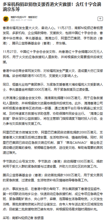 【#多家机构捐款捐物支援香港火灾救援#!含红十字会滴滴京东等】香港宏福苑发生重大火灾,牵动人心。11月27日,南都N视频记者梳理发现,多家机构、企业捐款捐物,支援救灾,包括中国红十字会总会、香港中华总商会、李兆基基金、滴滴出行、阿里巴巴集团、字节跳动(香港)、腾讯公益慈善基金会(香港)、京东等。11月27日,中国红十字会总会发文称,向香港红十字会捐赠200万元人民币,用于火灾的应急救援和人道救助,并将根据救灾需要提供后续支援。香港中华总商会官网发文称,对宏福苑发生严重火灾,造成重大伤亡深感哀痛。该会将捐款港币100万元,支援受火灾影响人士。同日,恒基兆业地产集团表示,为紧急支援香港大埔宏福苑火灾受影响人士,李兆基基金将捐款3000万港元,用于紧急救援及过渡安置。北京滴滴公益基金会发文称,滴滴首批捐赠1000万港元,用于应急救援和人道救助,并将根据救灾进展持续提供后续支持。此外,滴滴香港公司将积极配合香港特区政府统一部署,通过滴滴平台引导车辆避让受灾区域,及时传递官方救援与求助信息,协助保障市民安全出行。“滴滴公益救援”联合深圳公益救援队,将在主管部门指挥调度下随时投入行动,全力参与灾后救援与支援工作。