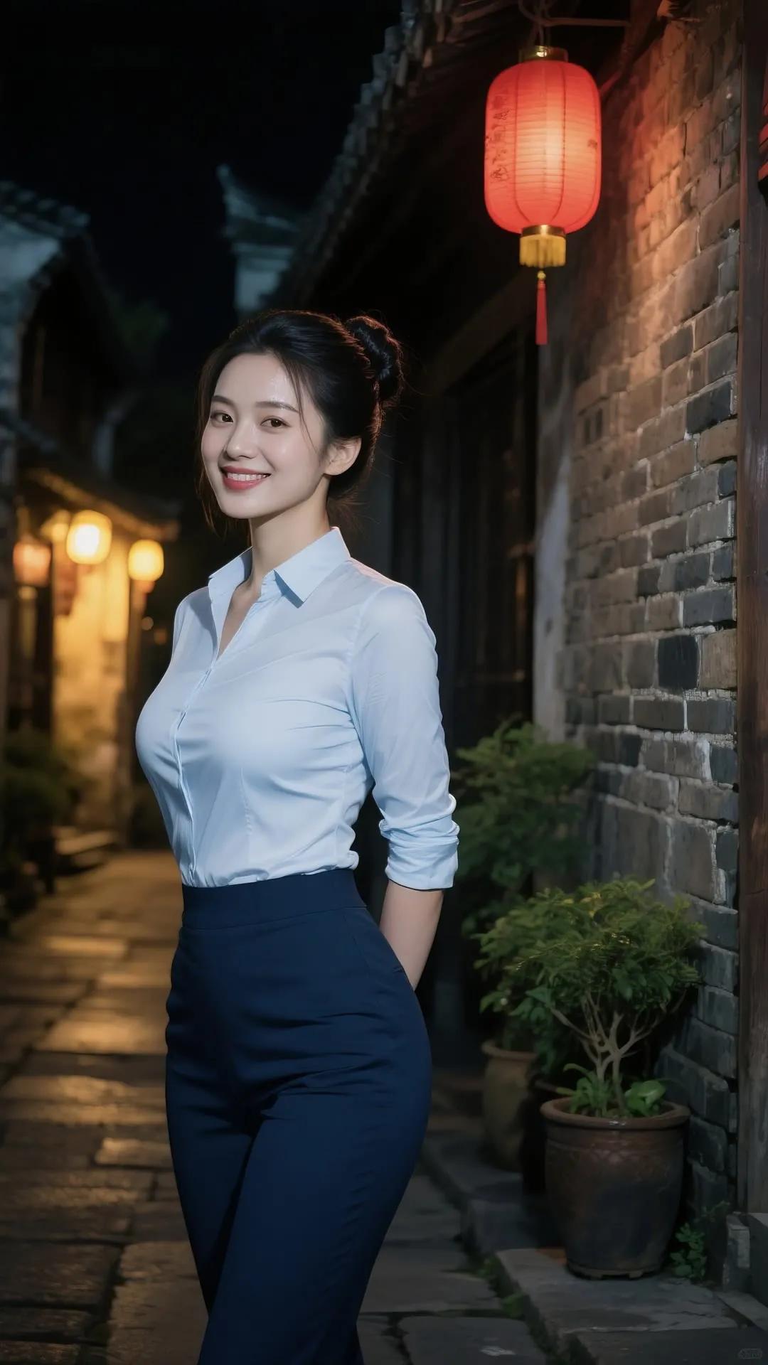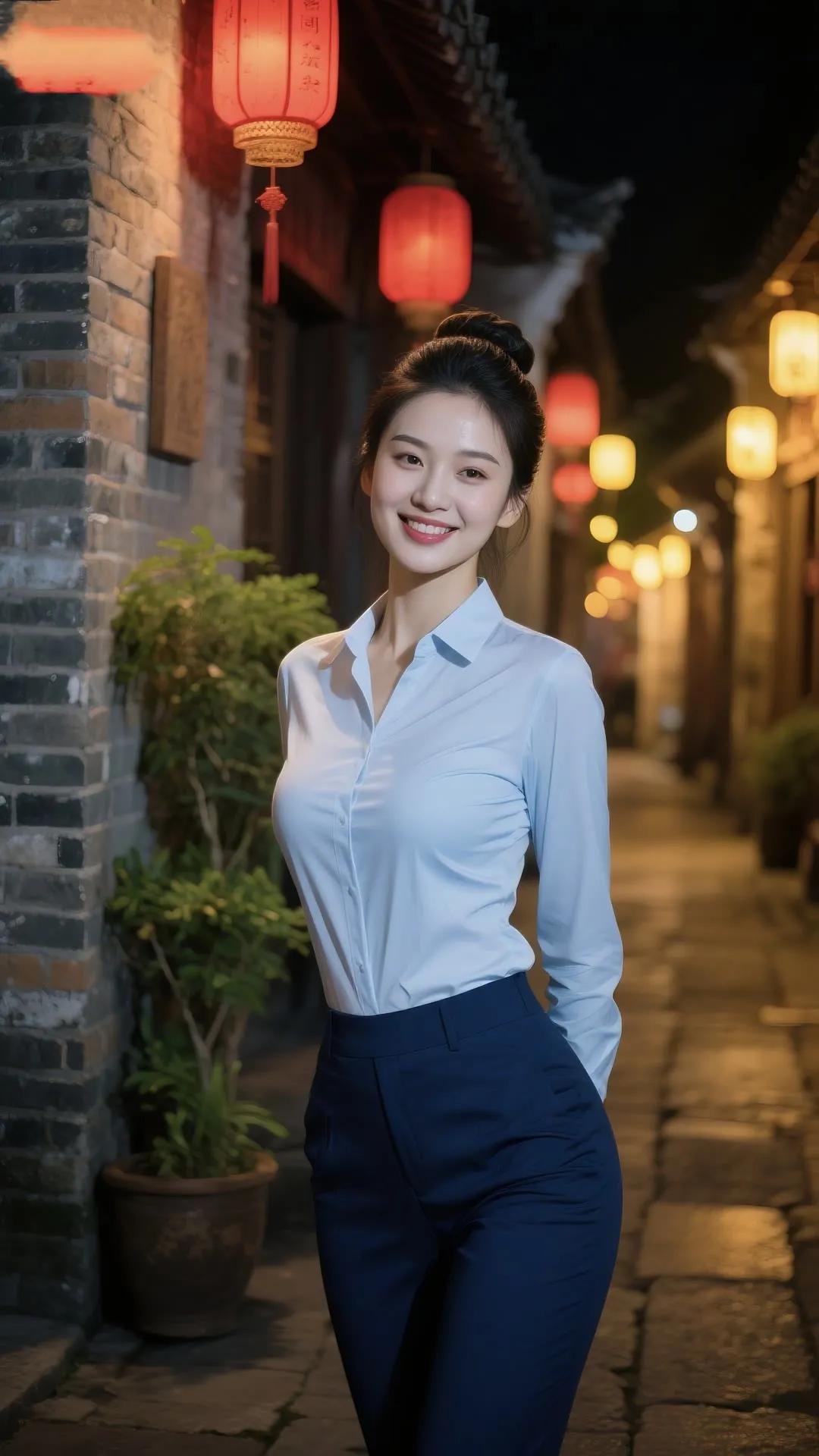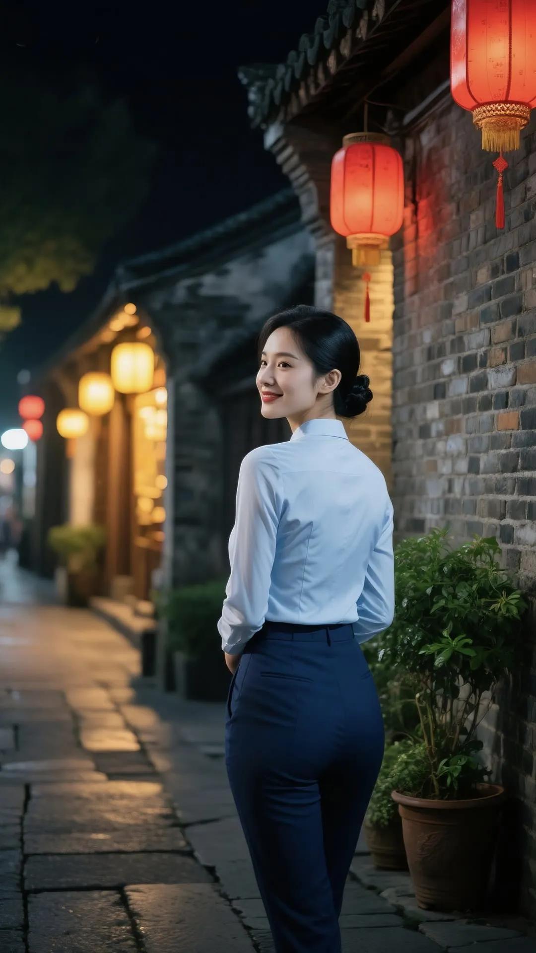夜色中的古风街巷,红灯笼映照下,她微笑着,优雅动人。
