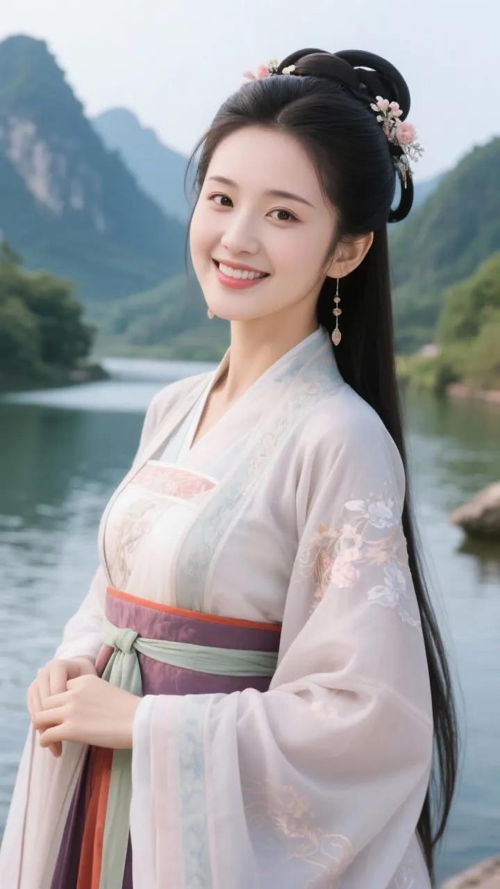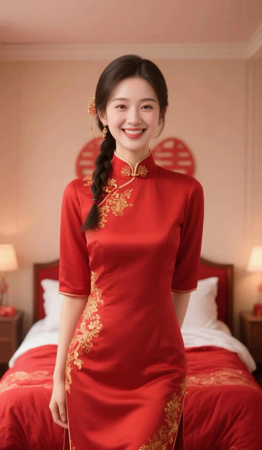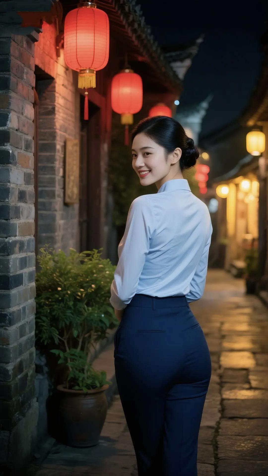夜色中的古风街巷,红灯笼映照下,她微笑着,优雅动人。