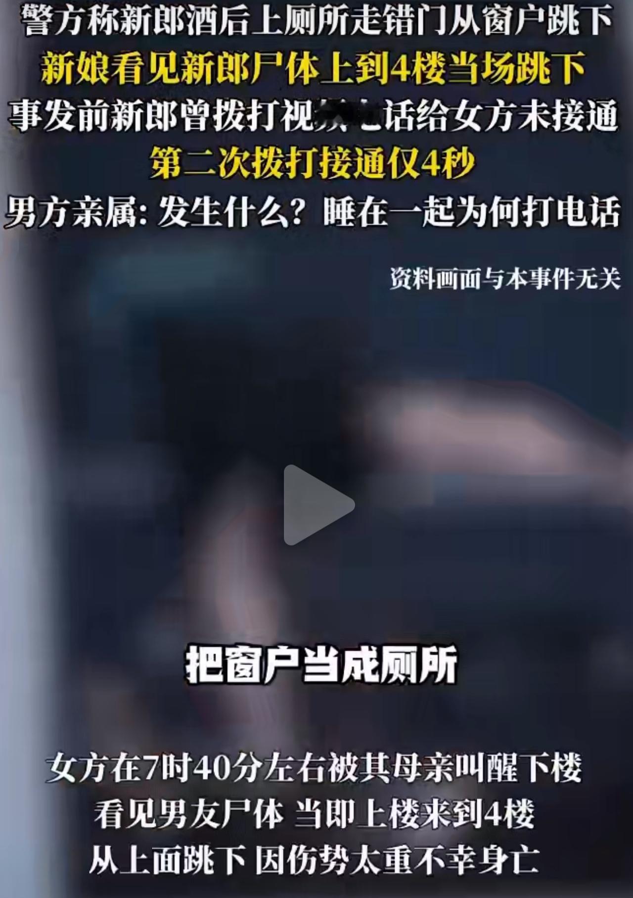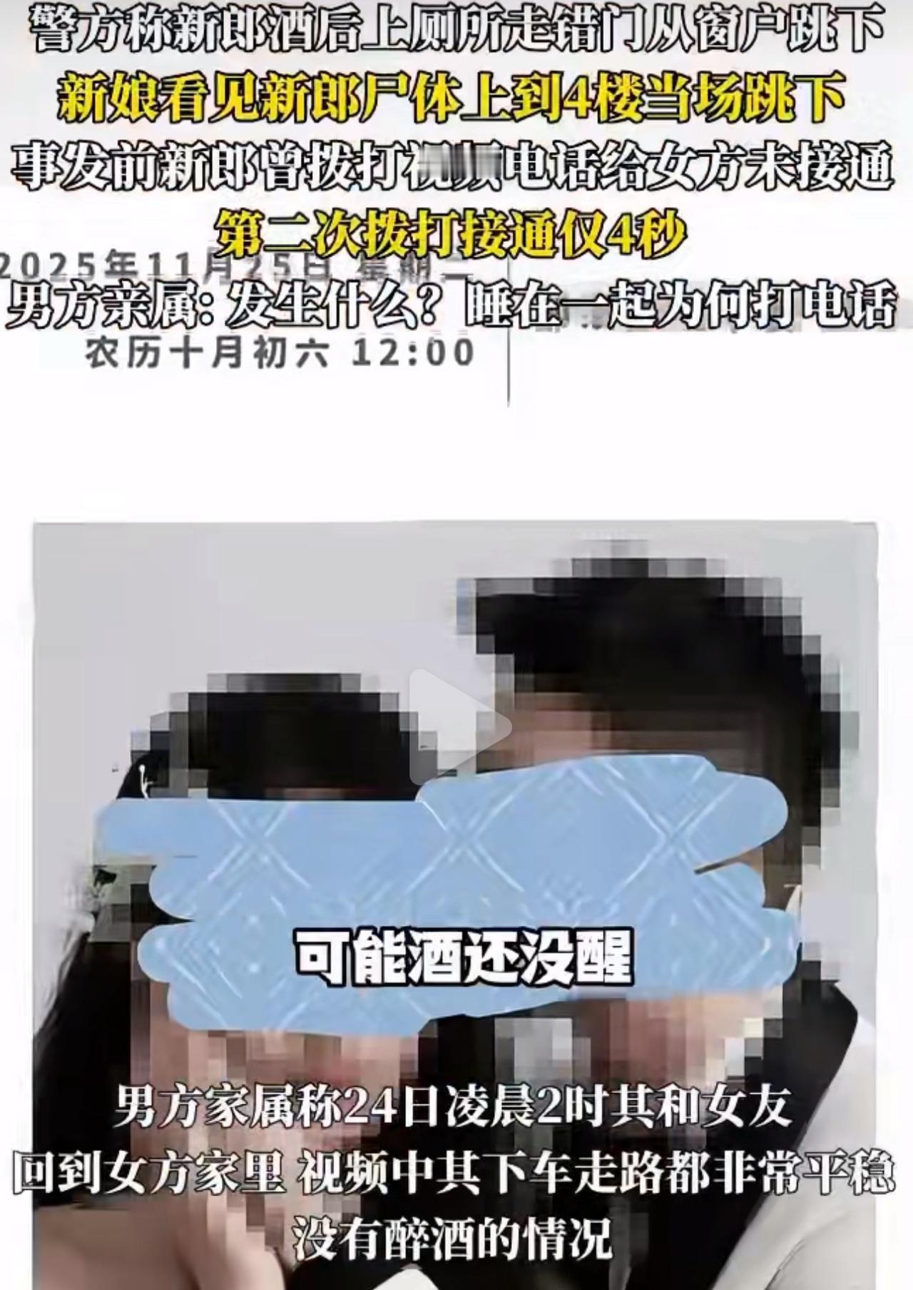 湖南双峰这对小情侣,处了五六年,一起开早餐店,日子过得踏踏实实的,有车有房没贷款,感情一直好好的,双方家里也都挺支持,11月25号的婚礼都准备妥当了。可谁能料到啊,11月23号晚上俩人就想着婚前跟朋友聚聚,吃点饭喝点小酒,回了女方家之后,好好的一桩喜事,就这么变成了人命悲剧。 你看家属发的监控,新郎凌晨2点下车那会儿,走路溜得很,压根不像喝多了的样子。可警方初步说是“酒后意外坠楼”,这换谁家亲人能信啊?更让人犯嘀咕的是,24号大清早5点零4分,新郎连着给新娘打了俩视频,头一个没接通,第二个才4秒就挂了——俩人明明在一个屋里住着,大半夜的打啥视频啊?这4秒里头到底说了啥、出了啥事儿? 说实话,我越看心里越堵得慌,俩孩子好好的,眼瞅着就要成家过日子了,咋就一夜之间说没就没了呢?没矛盾没外债,就这几个小时里,到底藏着啥不为人知的事儿?新娘发现新郎没了之后,当场就跑上楼跳了下去,是彻底绝望了,还是知道些啥不敢说? 现在警方还在查,也没说是不是涉及刑事案件。只希望能查得明明白白,把所有真相都还原出来,给逝去的俩孩子、给盼着婚礼的家属,一个实打实的交代,别让这场没办成的婚礼,变成一辈子的遗憾。结婚前一天新郎新娘先后坠亡 结婚当天 酒后意外