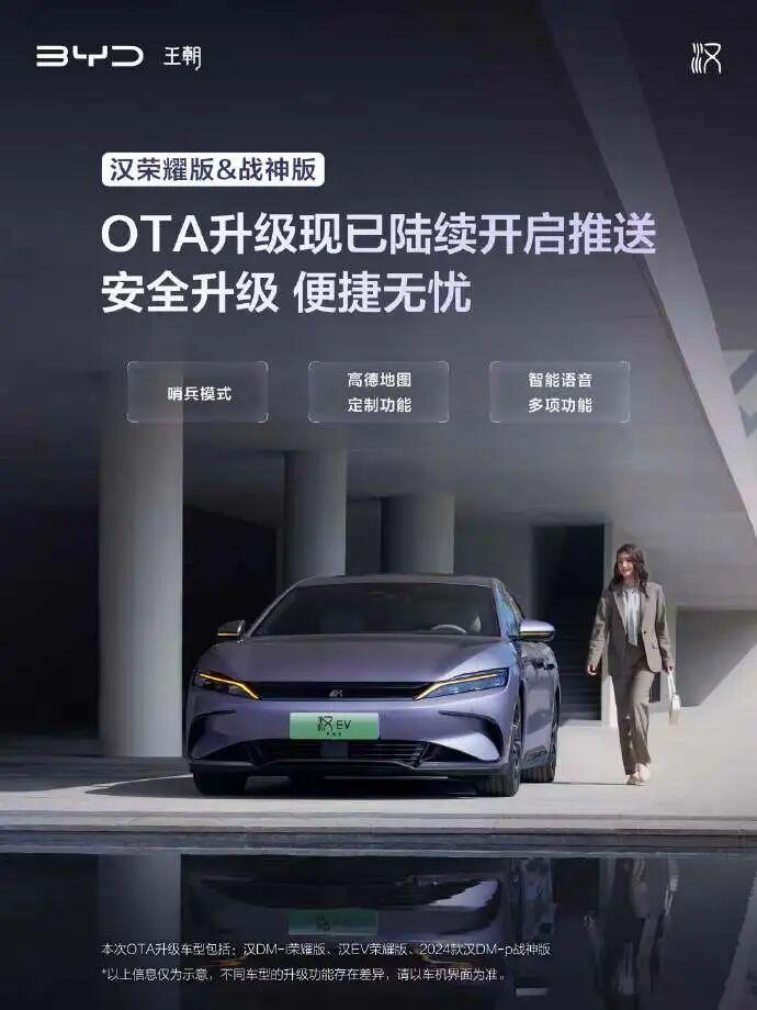 比亚迪汉老车主终于等来OTA:哨兵模式、高德定制,还有智能语音汉荣耀版战神版 不容易啊,汉DM-i荣耀版、汉EV荣耀版,2024款汉DM-p战神版迎来了OTA升级,新增了哨兵模式、高德地图定制功能,还有智能语音等多项功能。 之前就有很多车主抱怨自己的老汉被遗忘了,其实OTA更新一直都在进行,只不过与最新款比起来还是慢了点。 但是,今年以来比亚迪的更新明显快了很多。2023款汉冠军版的也别急,更新也在路上。另外普及TBC高速爆胎稳行系统,也都在计划范围内。 值得一提的是,哨兵模式、千里眼更新了之后,也要观察电耗问题哈。个人经验,哨兵模式还是挺费电的,最好是根据需要开启。