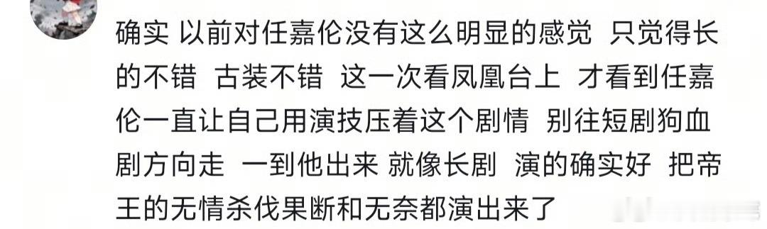 很同意这个路人的观点,《凤凰台上》任嘉伦一直在用演技压着剧情。他饰演的萧焕,将帝王的无情、果断与无奈演得极具质感,兼具了短剧的爽感与长剧的深度」会不自觉的跟着他进入剧情带入角色,任嘉伦的萧焕演得非常出色!