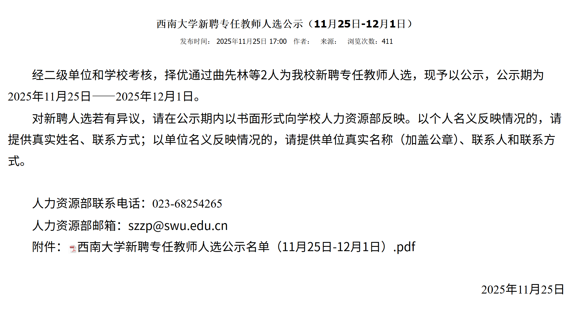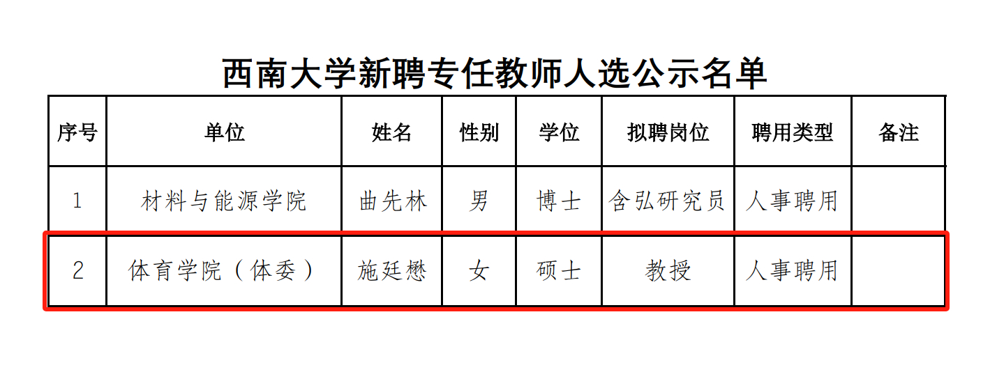 【#奥运4金施廷懋拟聘西南大学教授#,校方回应:招聘方式为人才引进】#西南大学回应拟聘施廷懋为教授# 11月25日,西南大学官网发布新聘专任教师人选公示,其中一名人选为施廷懋。11月27日,大皖新闻记者从西南大学体育学院办公室获悉,这名新聘专任教师人选正是我国著名跳水运动员、奥运冠军施廷懋。西南大学人力资源部相关工作人员同步透露,施廷懋的招聘方式为人才引进。《西南大学新聘专任教师人选公示》信息显示,施廷懋为硕士学位,受聘单位为西南大学体育学院(体委),拟聘岗位为教授,聘用类型为“人事聘用”。施廷懋经二级单位和学校考核,择优成为西南大学新聘专任教师人选,目前仍处于公示阶段,公示期为2025年11月25日至2025年12月1日。11月27日,西南大学体育学院办公室工作人员告诉大皖新闻记者,施廷懋是奥运冠军,目前正处于聘用公示阶段,关于其招聘的相关工作合理合规,等正式办理入职之后才会考虑其具体教学内容。同时,大皖新闻记者也采访了负责此次招聘工作的西南大学人力资源部,相关工作人员告诉记者,此次招聘工作程序由学院提出,学校层面负责把关,“施廷懋属于人才引进,作为高校教师的义务,理论上都是要带学生的。”公开信息显示,施廷懋曾在2016里约、2020东京两届奥运会包揽女子三米板单人和双人金牌,累计斩获4枚奥运金牌、7个世锦赛冠军,是跳水项目“大满贯”选手,还曾连续六年获评国际泳联最佳女子跳水运动员。2022年,她从运动员转型为中国跳水队助理教练,指导队员拿下世锦赛冠军。作为重庆本土培养的运动员,施廷懋早年便在西南大学完成了本科到硕士的学业。此次以教授身份回归母校,是其从运动员到教练、再到高校教师的又一次职业转型。西南大学相关公示未披露具体教学方向,但业内推测,施廷懋的实践履历将为体育学院的训练学、运动心理等学科带来实践资源。目前公示期尚未结束,若顺利通过,施廷懋将成为西南大学体育学院师资队伍中的“新力量”,也为退役运动员转型高校教育提供了又一案例。(大皖新闻记者 殷志强 实习生 周明远)网页链接