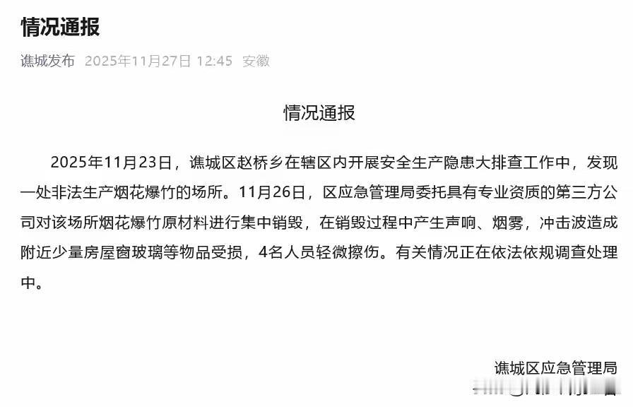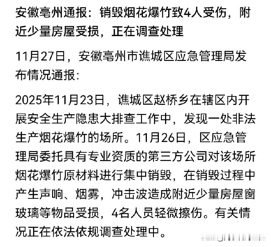 这个也说安徽某地爆炸了,那个也说爆炸了,不知道的还以为怎么回事呢,现在官方通告已经出来啦! 原来是亳州市谯城区发现一家非法烟花爆竹公司,区应急管理局委托有资质的第三方,在集中销毁烟花爆竹过程中,产生了“声响、烟雾、冲击波”,仅有4人轻微擦伤,不是大家口中传的爆炸,总的来说没啥事! 注意,是“声响、烟雾和冲击波”,仅此! 网络谣言不可信,大家不信谣不传谣! 要我说,这第三方虽有资质,可能技术还不够成熟,这种具有危险性的活,还是要把安全做好啊!