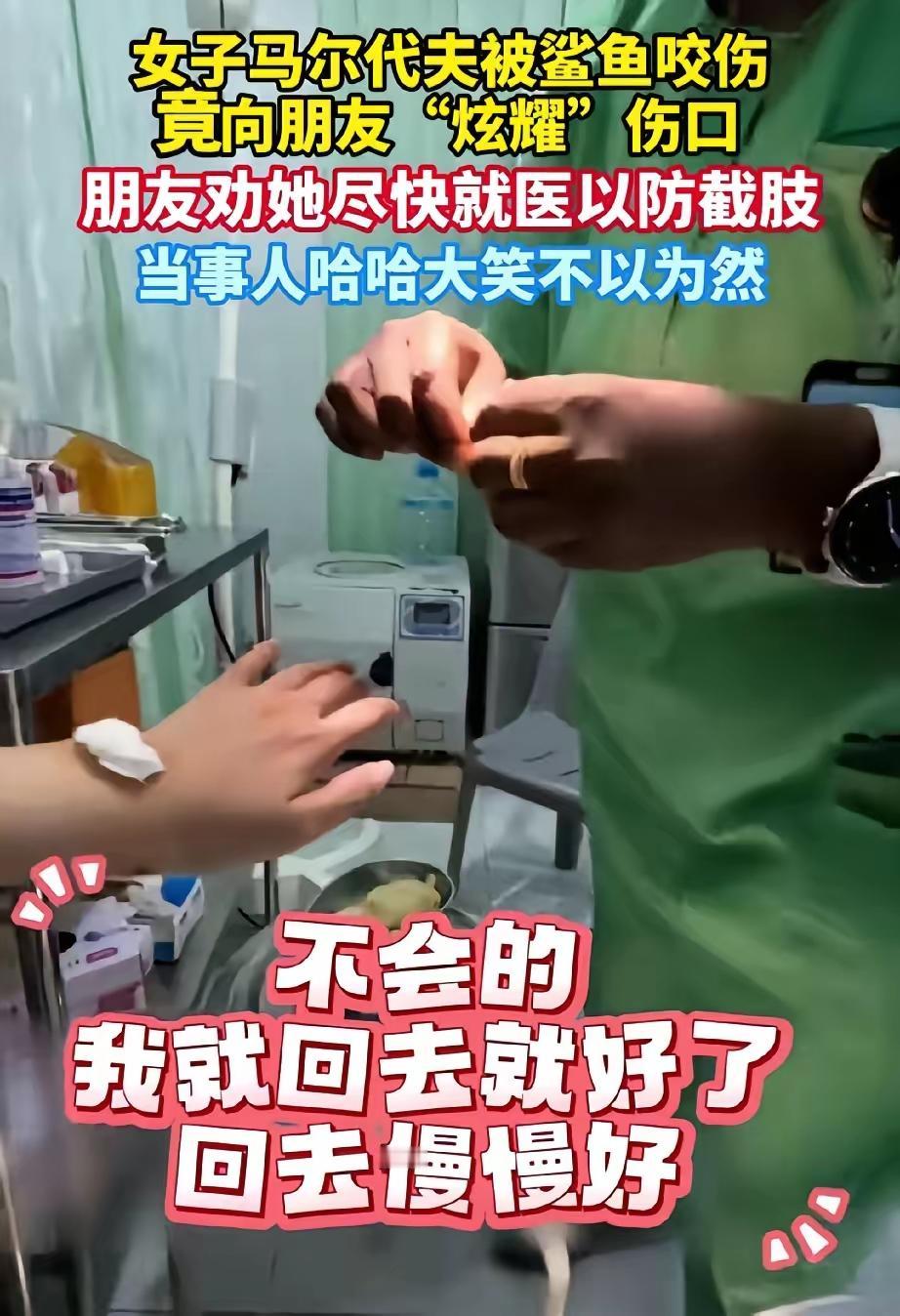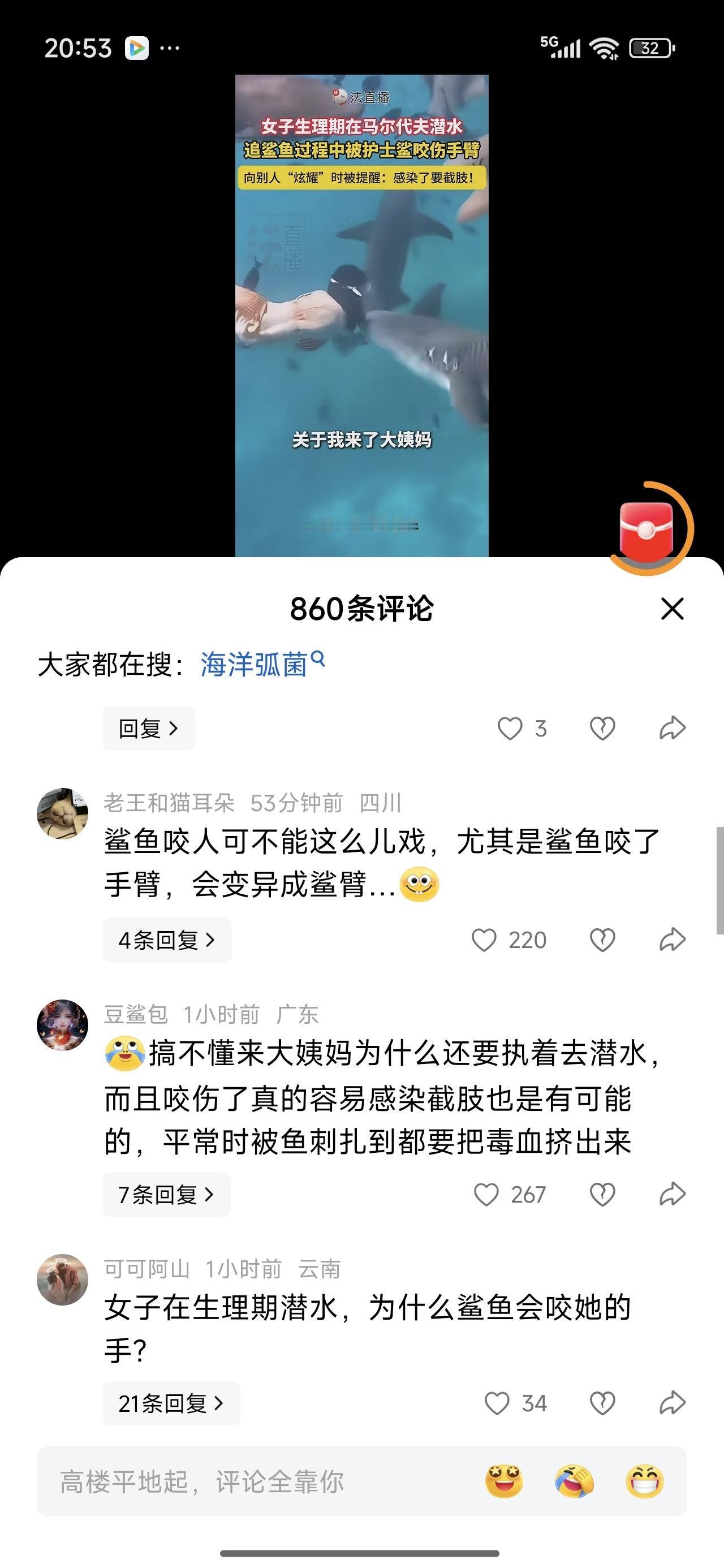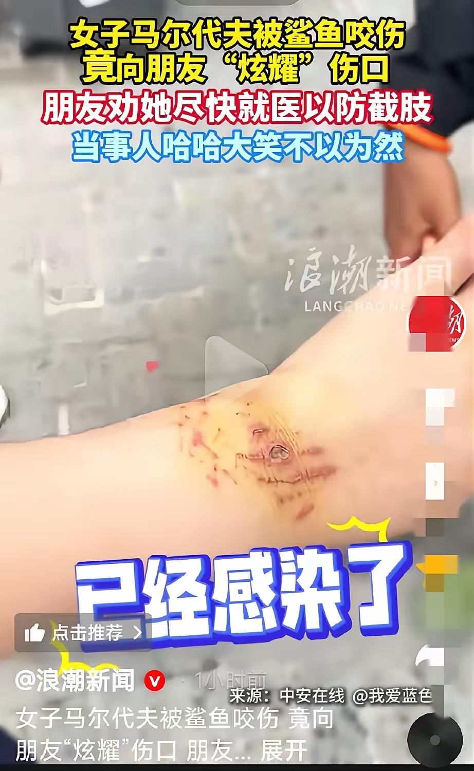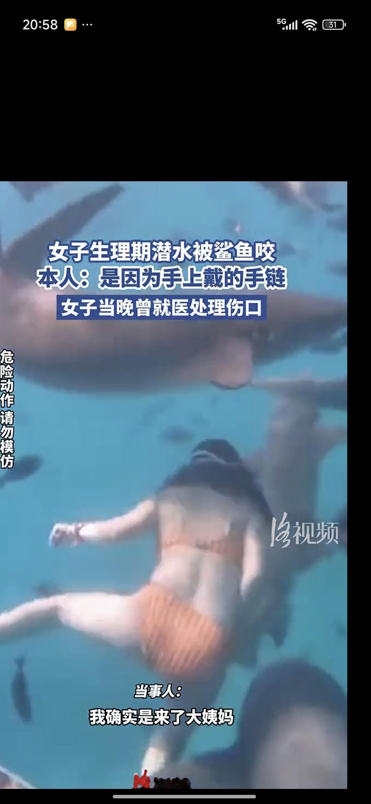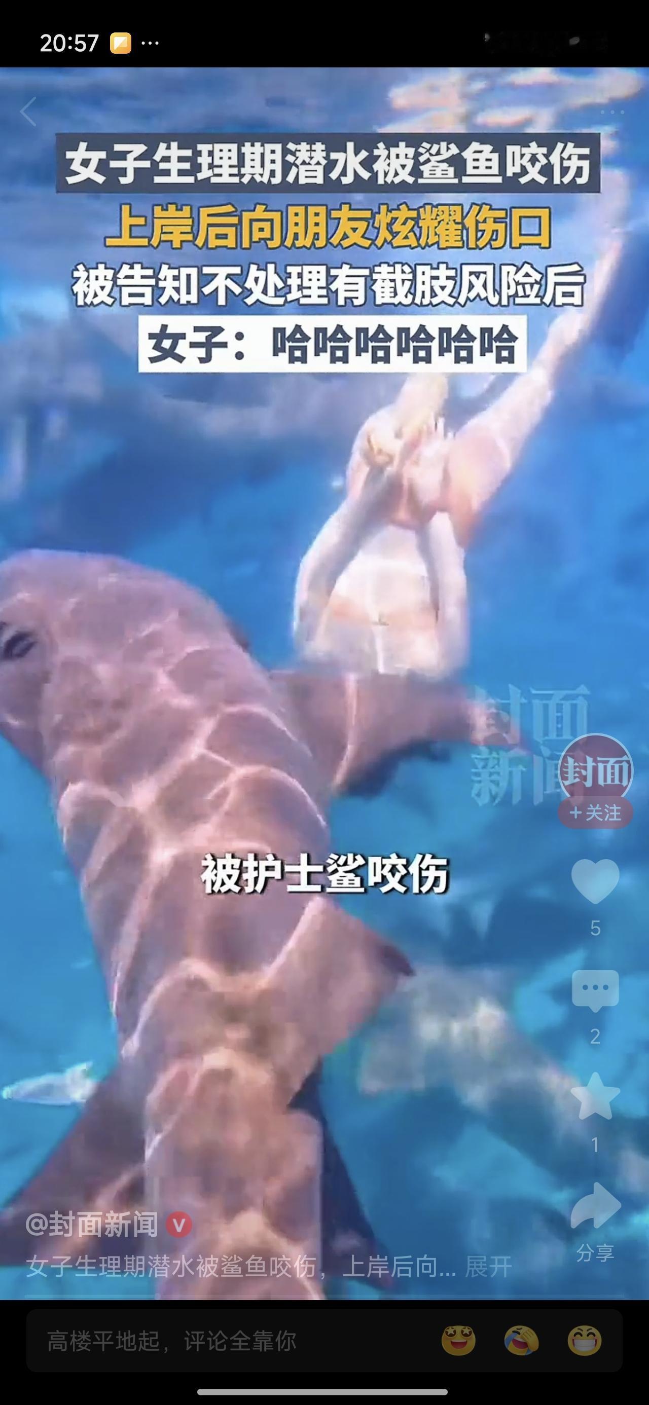 来大姨妈下水潜水被鲨鱼咬!炫耀伤口?面对别人的好言相劝,对方说会截肢的,她还哈哈大笑。事后她澄清,确实来了大姨妈,但大姨妈没漏出来! 是怎么活到这么大的?鲨鱼闻到了腥味才追的她吧!还用漏出来吗? 天啊,以后少推这种给我看吧!会被气晕的!