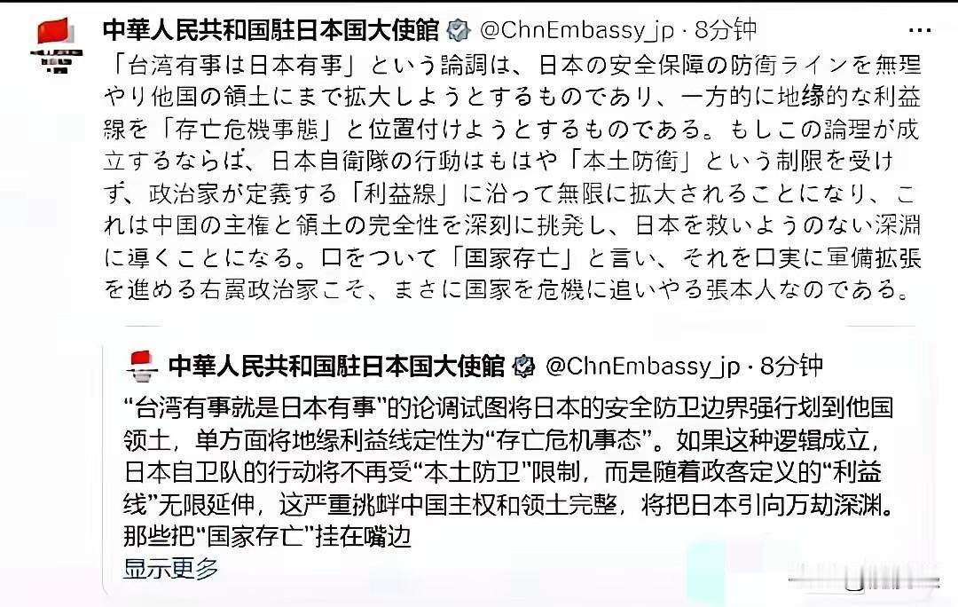 中国驻日本大使馆今天(11月27日)发文写道:“台湾有事就是日本有事”的论调试图将日本的安全防卫边界强行划到他国领土,单方面将地缘利益线定性为“存亡危机事态”。如果这种逻辑成立,日本自卫队的行动将不再受"本土防卫"限制,而是随着政客定义的“利益线”无限延伸,这严重挑衅中国主权和领土完整,将把日本引向万劫深渊。 简短评论一下:现在日本政客高市早苗还在胡搅蛮缠,玩文字游戏,避重就轻,故意忽略高市早苗发言的要害。这骗得了一般人,但是骗不了中国驻日本大使馆。日本对所谓“存亡危机事态”任意发挥,任意曲解,任意解释,将他国领土置于日本的安全防线之内。严重违反联合国宪章精神。严重侵犯他国主权和领土完整。 台湾是中国的台湾,不是日本的殖民地。如果日本再想干涉中国内政,侵犯中国的领土主权,将构成对中国的侵略,中国人民解放军不会答应,必将迎头痛击! 日本军事挑衅 中日外交争议 中方对日本态度 日本对华外交 中方正告日本 日本涉台动向 日本寻衅滋事 高市早苗 中国驻日本大使馆 中国台湾