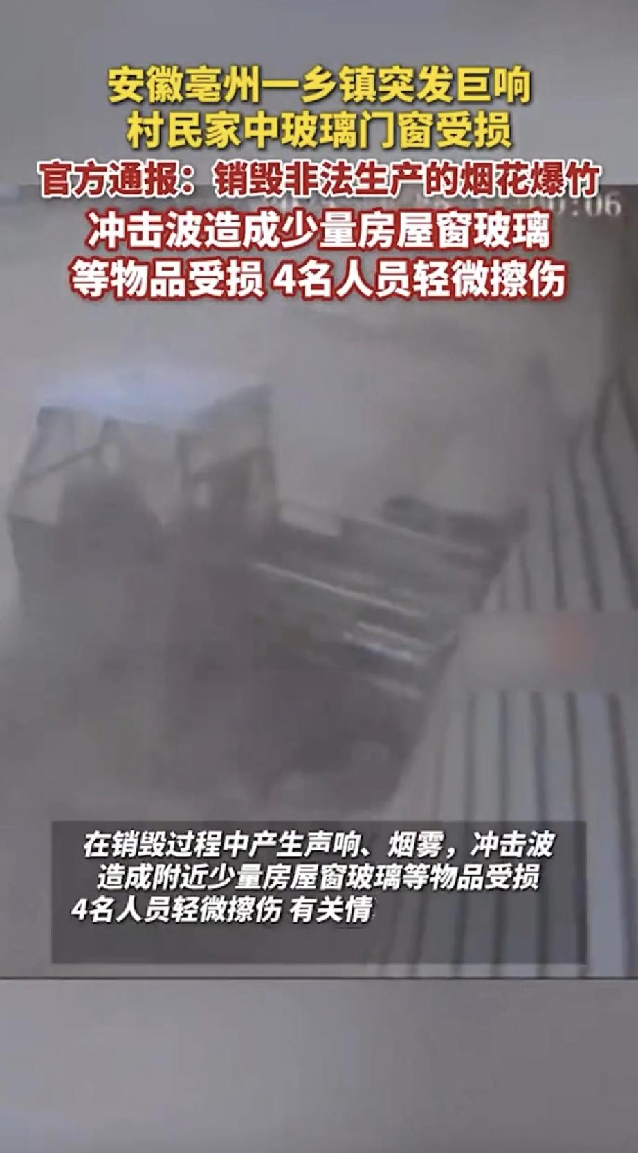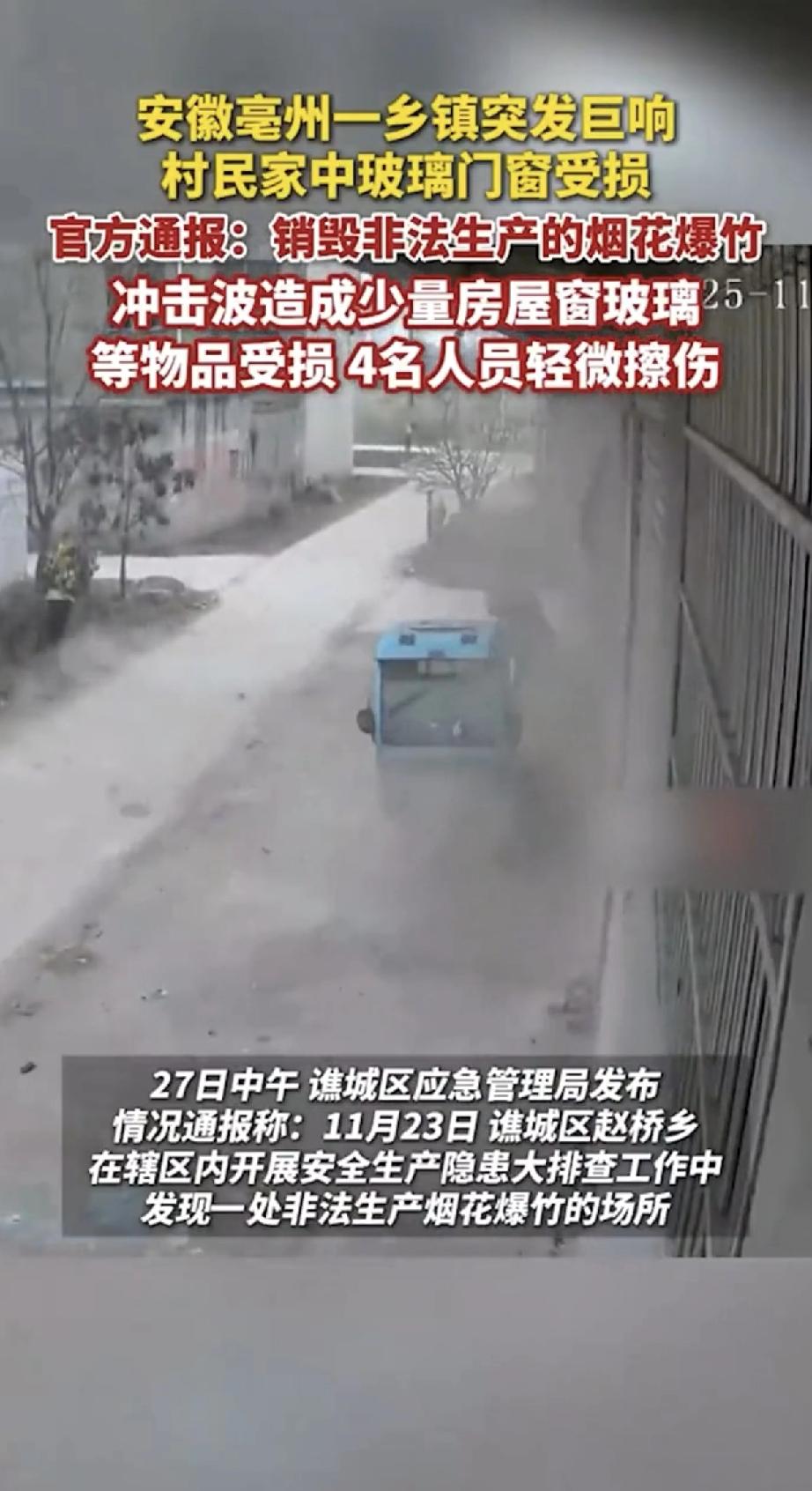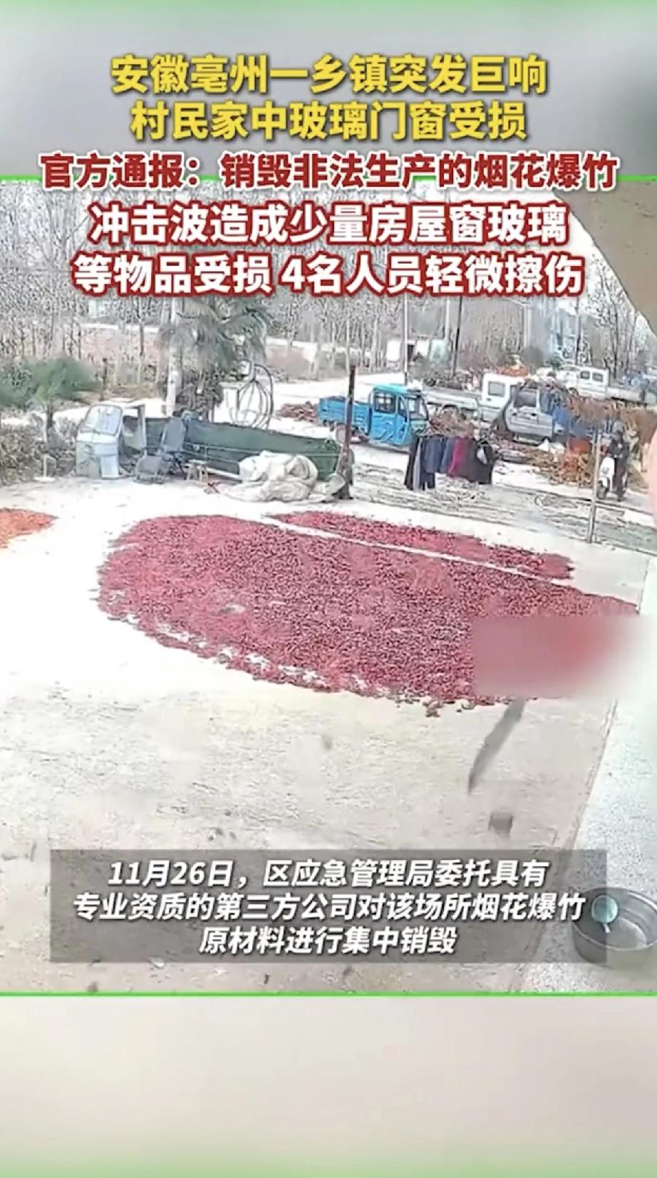 临近年关,想多制作烟花多卖点钱,结果爆炸了,整个安徽亳州这个村子都有震感,门窗玻璃都碎了,这件事情影响很大! 所以尤其烟花生产一定要安全,小作坊严禁生产,因为太过于危险,说好听是烟花,不好听就是炸药,这威力很大,不规范后果相当严重,希望全国不要进行燃放烟花爆竹了,除了污染环境和制作噪音外,没有什么价值,欢迎全国用其他方式取代烟花爆竹,这样城市农村更安全!
