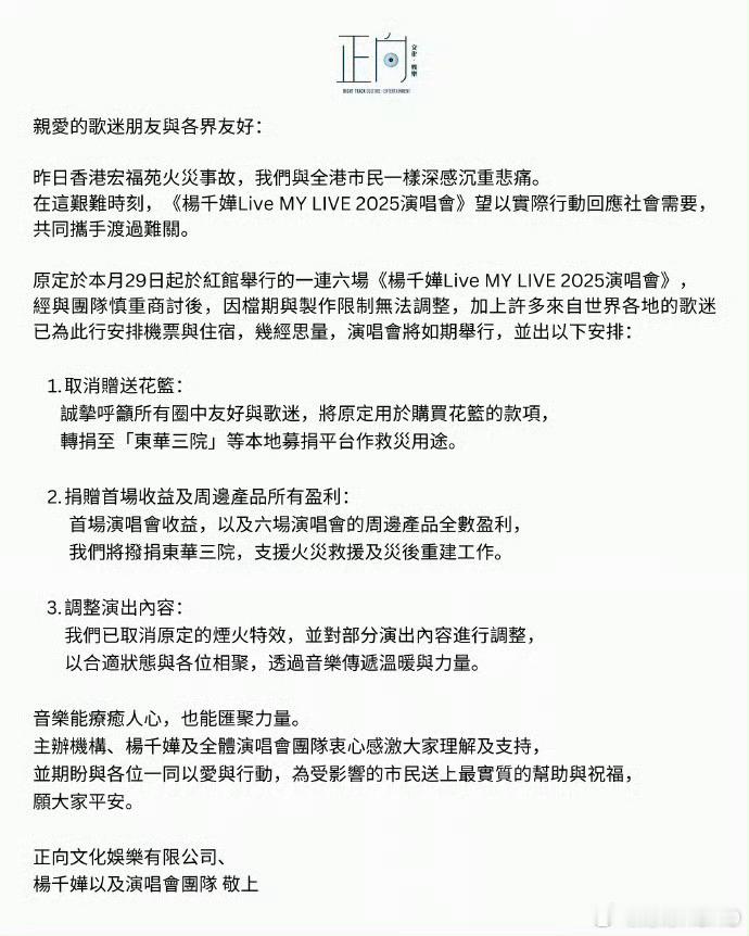 杨千嬅捐赠演唱会首场收益杨千嬅11月29日起在红馆一连六场的《杨千嬅 Live MY LIVE 2025 演唱会》将如期举行,并将首场演唱会的收益以及六场演唱会周边产品的全部盈利捐出,用于支援火灾救援及灾后重建工作。 多名艺人为香港捐款