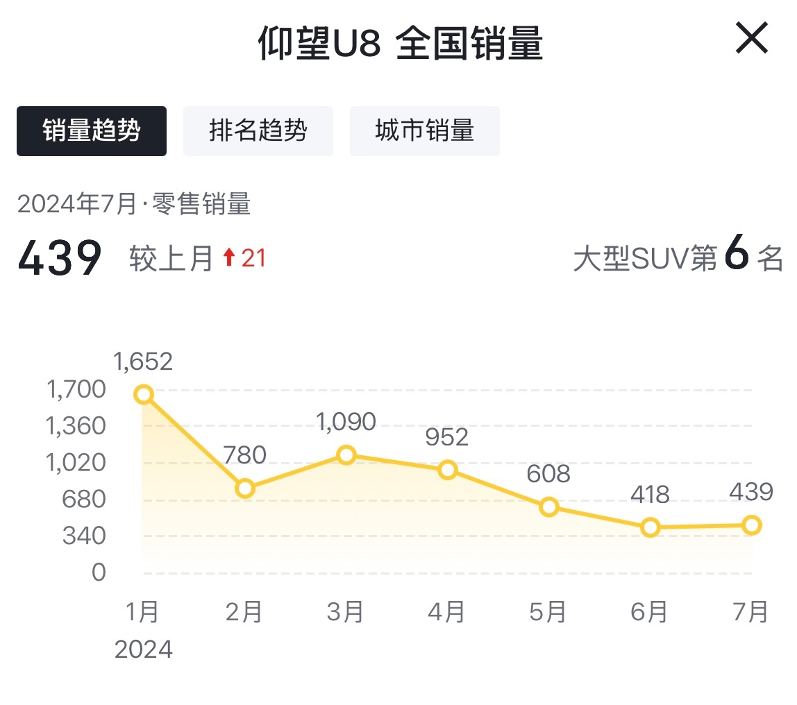 仰望U8的销量让人看不懂,2024年1月,销量超过1600辆,作为中国品牌百万级