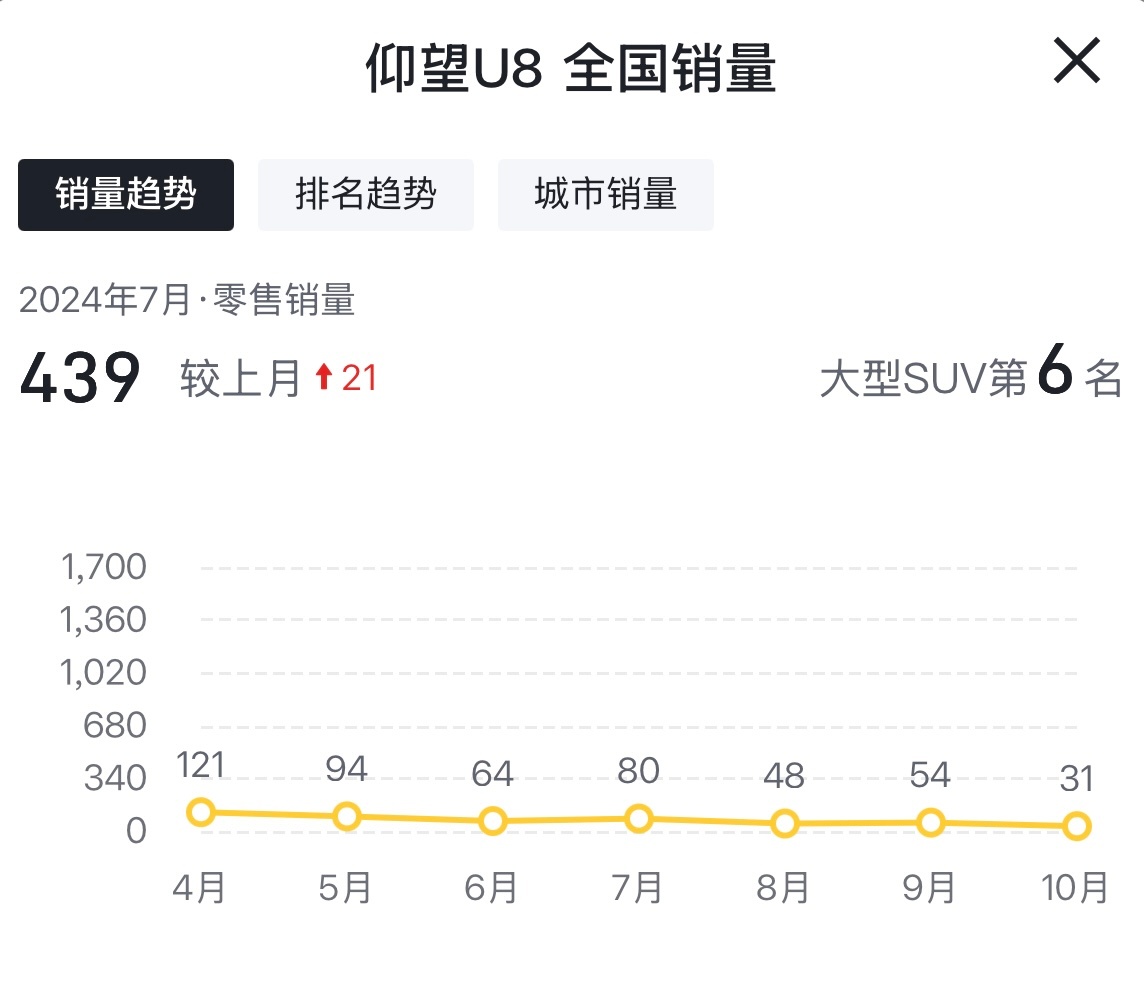 仰望U8的销量让人看不懂,2024年1月,销量超过1600辆,作为中国品牌百万级SUV,简直是让人自豪振奋。但此后就断崖式下跌,现在每月销量就只有几十台了。仰望U8L上市之前的很长时间里,U8销量都非常少,再说了,U8L偏豪华,U8偏户外,两者也不冲突,两款车的关系就跟揽胜和卫士。人家揽胜和卫士也没互相影响呀?为什么仰望U8突然就一蹶不振了?高端用户不够用了?