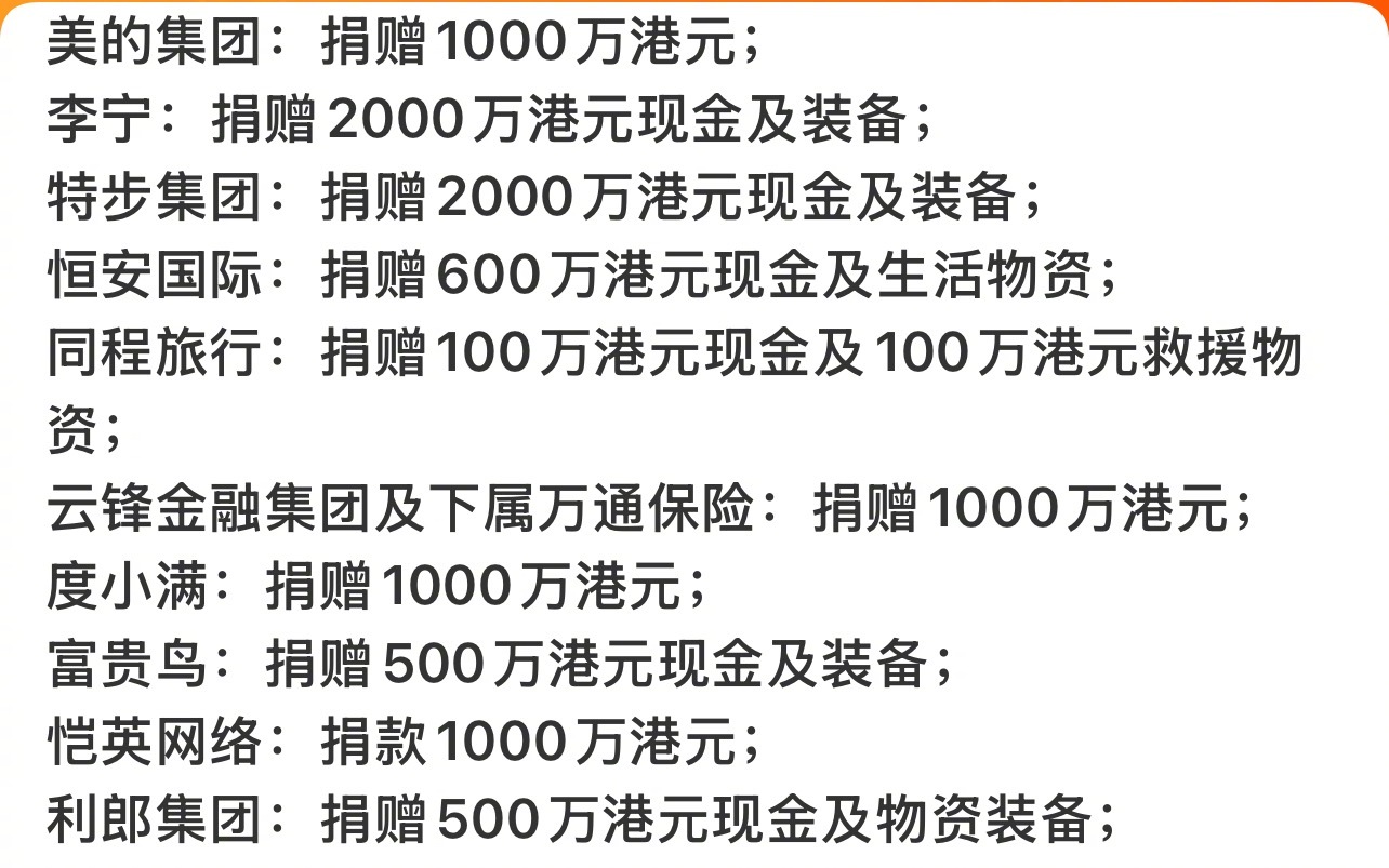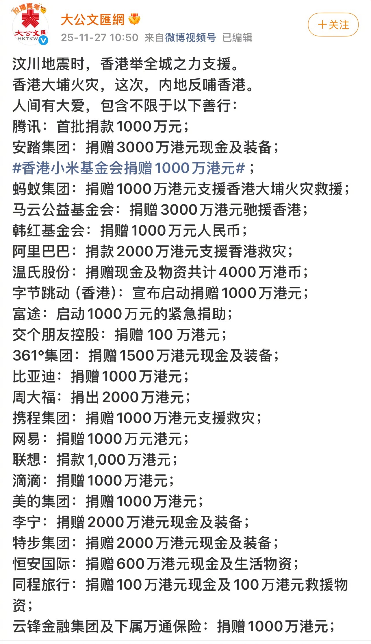 内地知名企业向港火灾受灾群众捐款 港媒报道:媒大埔宏福苑五级大火造成严重伤亡,全港各界纷纷伸出援手。陆续有多间大企业千万捐款。截至目前,包括李嘉诚基金会、李兆基基金、霍英东基金会、马云公益基金会等多个慈善机构及大型企业,已合共承诺捐出超过2.6亿港元善款及物资,支援受灾家庭渡过难关及协助社区重建。李嘉诚基金会宣布拨出8,000万港元,包括3,000万紧急援助及5,000万后续支援。李兆基基金、霍英东基金会及马云公益基金会亦各自捐出3,000万港元。阿里巴巴、腾讯、小米、周大福、信和集团等均捐出千万巨款。信和集团准备了160间酒店客房供有需要居民免费暂住。安踏、361度等体育品牌则捐出现金及防寒装备。富途证券除了启动1,000万港元的紧急捐助,作为“乐施毅行者2025”的首席赞助商,亦全力配合乐施会将“毅行者”所筹得的捐款及物资,用于支援救灾及相关援助工作。ps:大公文汇感恩内地支援,把内地企业的捐助报道的比较详细!!! 香港火灾已有75人遇难